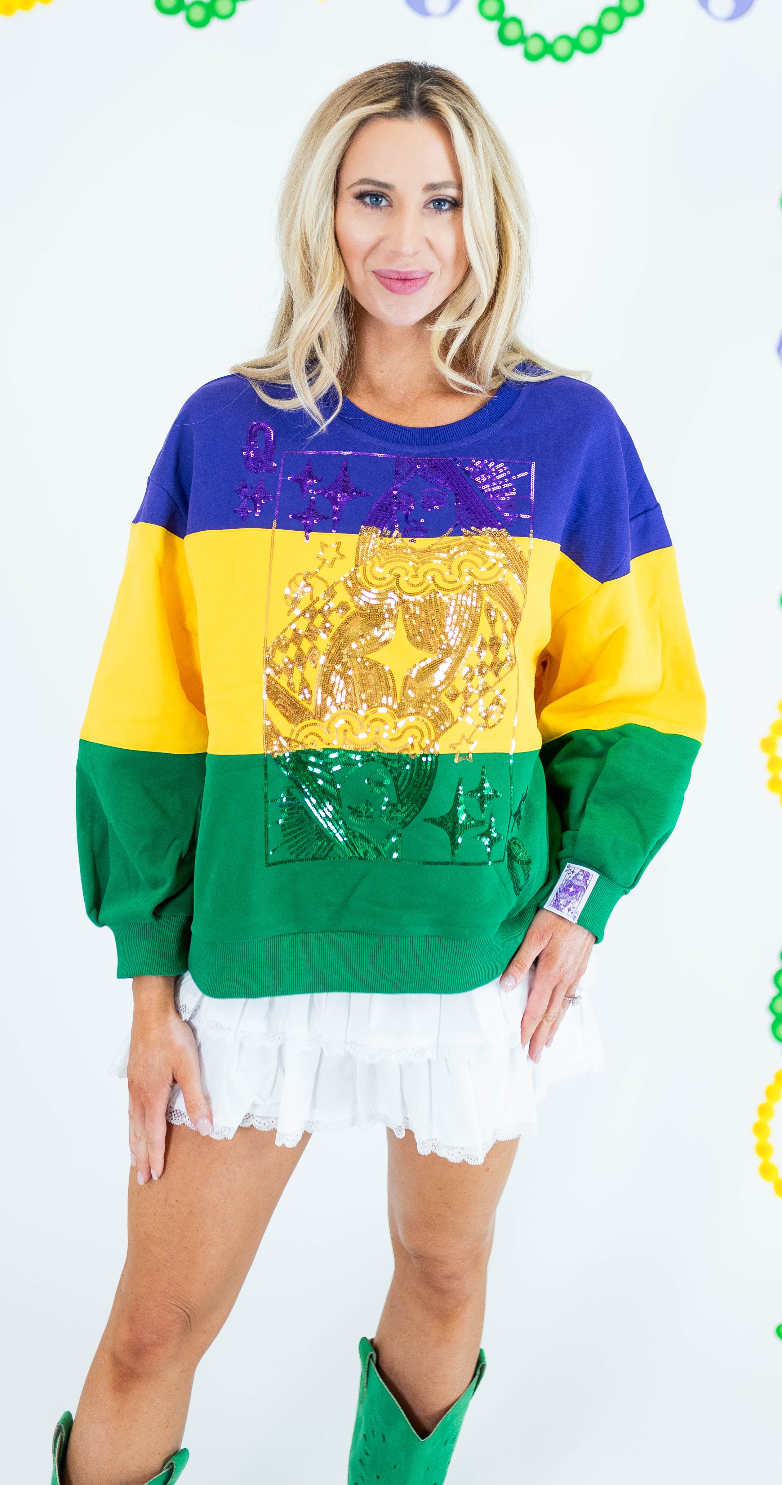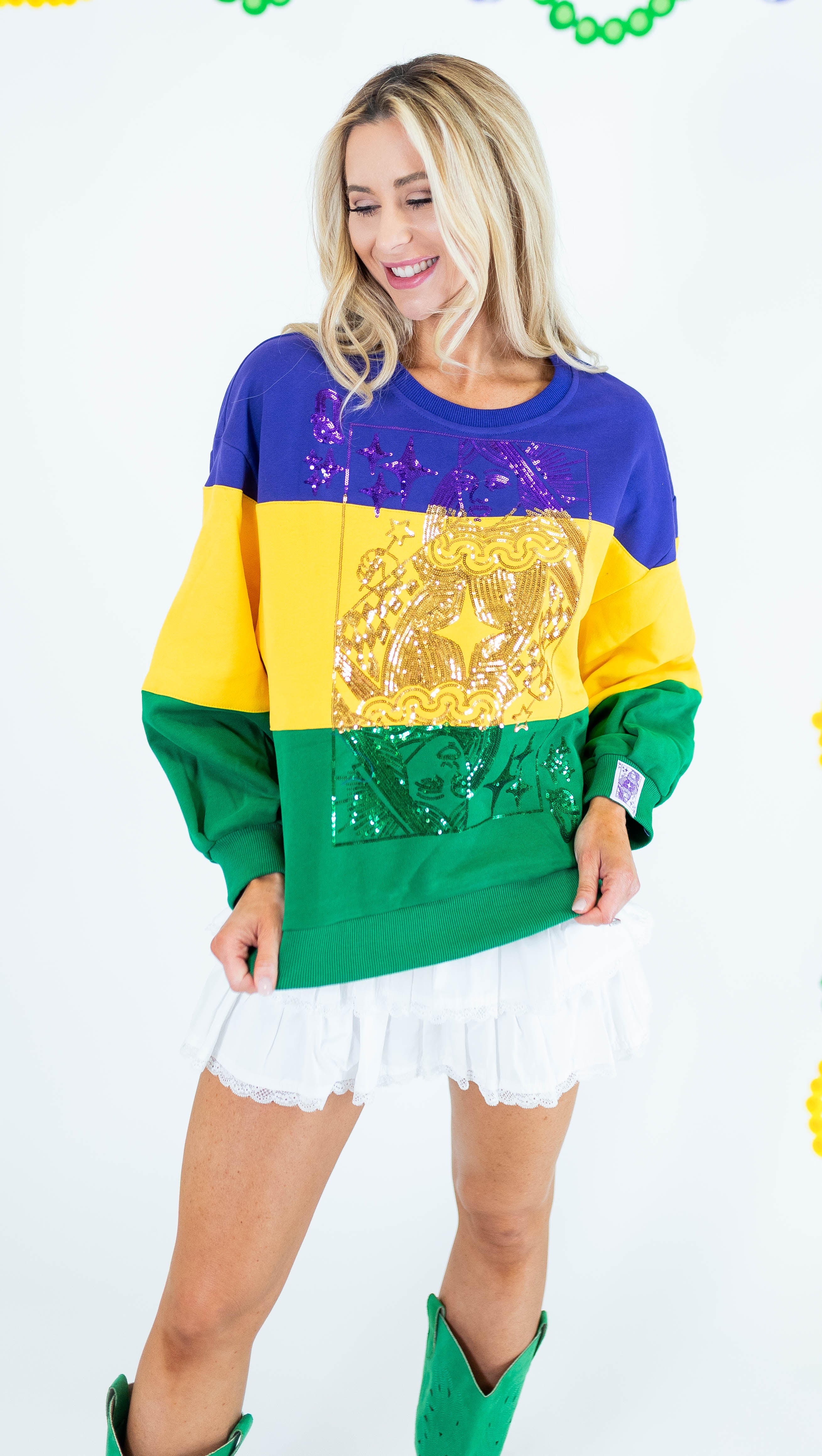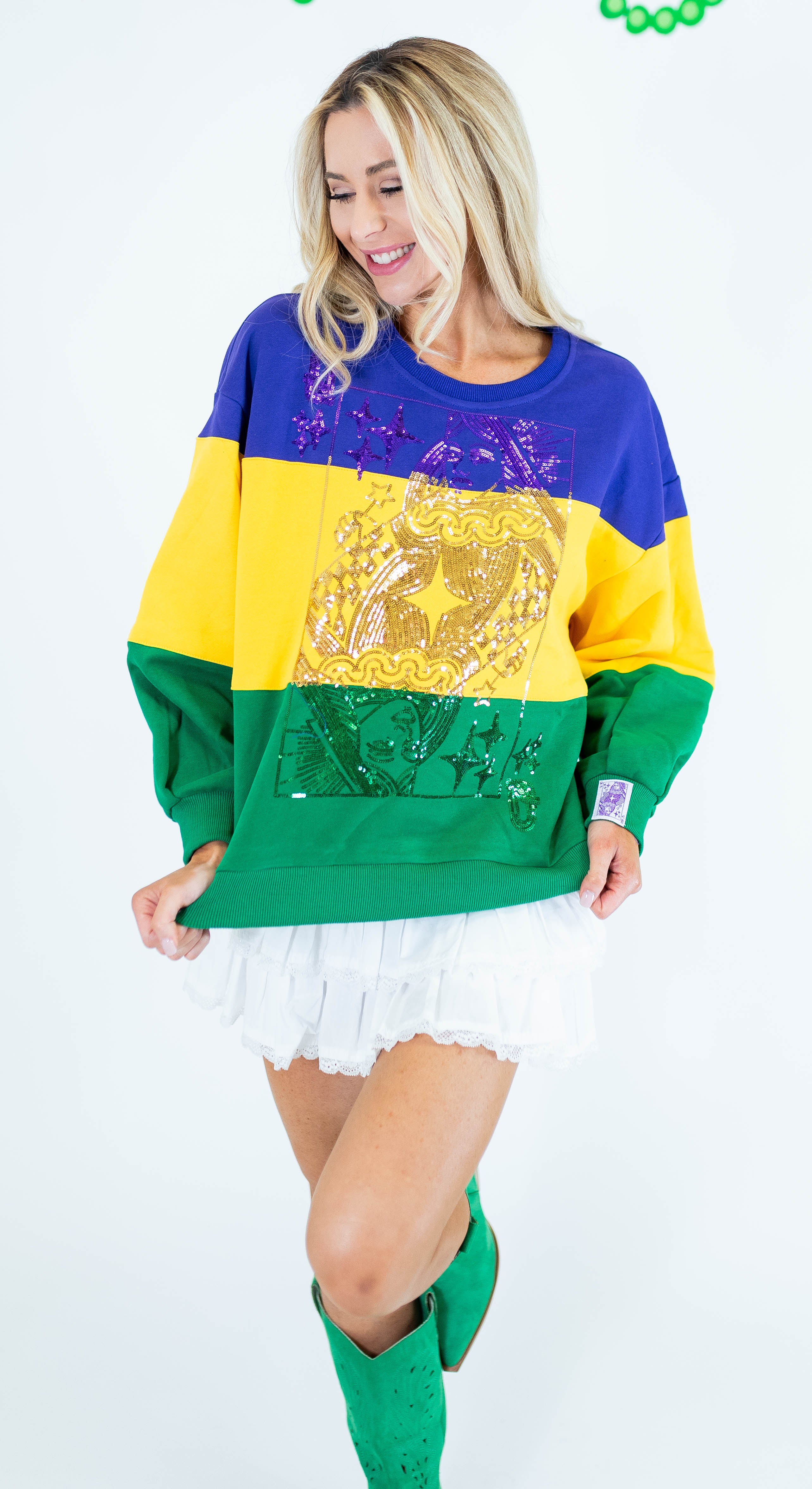 Queen Of Sparkles: Mardi Gras Striped Queen Card Sweatshirt