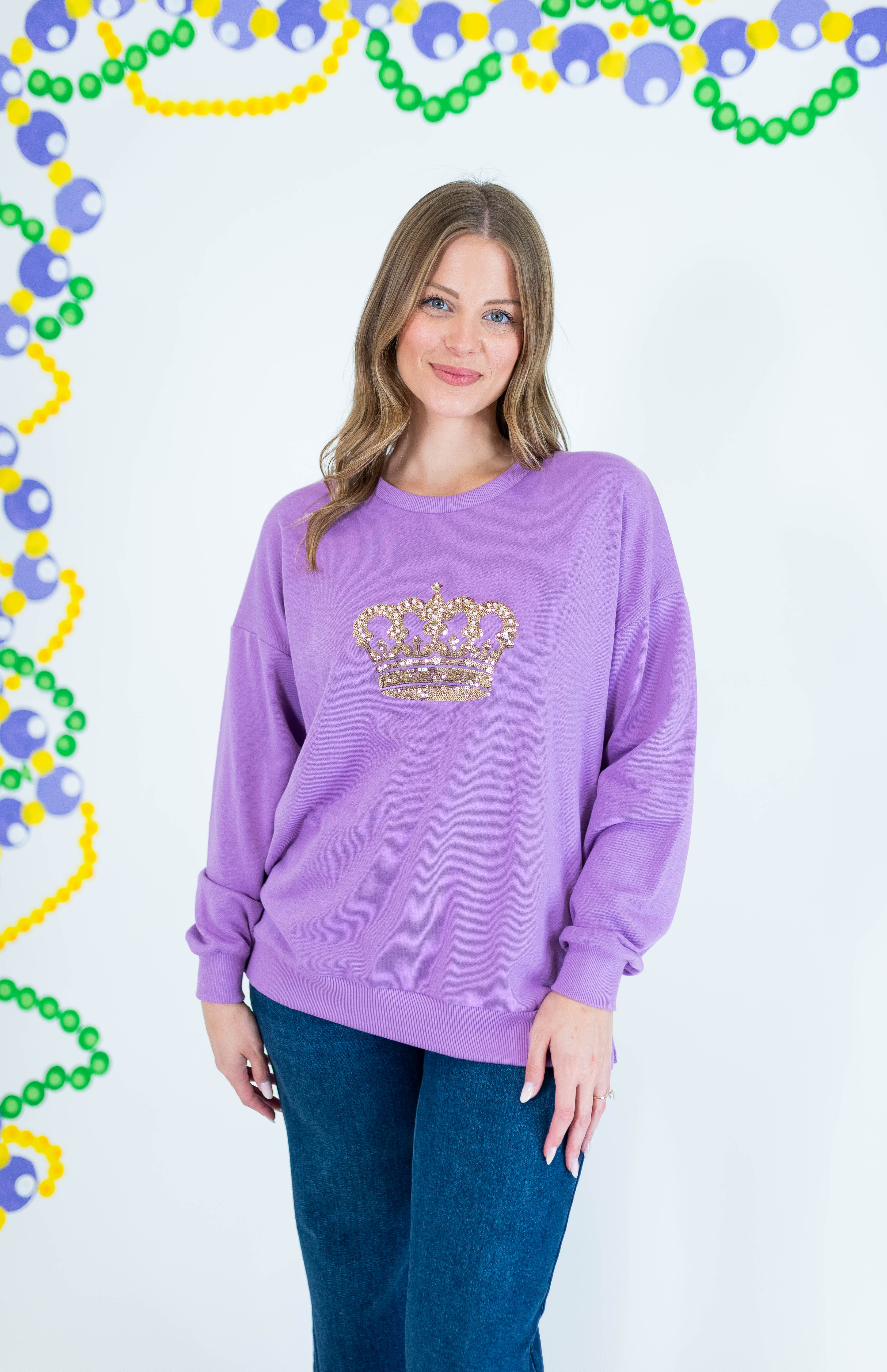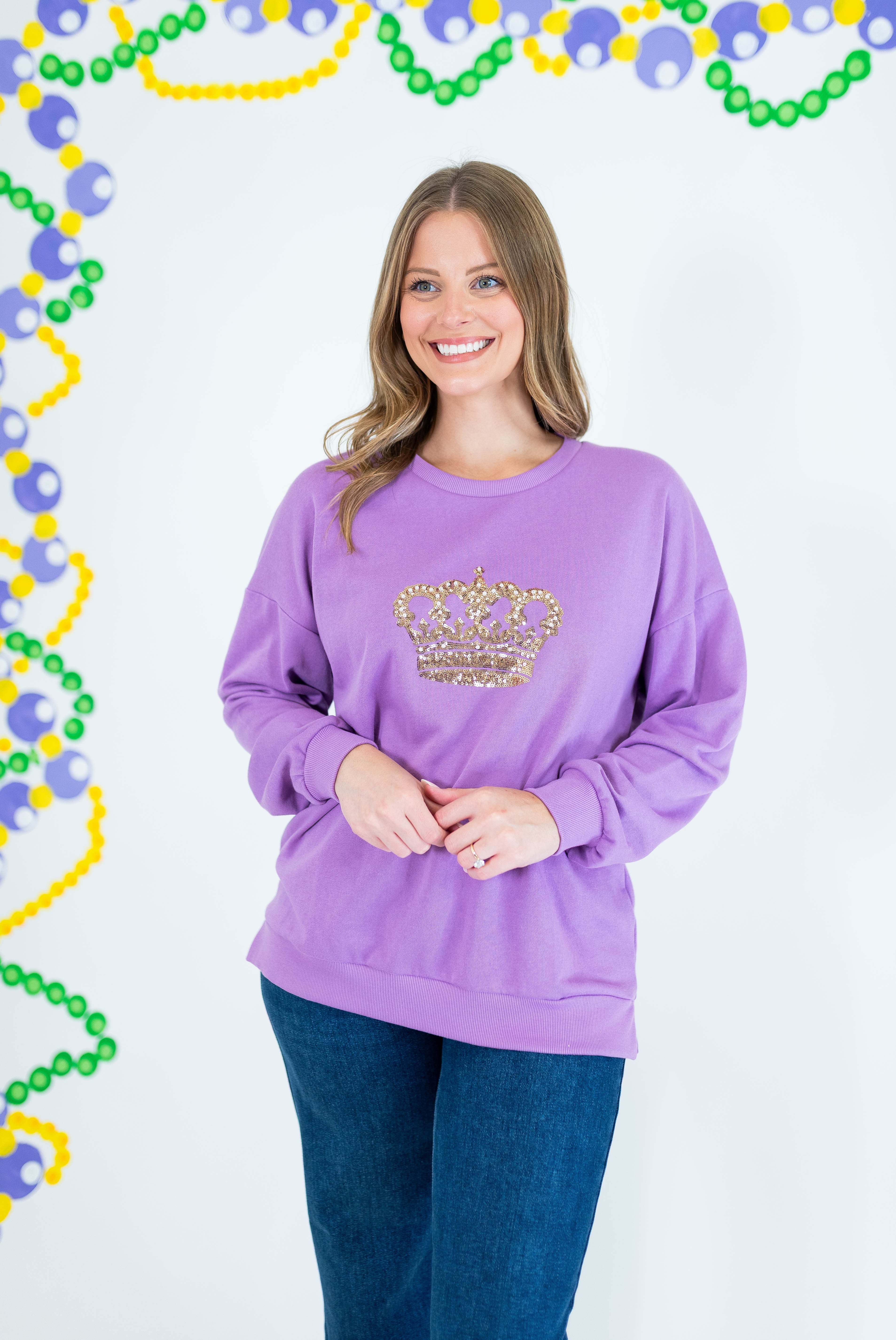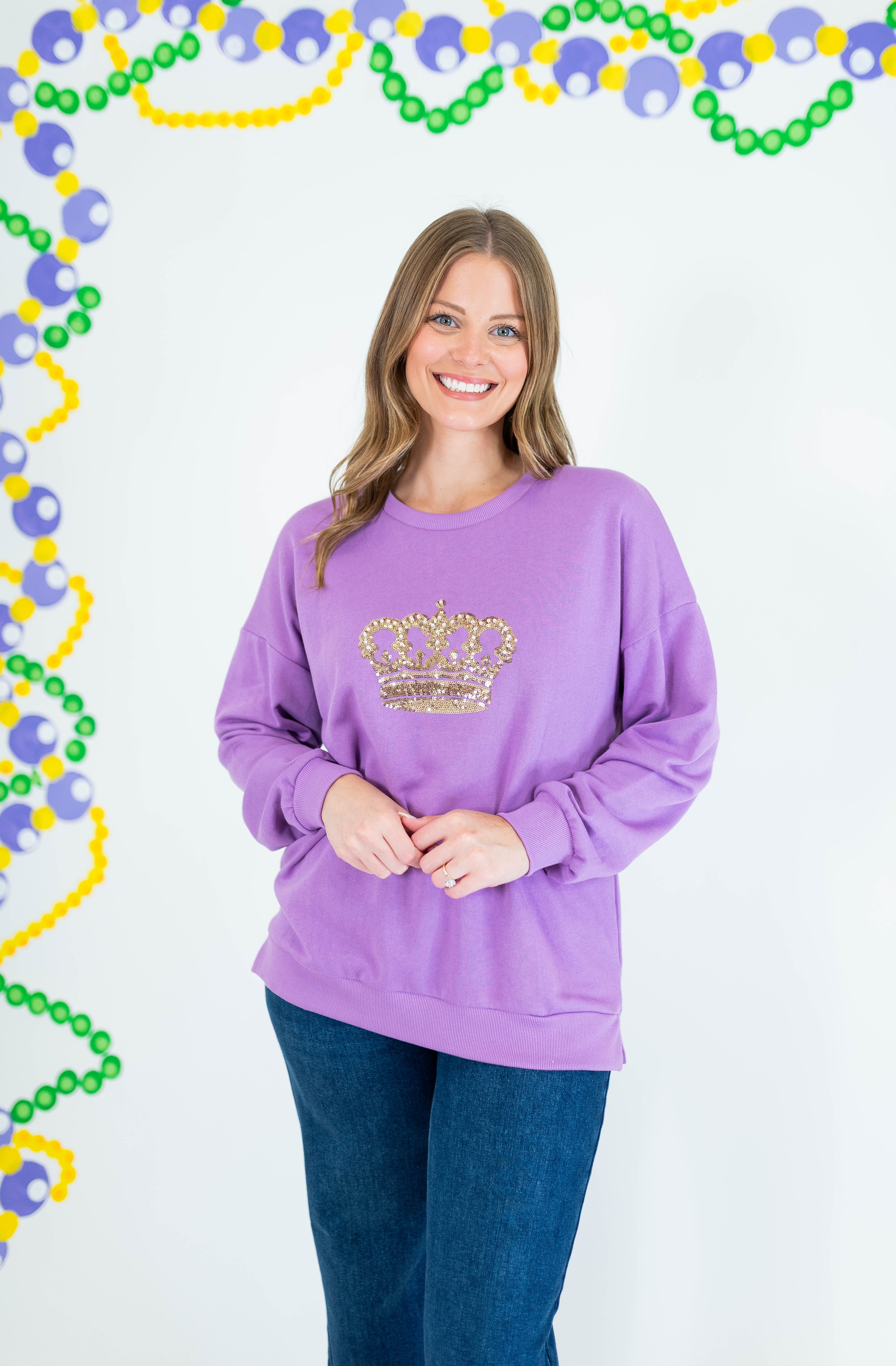 Shine bright with this light purple and gold sequin sweatshirt featuring a regal crown design, ideal for Mardi Gras celebrations or adding flair to any outfit.