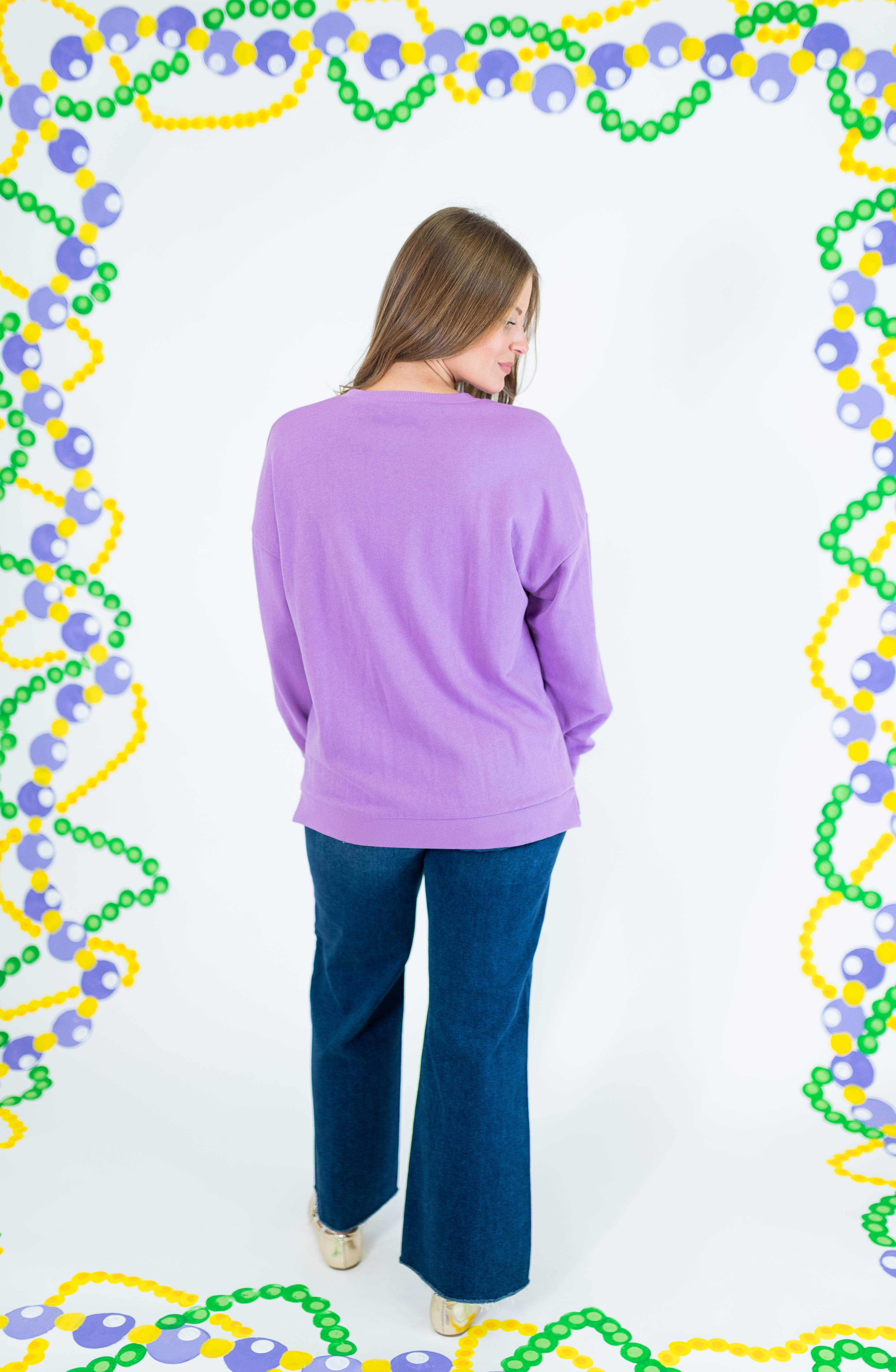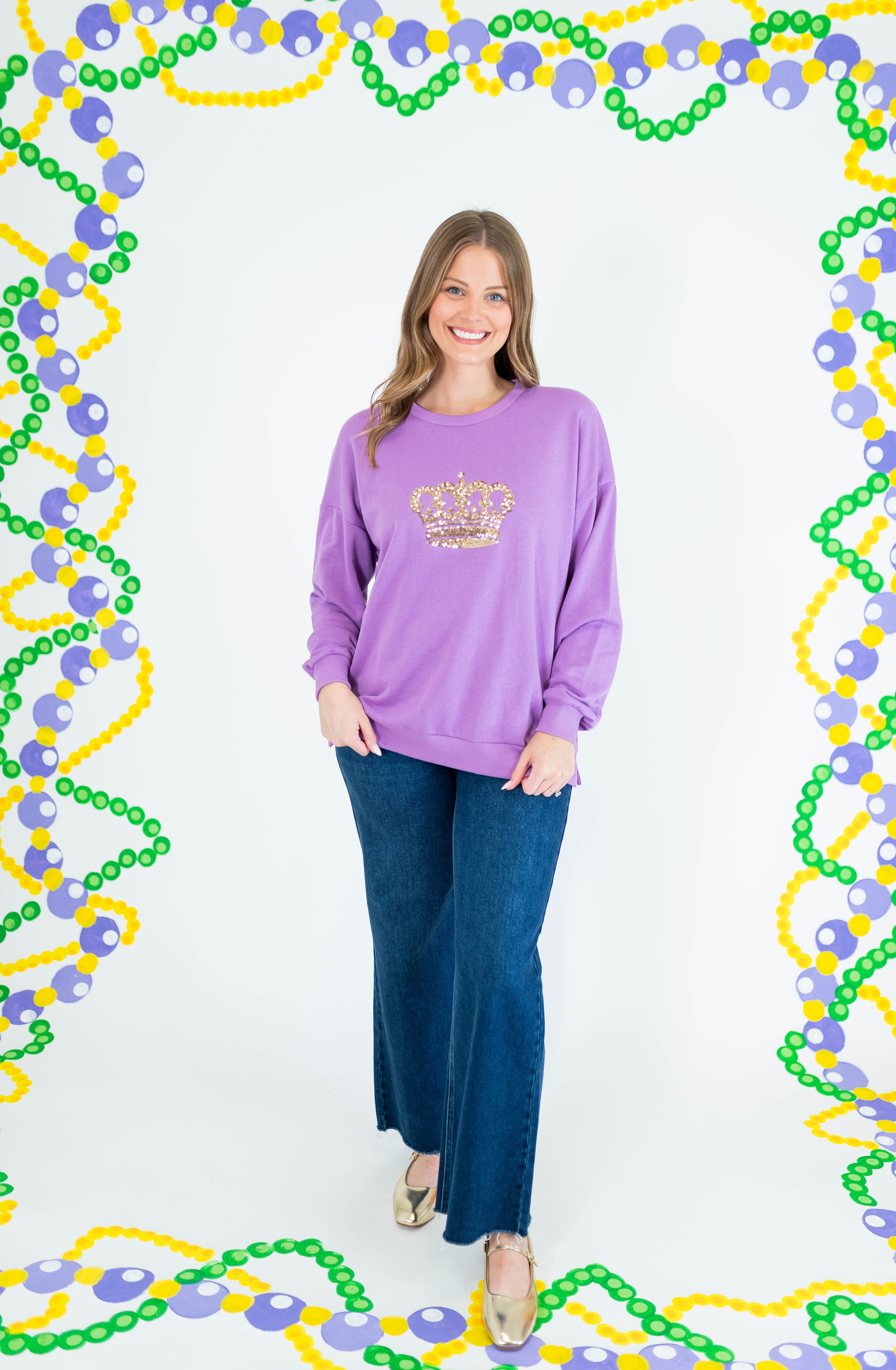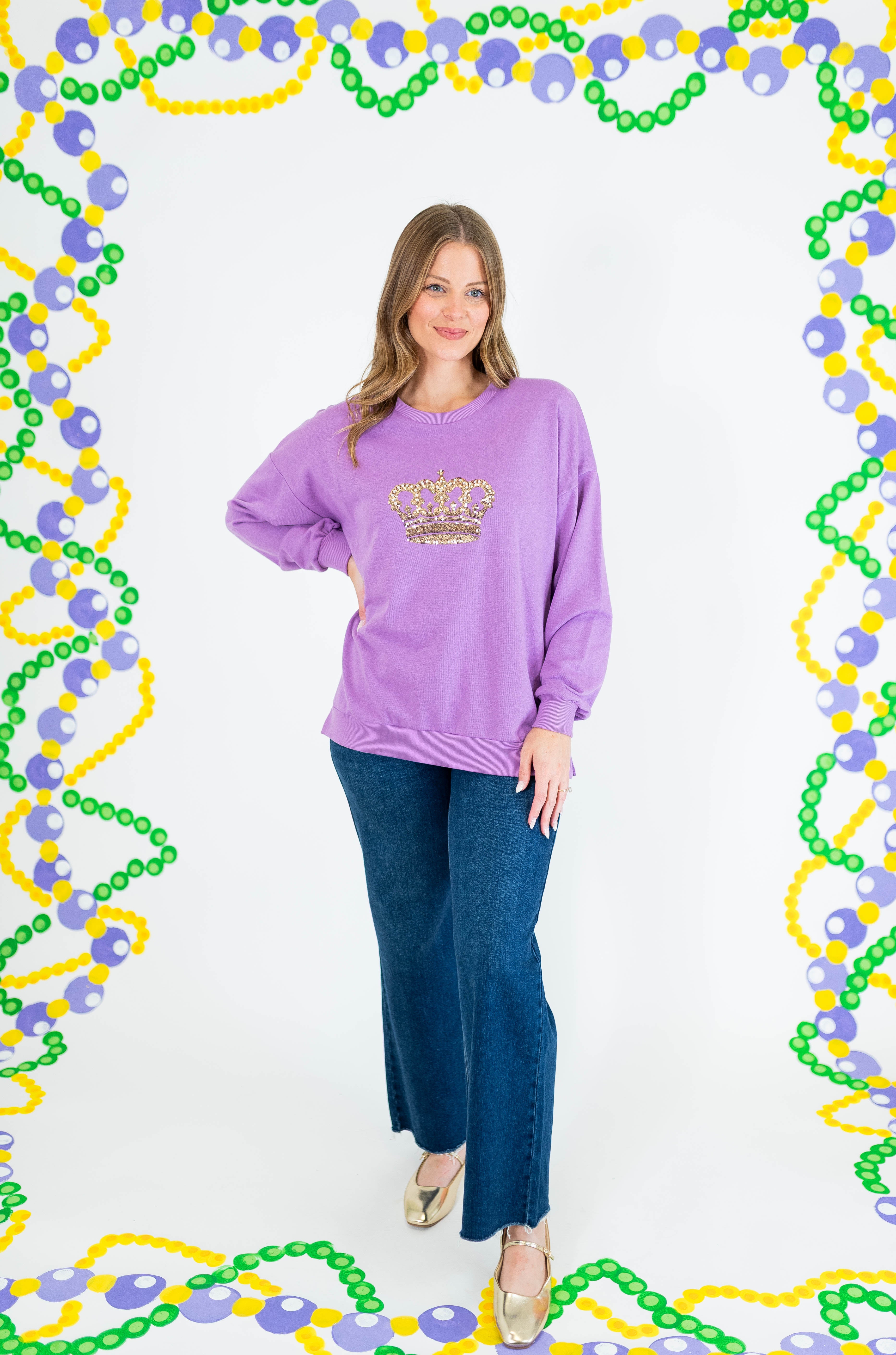 Shine bright with this light purple and gold sequin sweatshirt featuring a regal crown design, ideal for Mardi Gras celebrations or adding flair to any outfit.