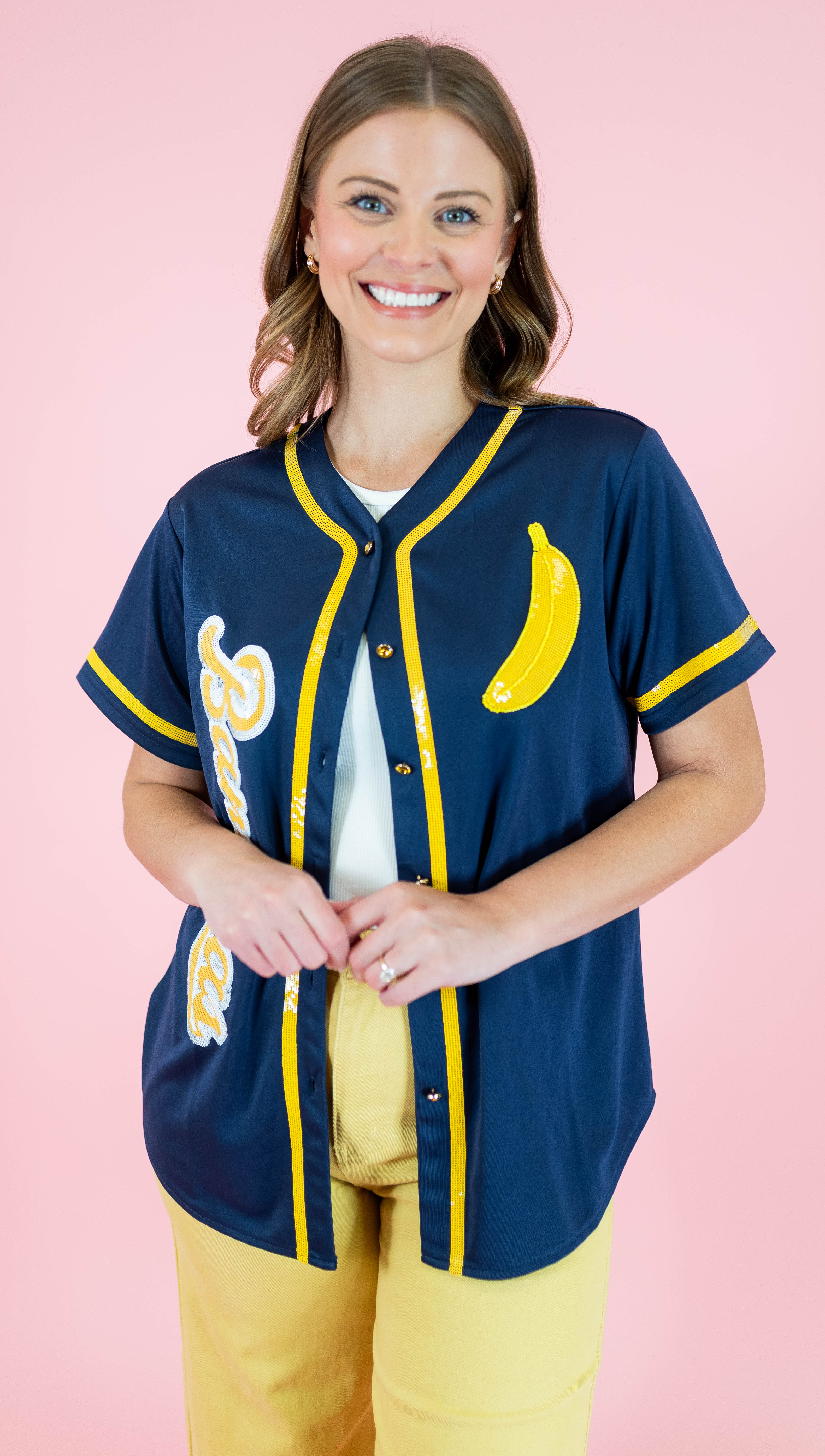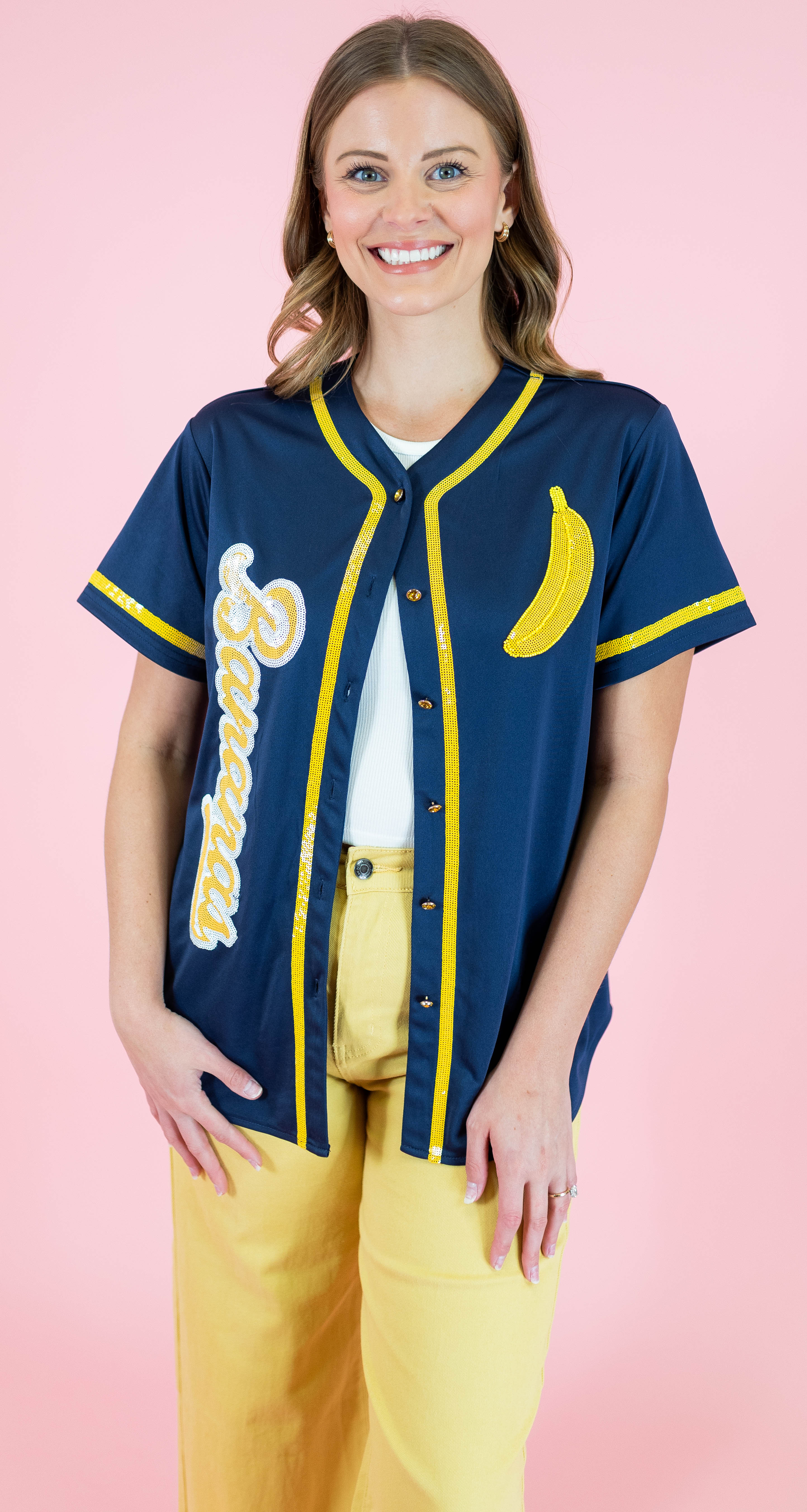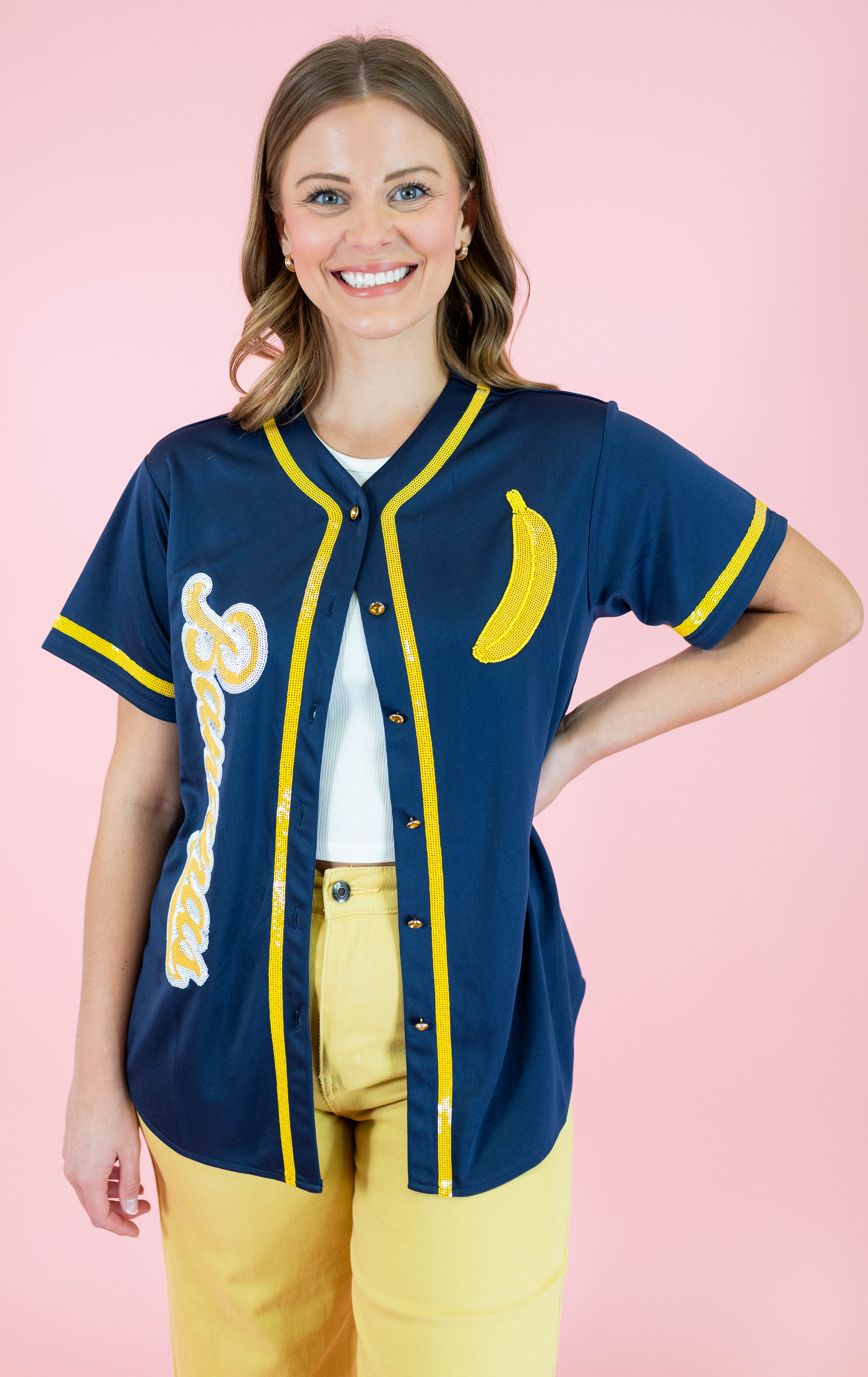 Catch the spirit of Savannah Bananas baseball with this vibrant Bananas Sequin Embroidery Baseball Jersey in navy. Adorned with shimmering sequin-embroidered banana motifs, this jersey celebrates the iconic team's fun-loving energy and distinctive style. Perfect for game day at the ballpark, tailgates, or showing your support year-round, it combines comfort with bold personality. The classic baseball cut keeps you cool while the eye-catching embroidery makes sure you stand out in the stands. Whether you're a die-hard fan or just love the Bananas' playful vibe, this navy jersey is your ticket to spirited style.