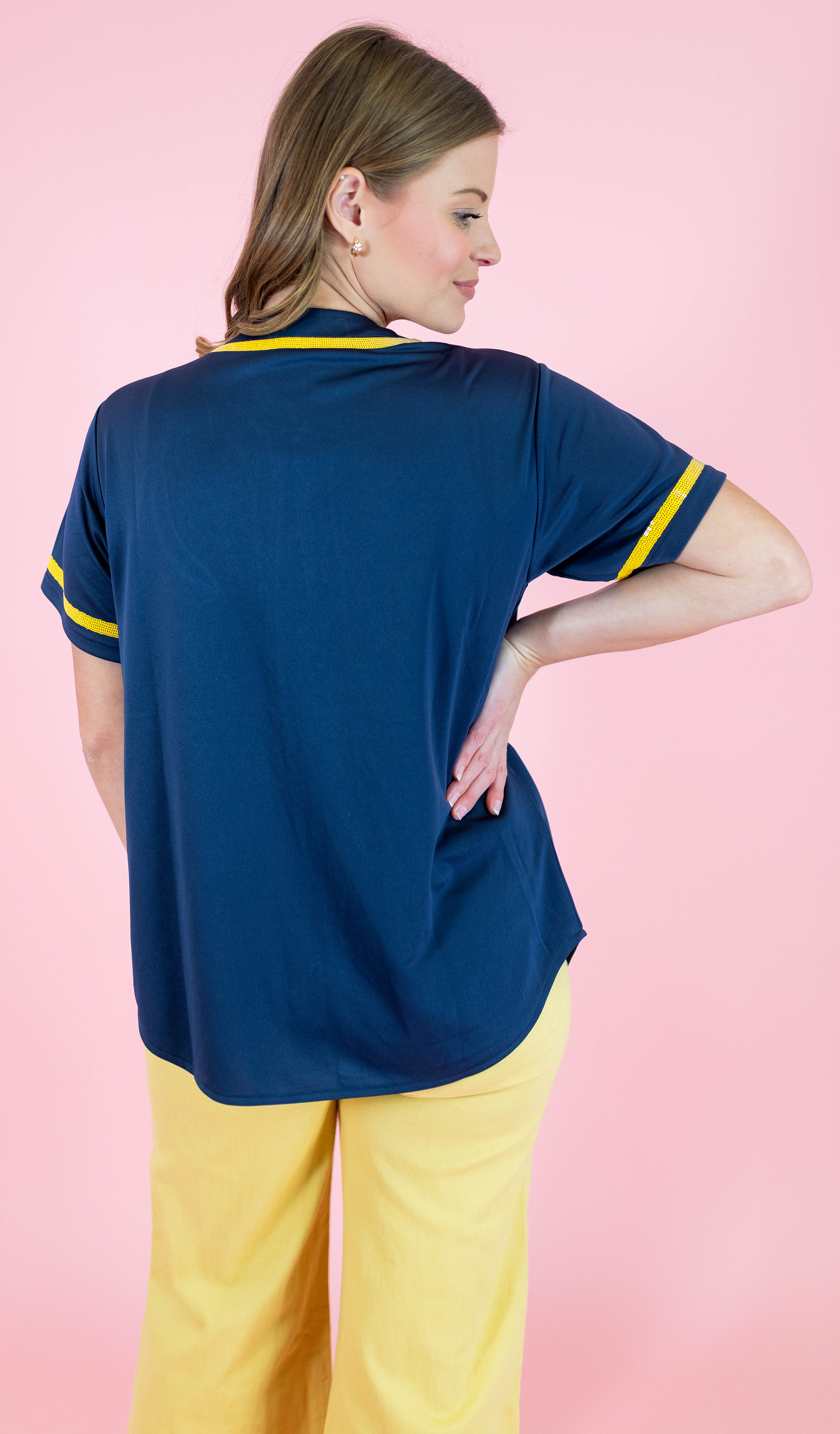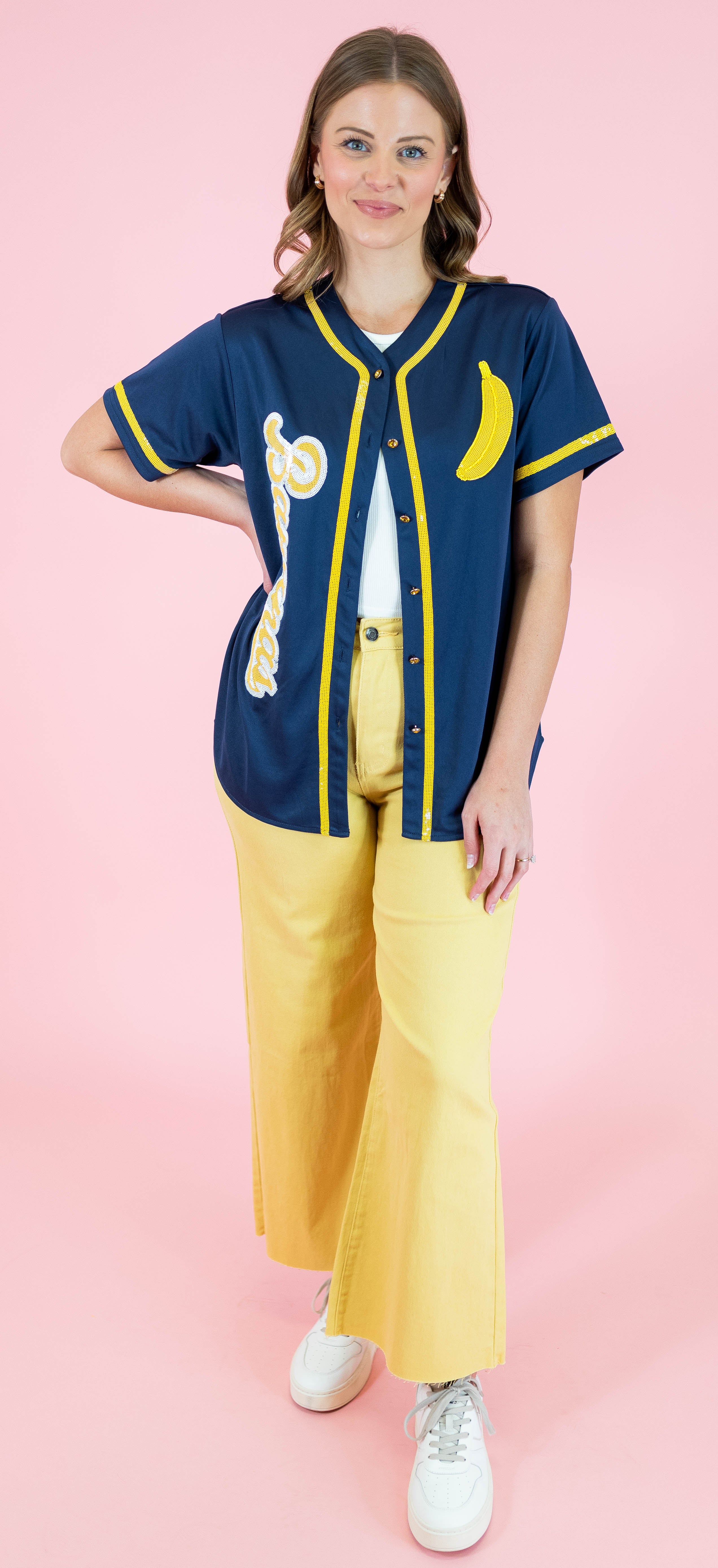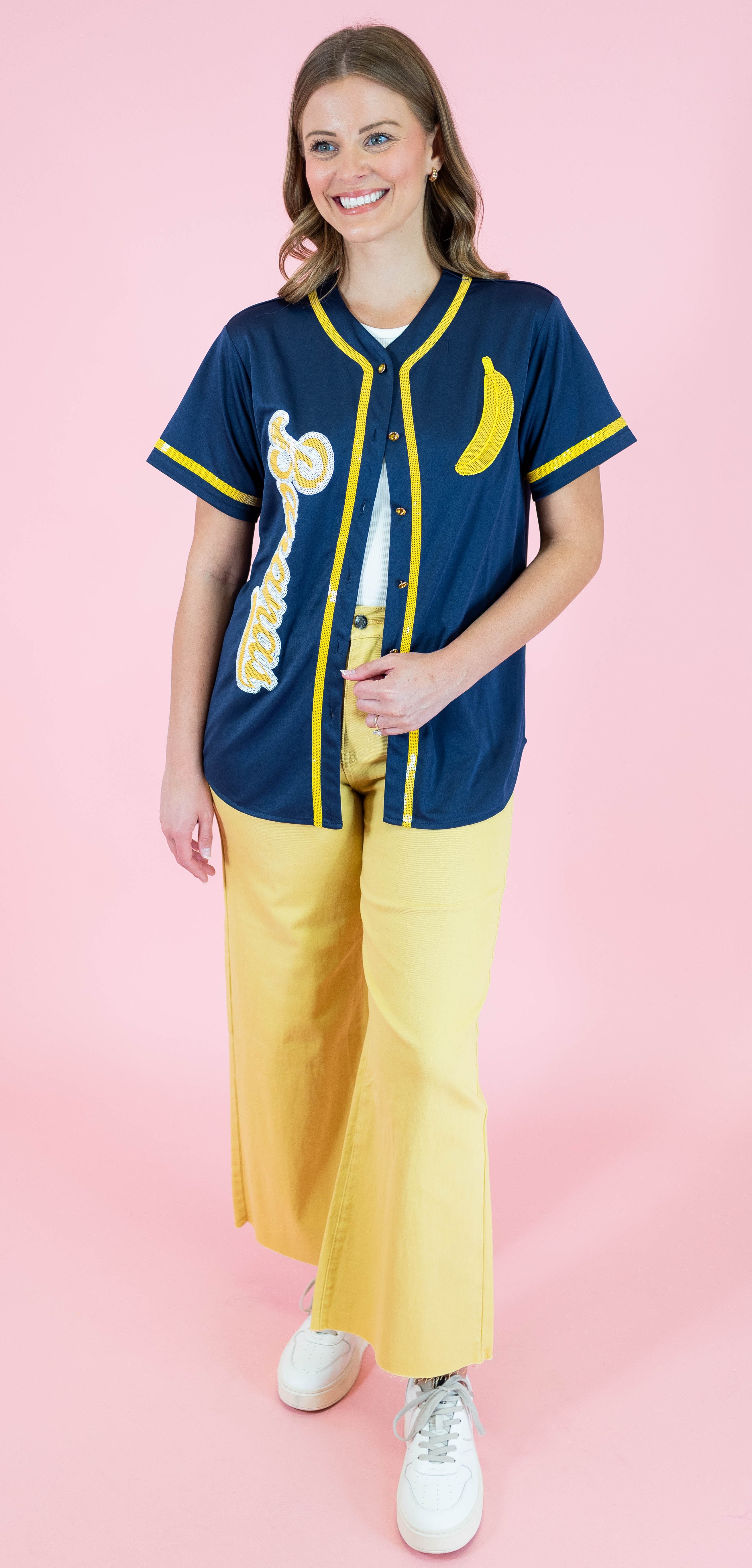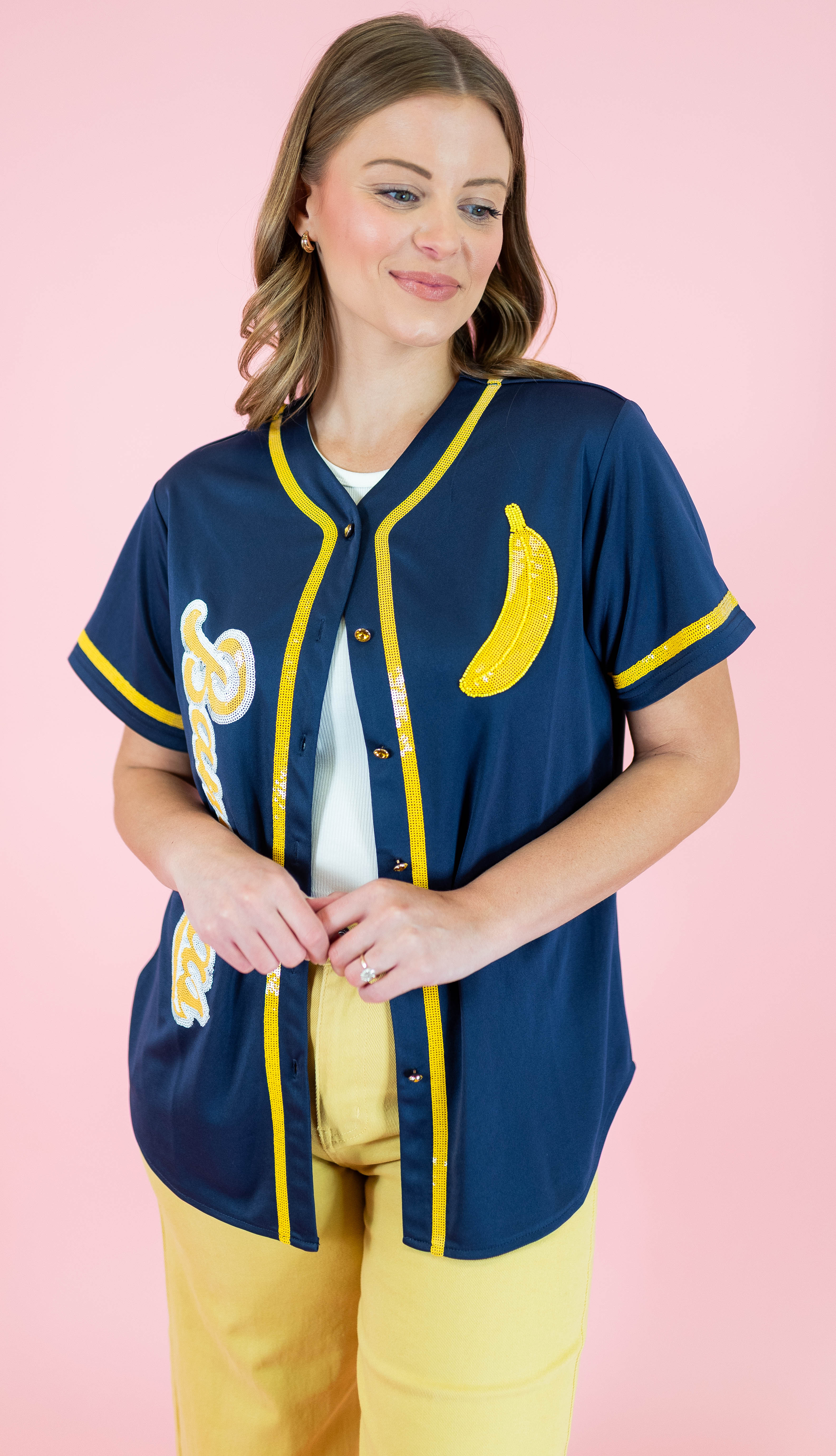 Catch the spirit of Savannah Bananas baseball with this vibrant Bananas Sequin Embroidery Baseball Jersey in navy. Adorned with shimmering sequin-embroidered banana motifs, this jersey celebrates the iconic team's fun-loving energy and distinctive style. Perfect for game day at the ballpark, tailgates, or showing your support year-round, it combines comfort with bold personality. The classic baseball cut keeps you cool while the eye-catching embroidery makes sure you stand out in the stands. Whether you're a die-hard fan or just love the Bananas' playful vibe, this navy jersey is your ticket to spirited style.