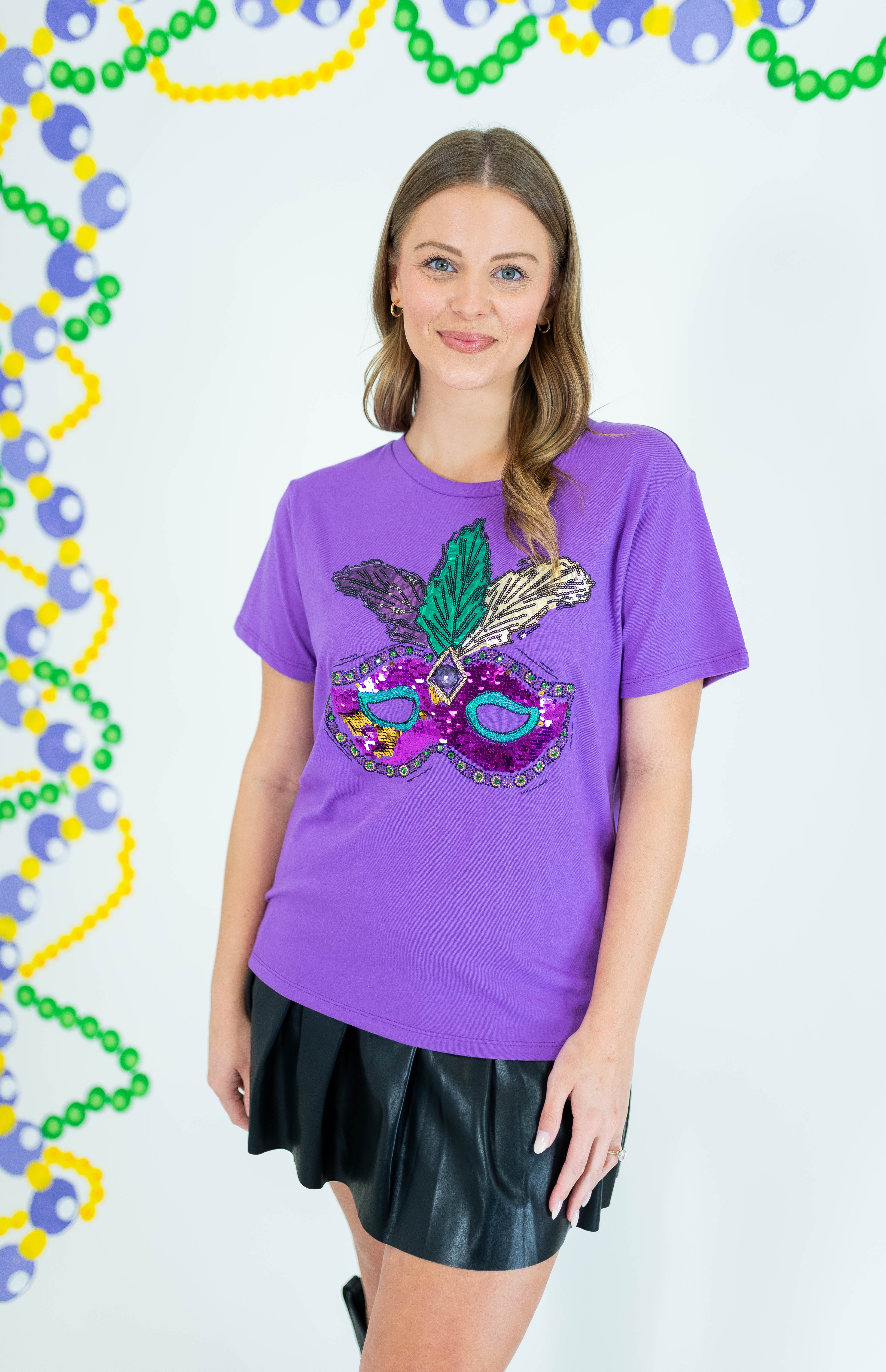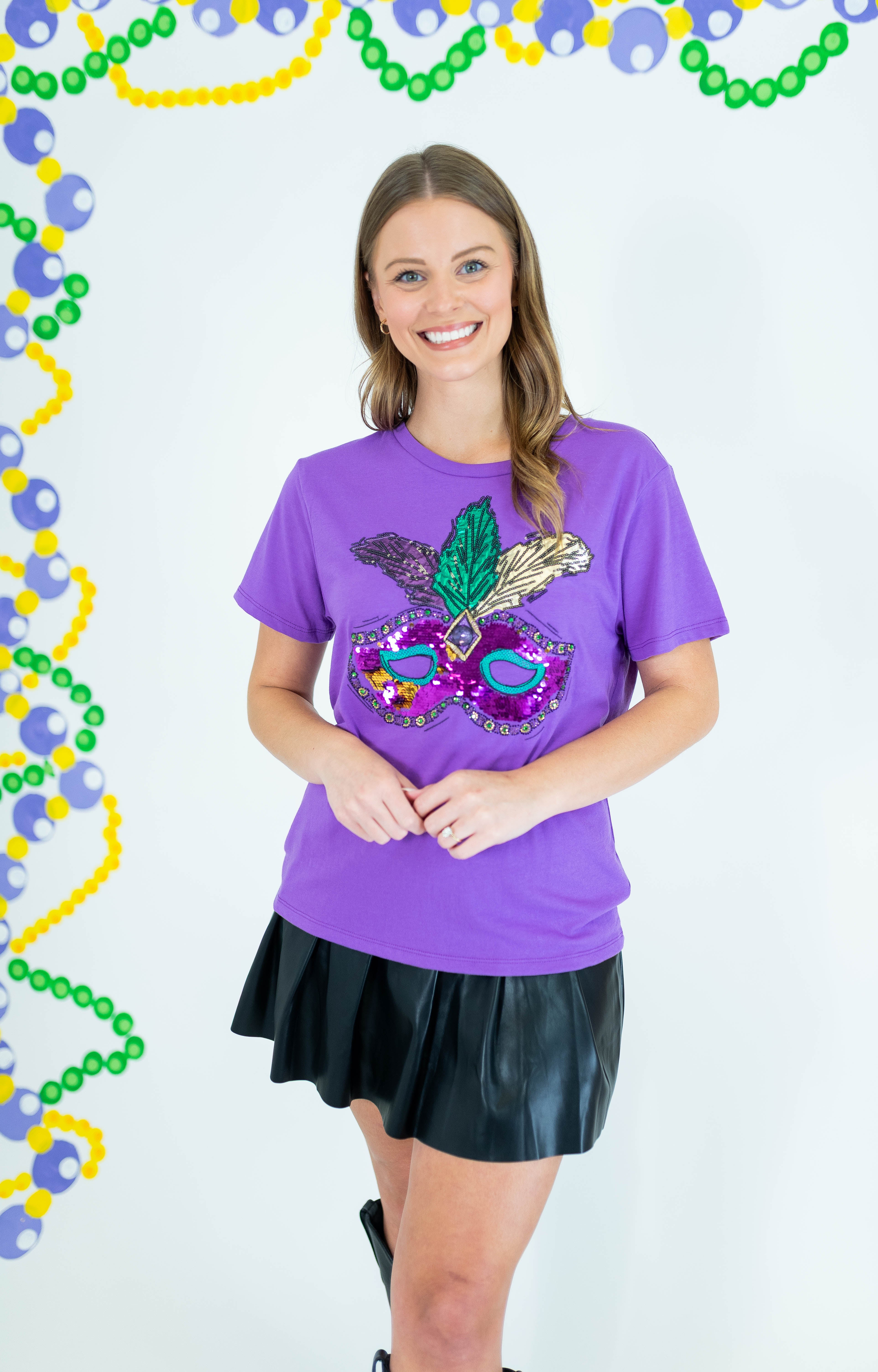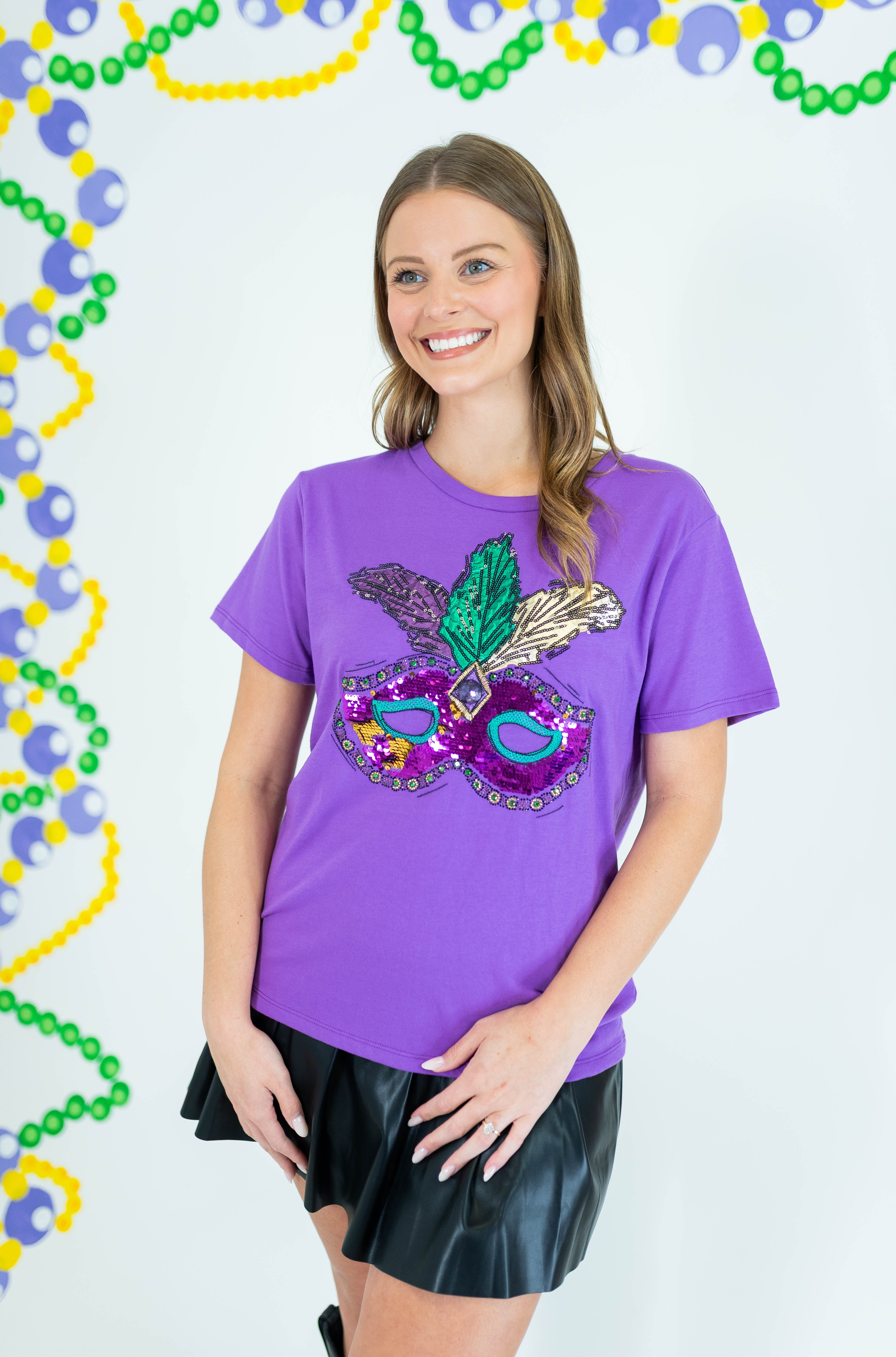 Celebrate the spirit of Mardi Gras with this vibrant Carnival Purple Crew Neck Shirt, featuring an eye-catching sequin mask design that brings festive flair to any occasion. The bold purple hue captures the essence of carnival season, while the shimmering sequin detailing adds glamour and movement with every wear. Perfect for themed parties, festivals, or anyone who loves making a statement, this shirt combines comfort with show-stopping style. Whether you're dancing through the streets or turning heads at a celebration, this piece ensures you'll stand out in the crowd.