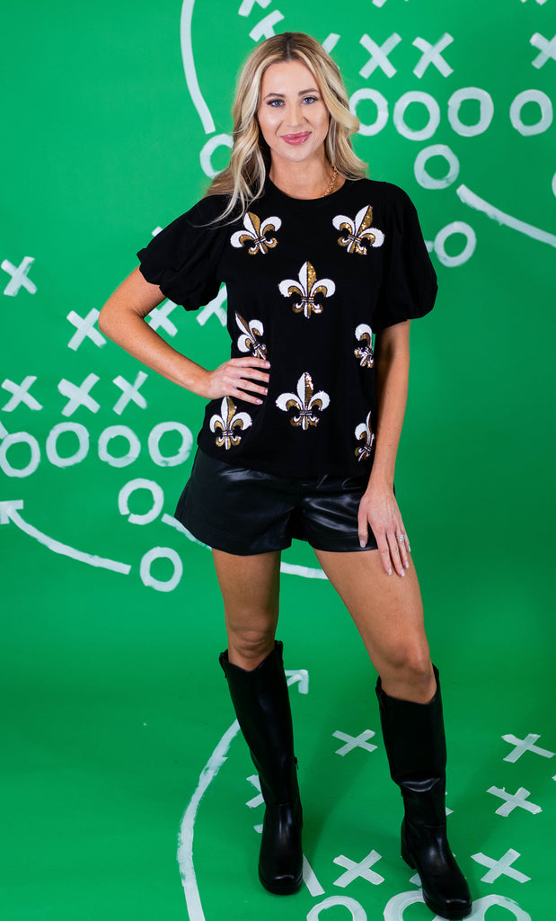 If you love the black and gold, then you will love this beautiful tee. It features scattered fleur de lis on the front, on our soft puff sleeve black tee.