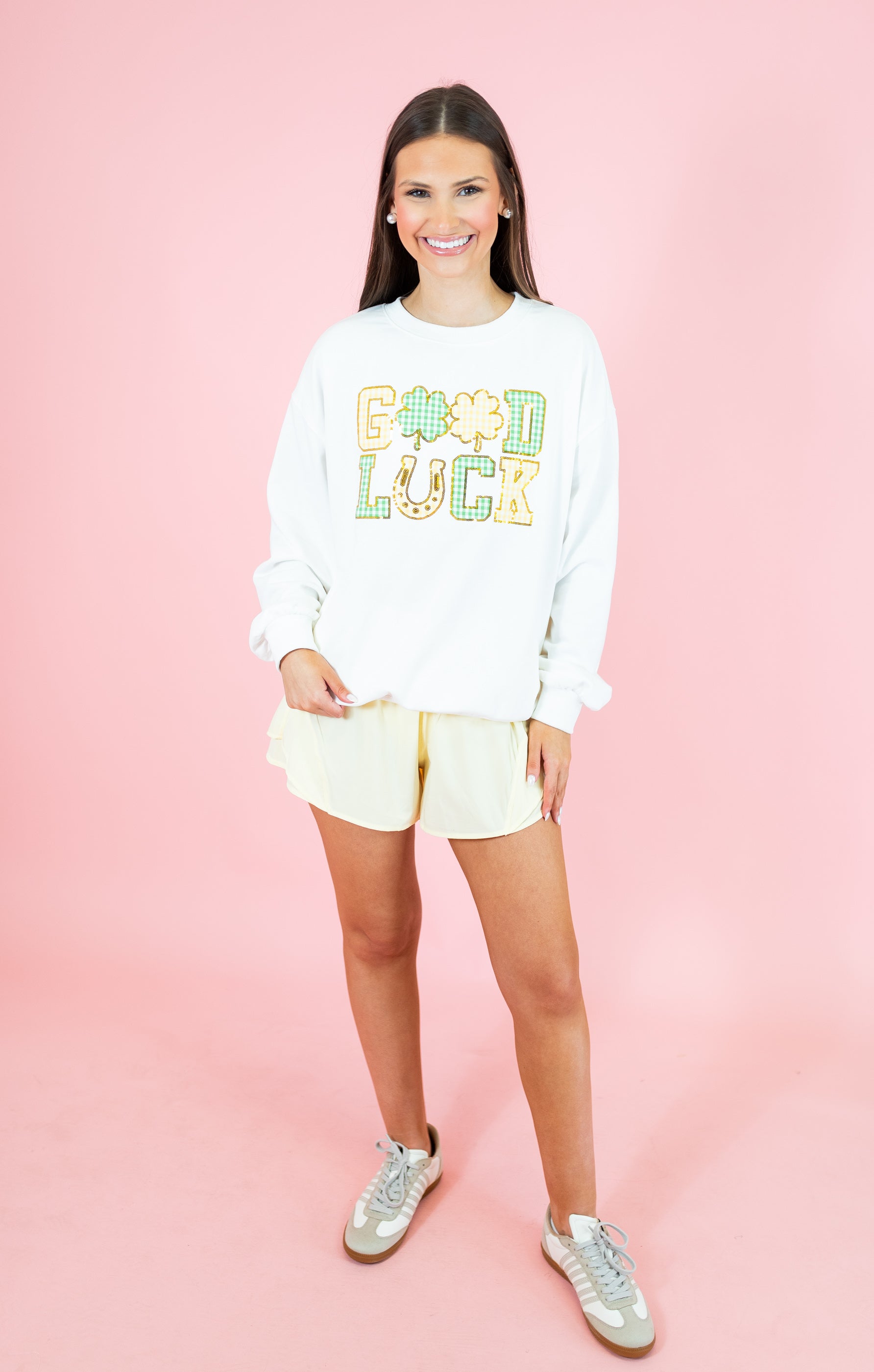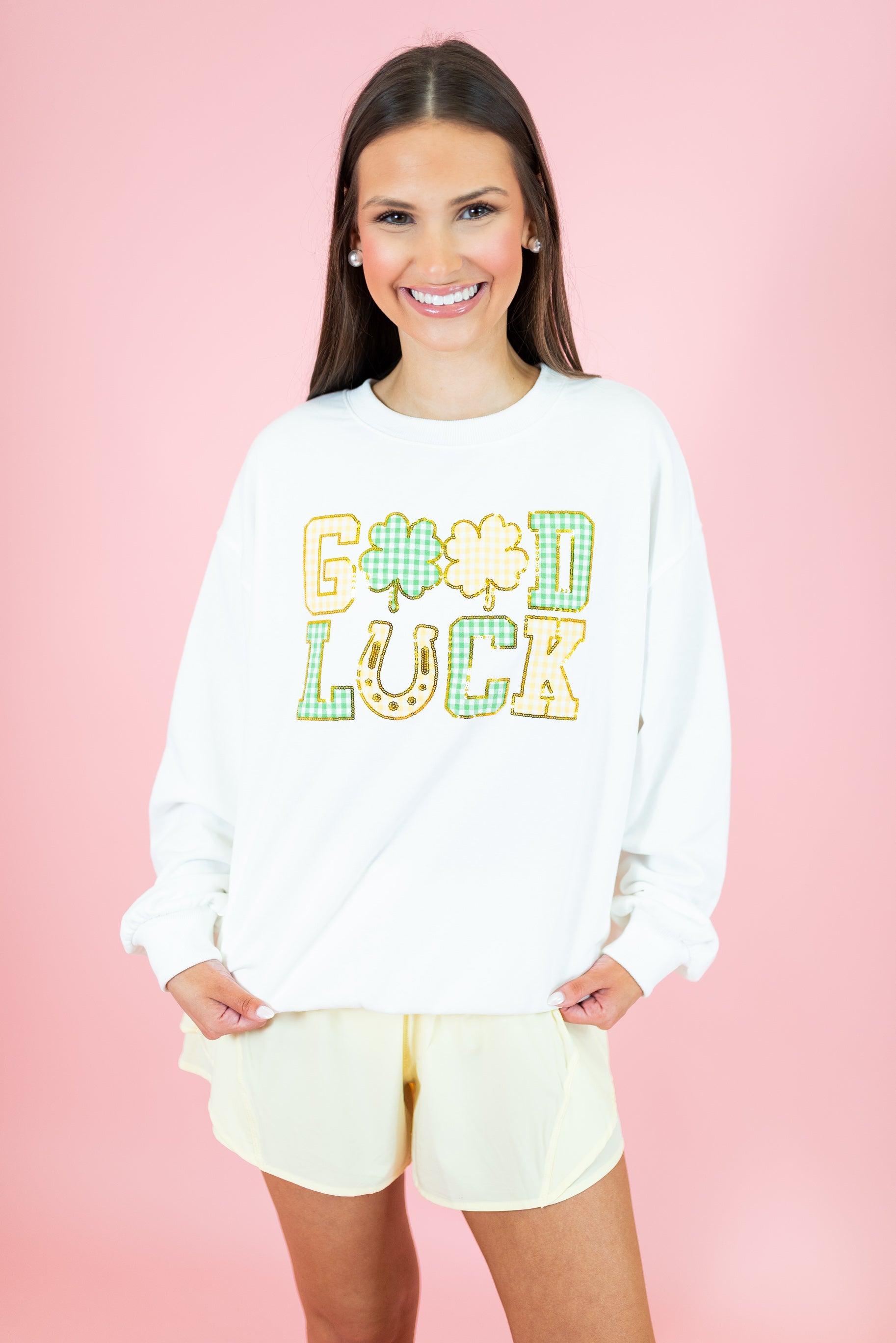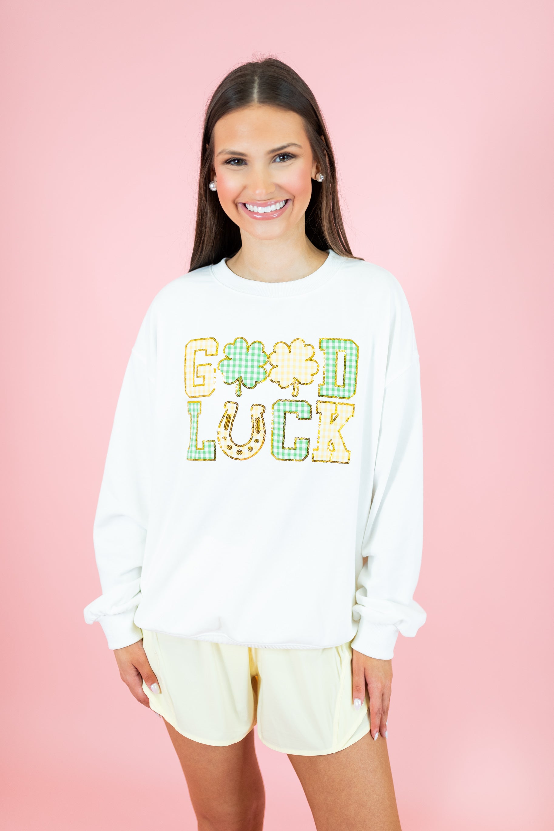 Get lucky in style with this festive Good Luck Gingham Patch Sweatshirt! Perfect for St. Patrick's Day celebrations, this white sweatshirt features a charming gingham patch that brings playful Irish-inspired flair to your seasonal wardrobe. Cozy, comfortable, and packed with good-luck charm, it's ideal for parades, parties, or spreading St. Paddy's Day spirit all month long. Snag yours and let the luck roll in!