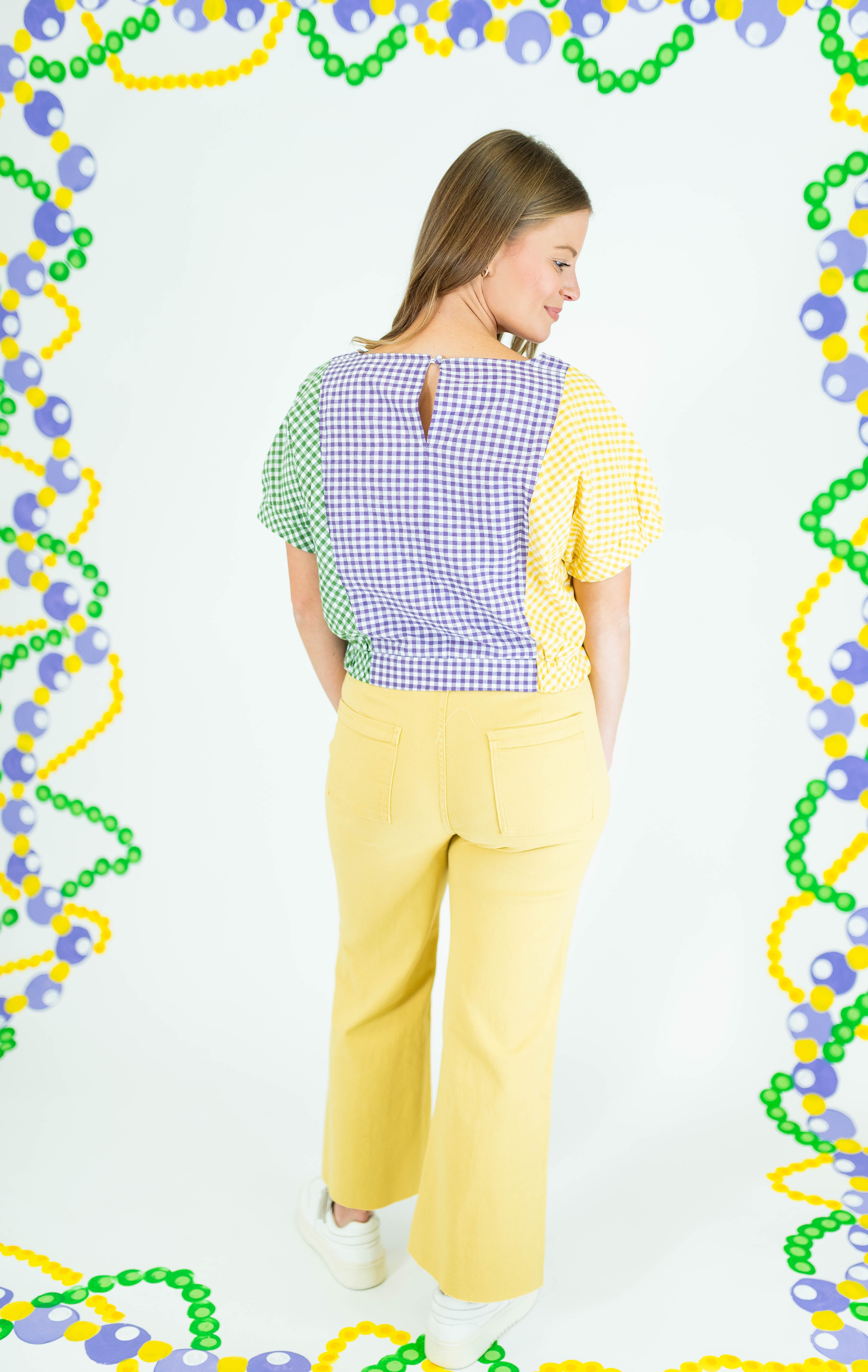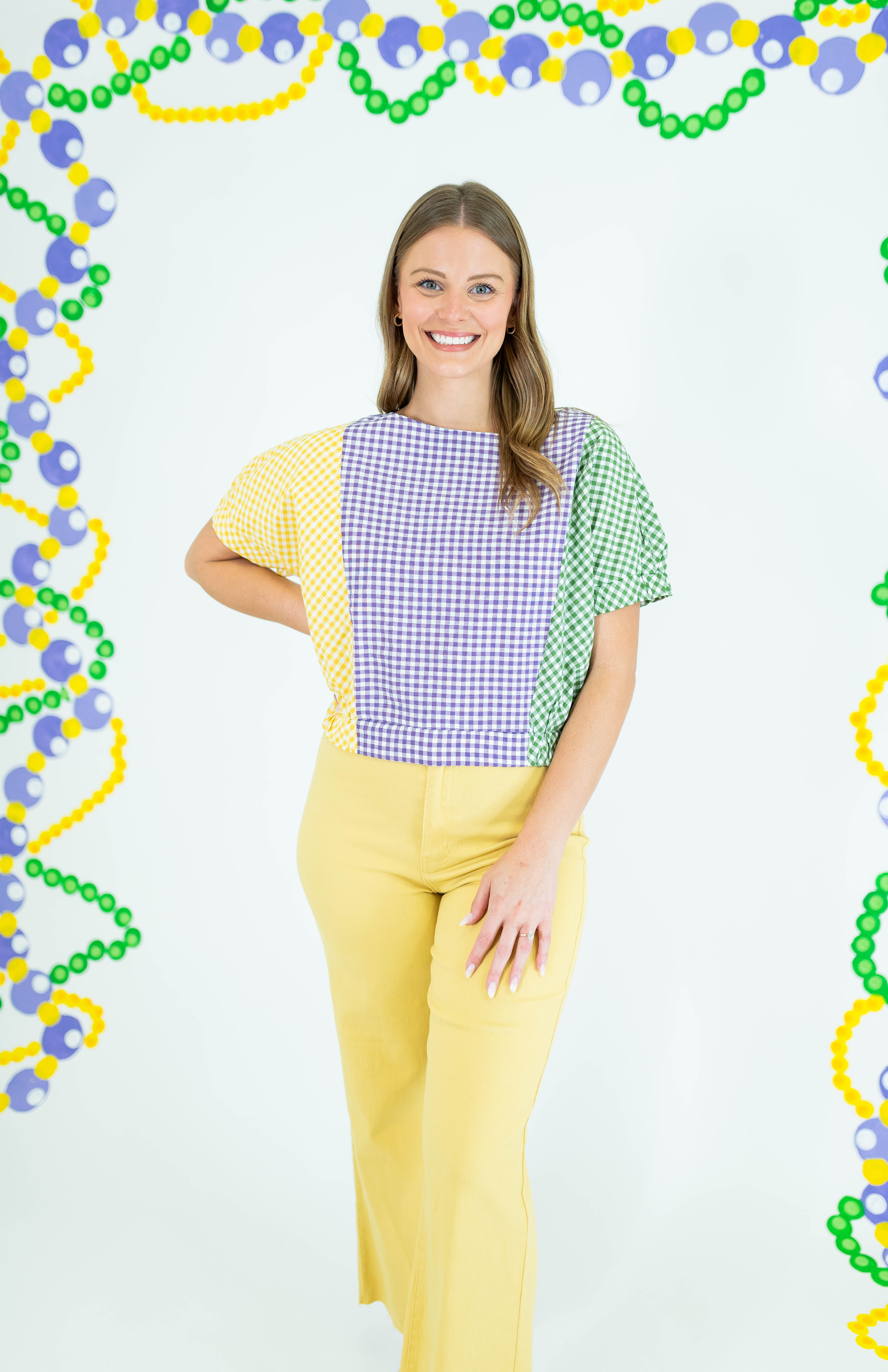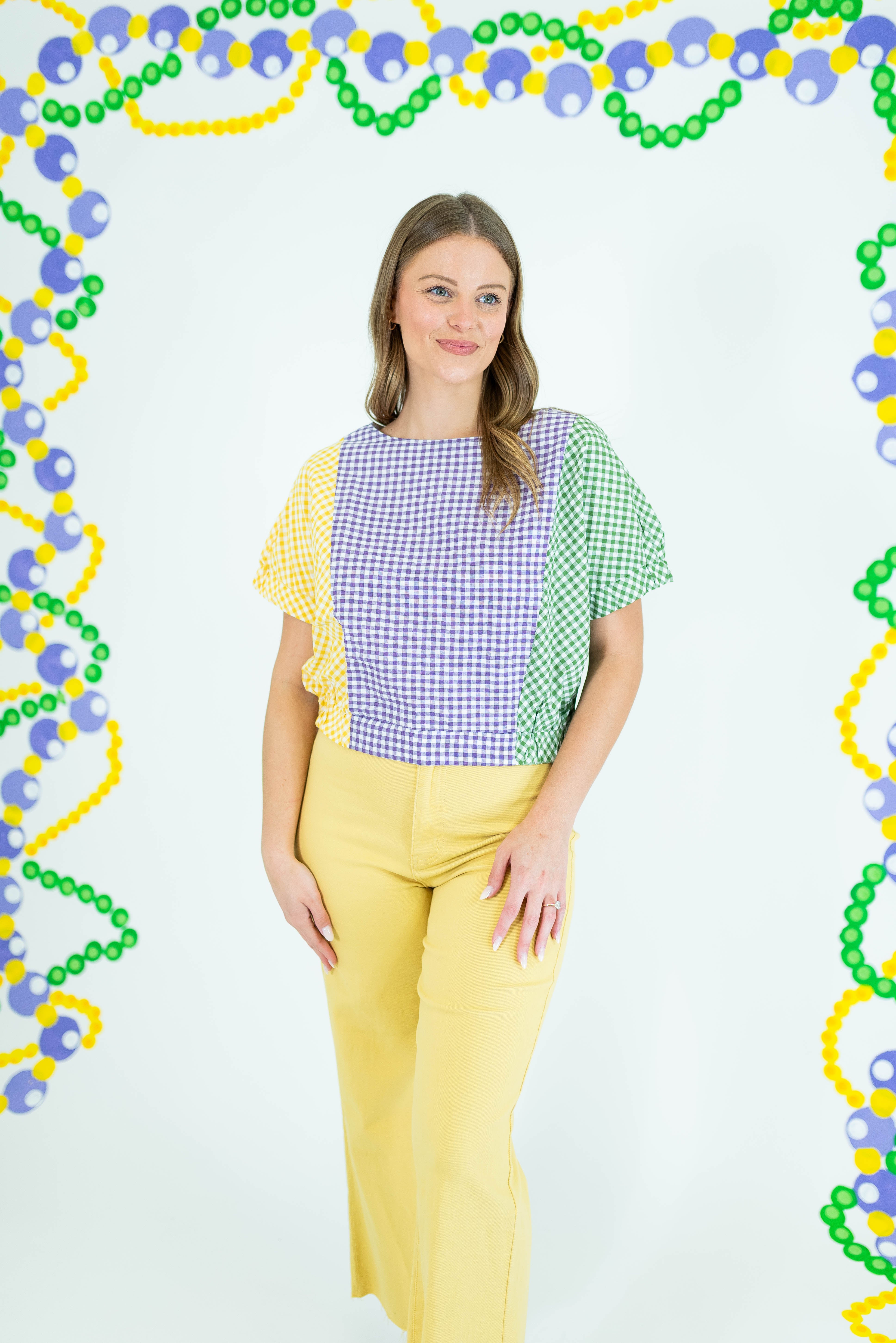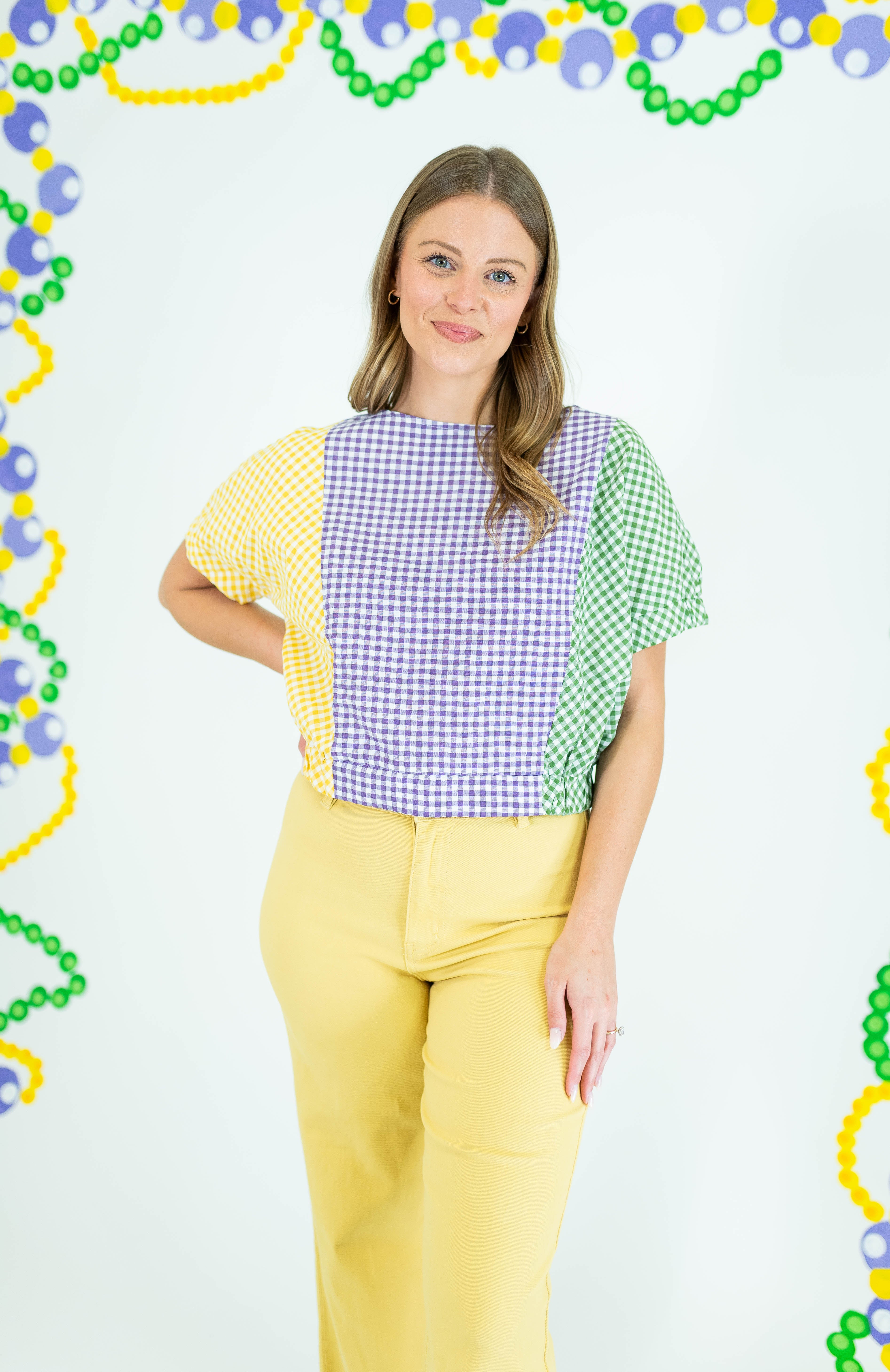 Celebrate bold style with this vibrant Mardi Gras Color Block Check Crop Blouse. Featuring striking color-blocked panels and a classic check pattern, this cropped silhouette brings playful energy to any outfit. Perfect for festival season, night outs, or whenever you want to make a statement. The flattering crop length pairs effortlessly with high-waisted bottoms for a polished look that turns heads. Embrace your inner fashionista and add this eye-catching piece to your wardrobe today.
