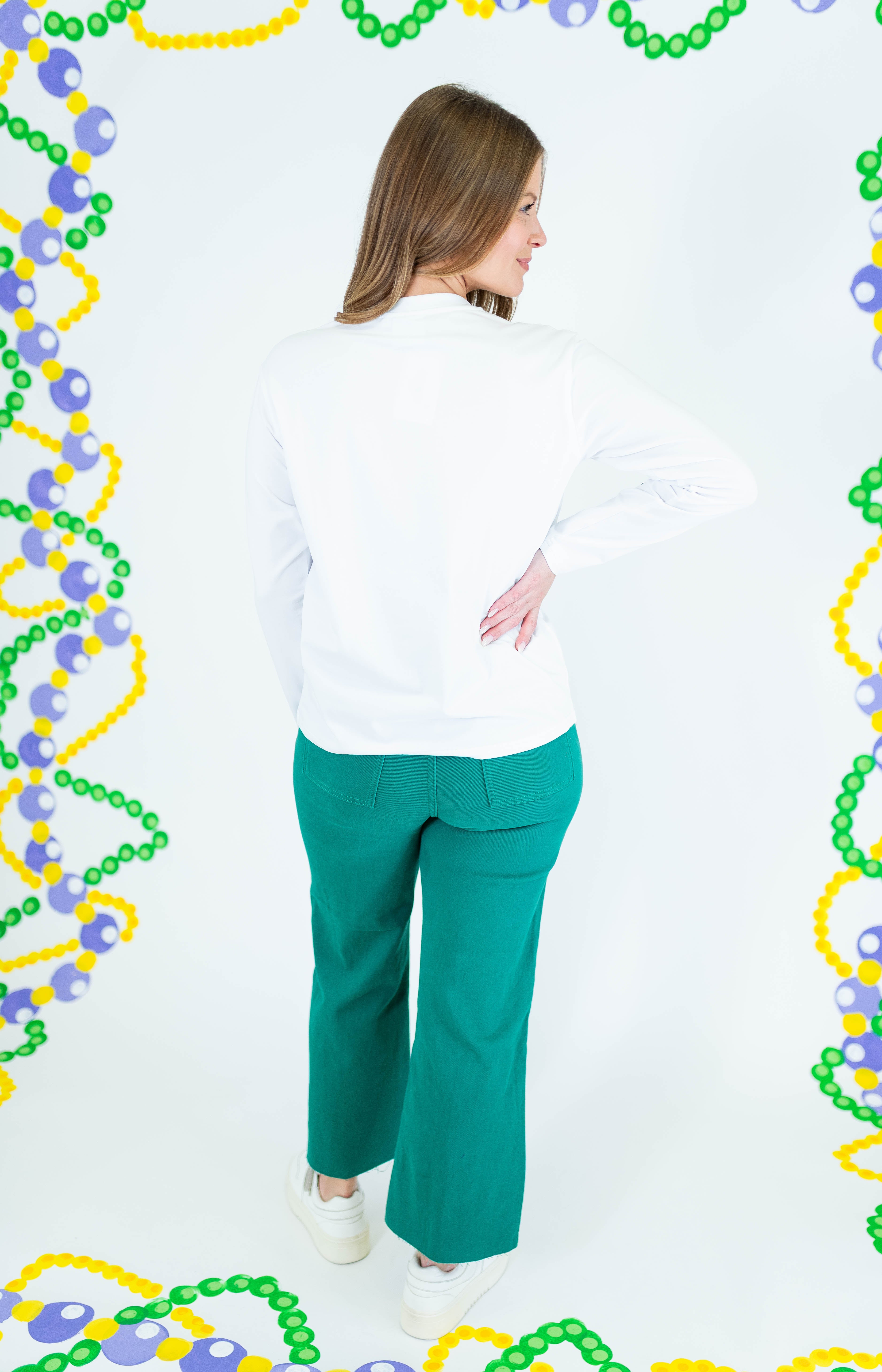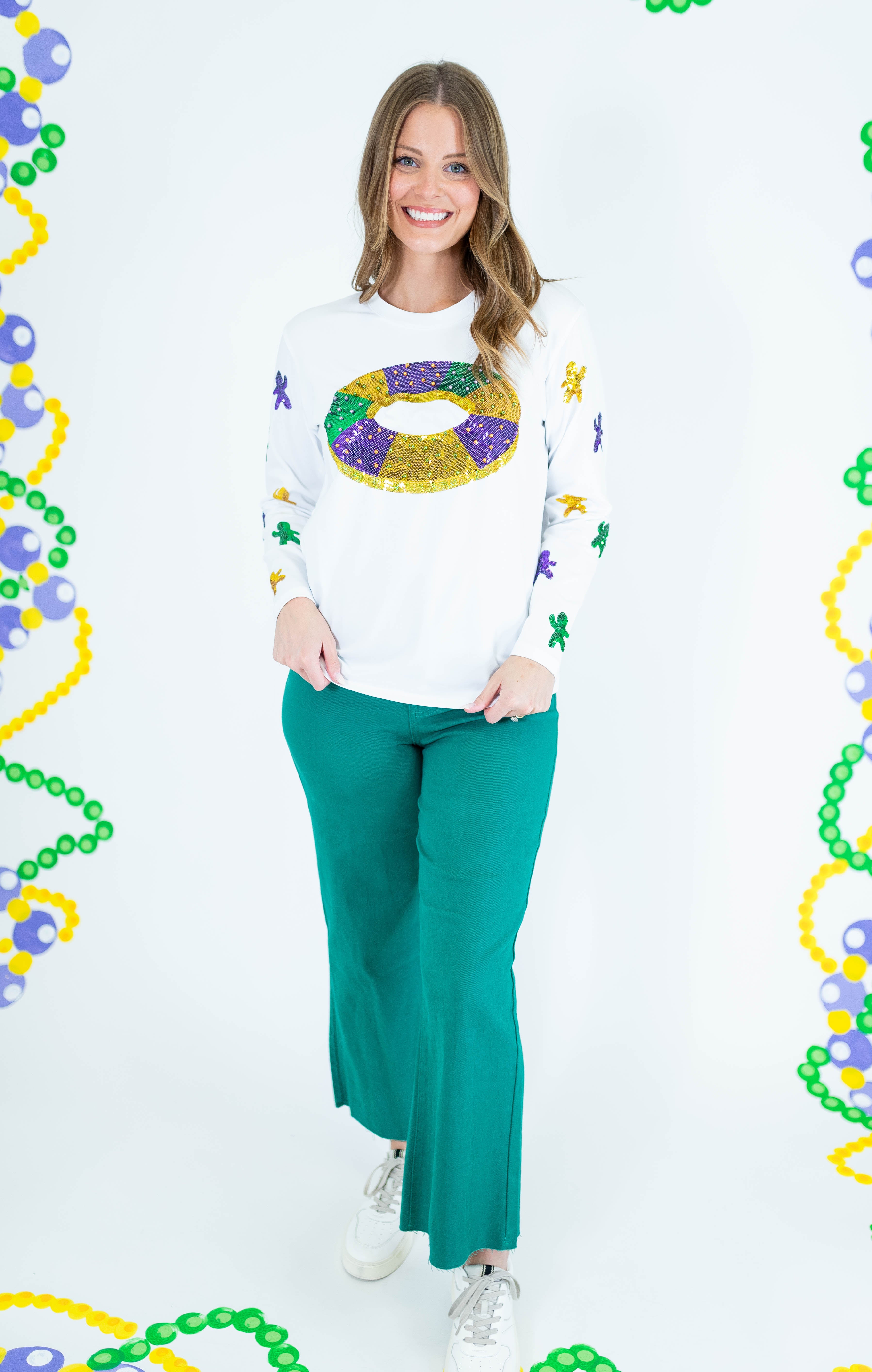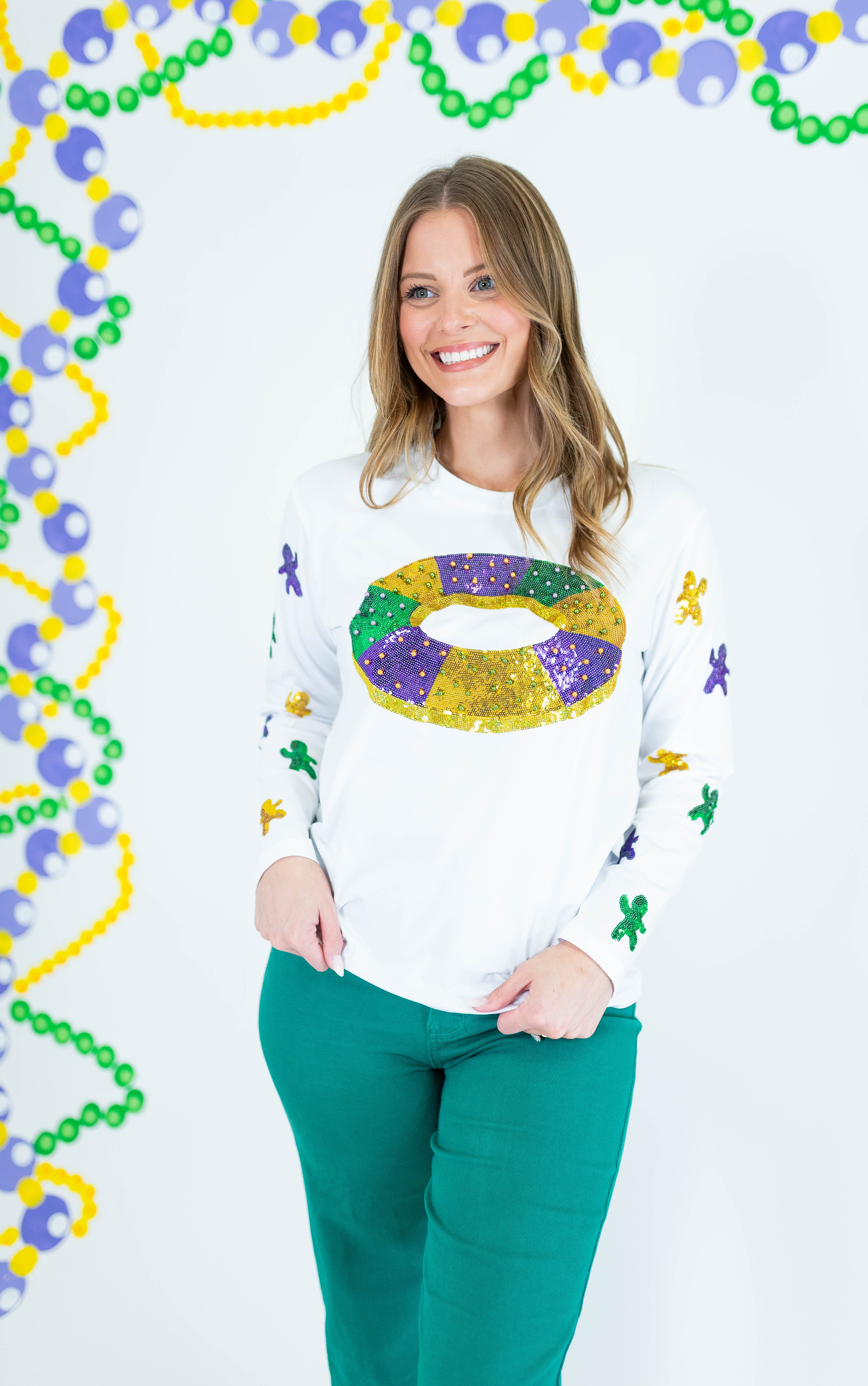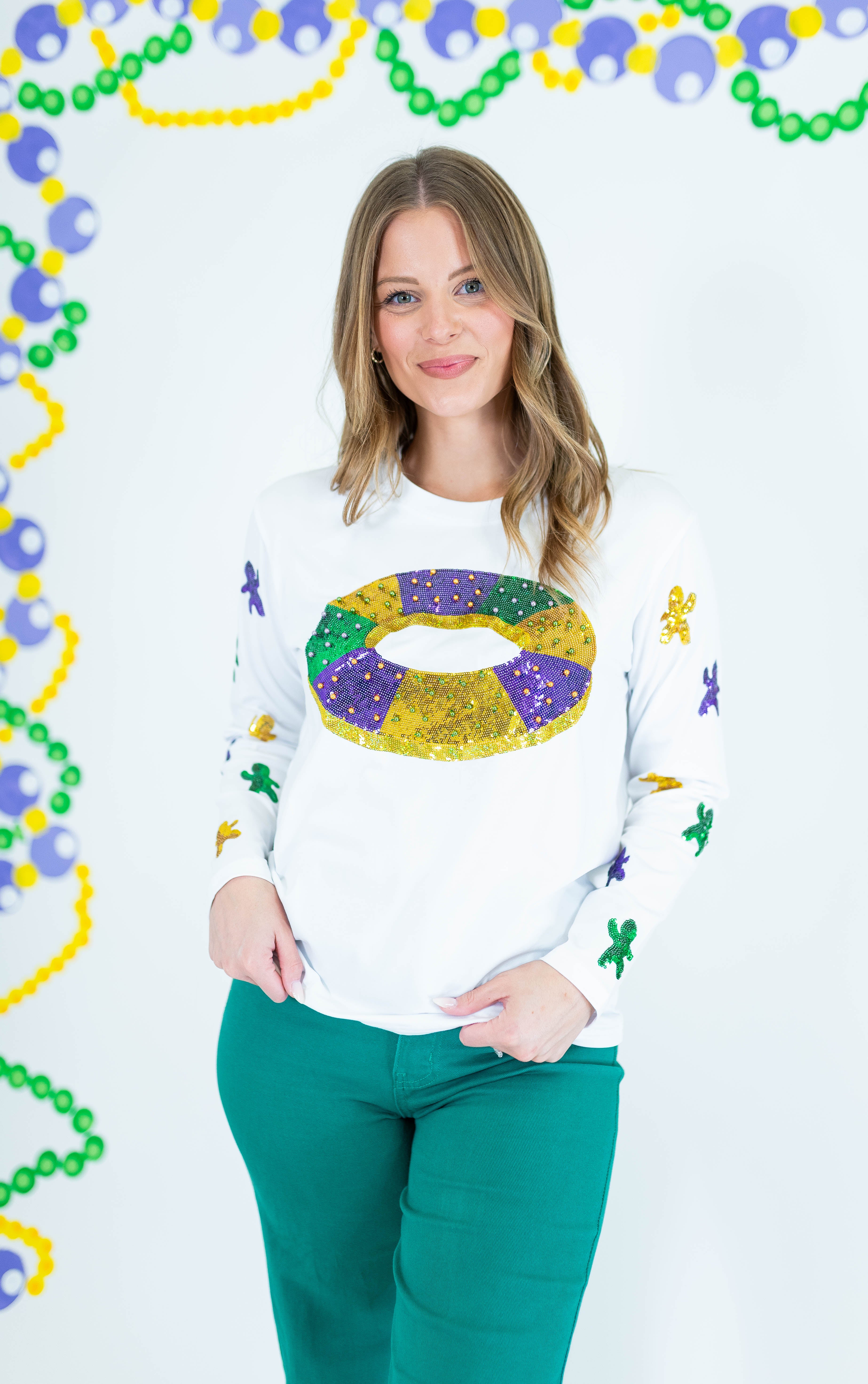 Celebrate Mardi Gras in style with this eye-catching sequin long sleeve tee featuring the iconic King Cake Baby design. The shimmering sequin details catch the light with every move, making you the center of attention at any festive gathering. Crafted from comfortable fabric, this white shirt blends playful holiday spirit with wearable sophistication. Perfect for parades, parties, or anyone who loves the vibrant energy of New Orleans traditions. Make your Mardi Gras statement unforgettable.