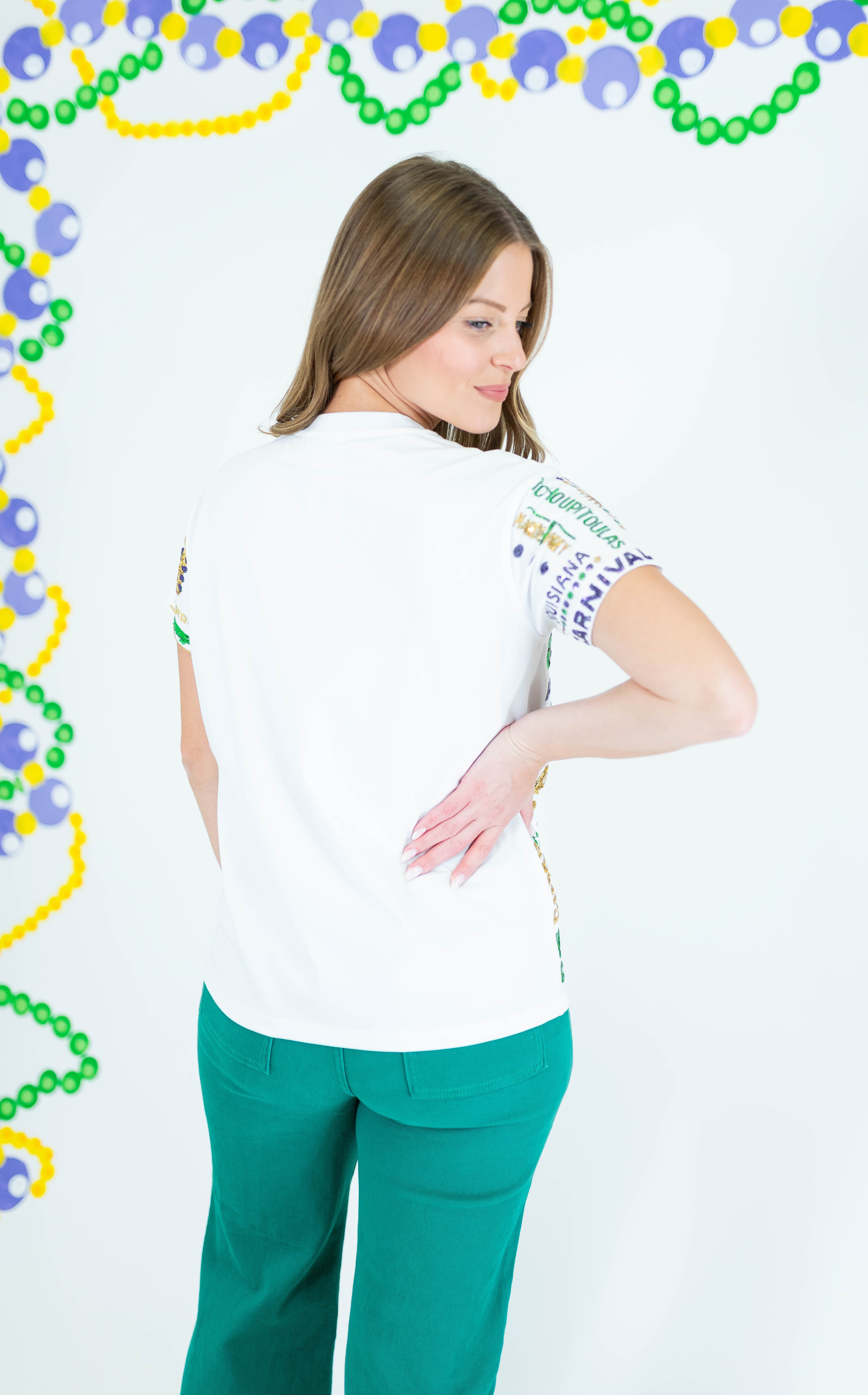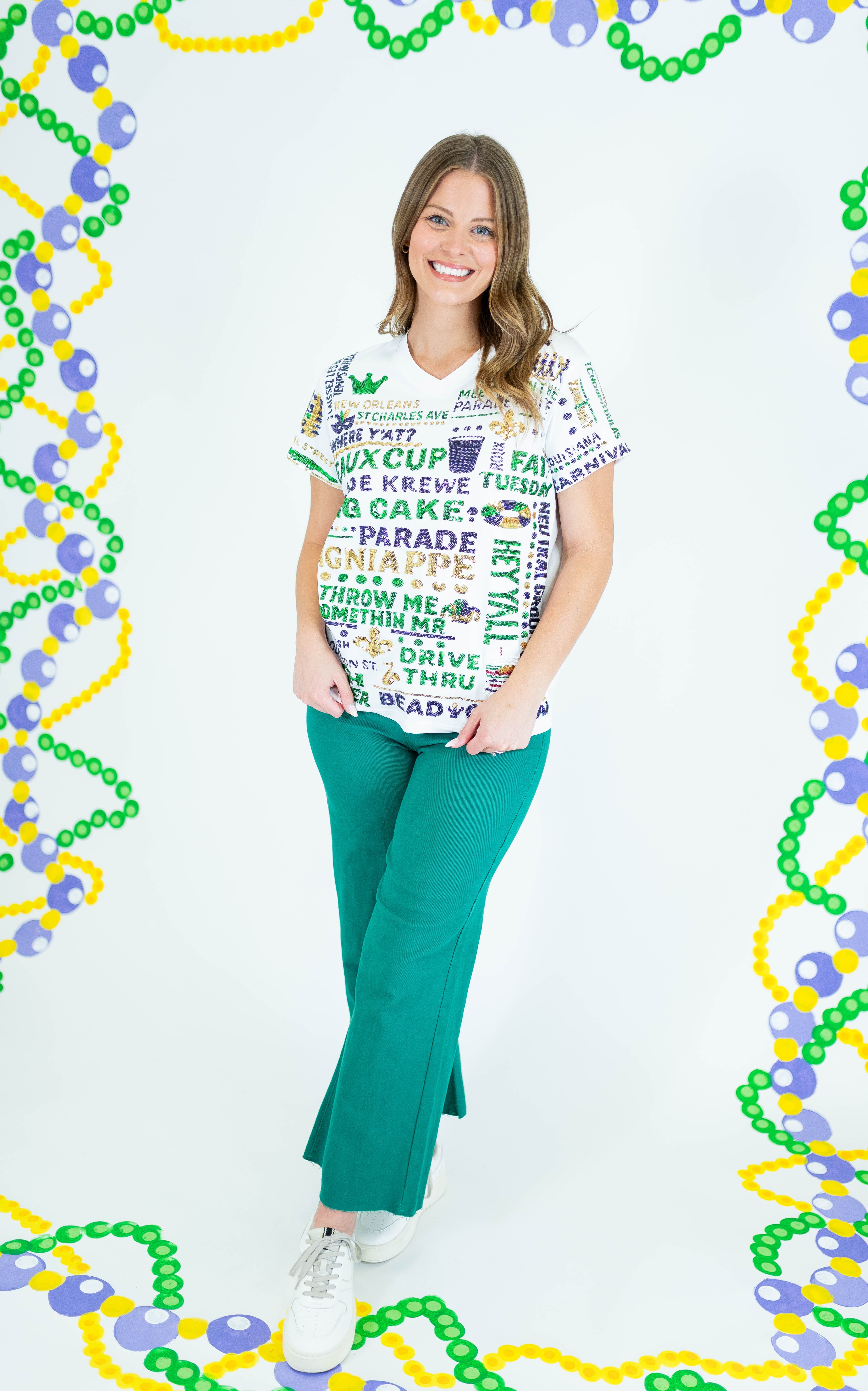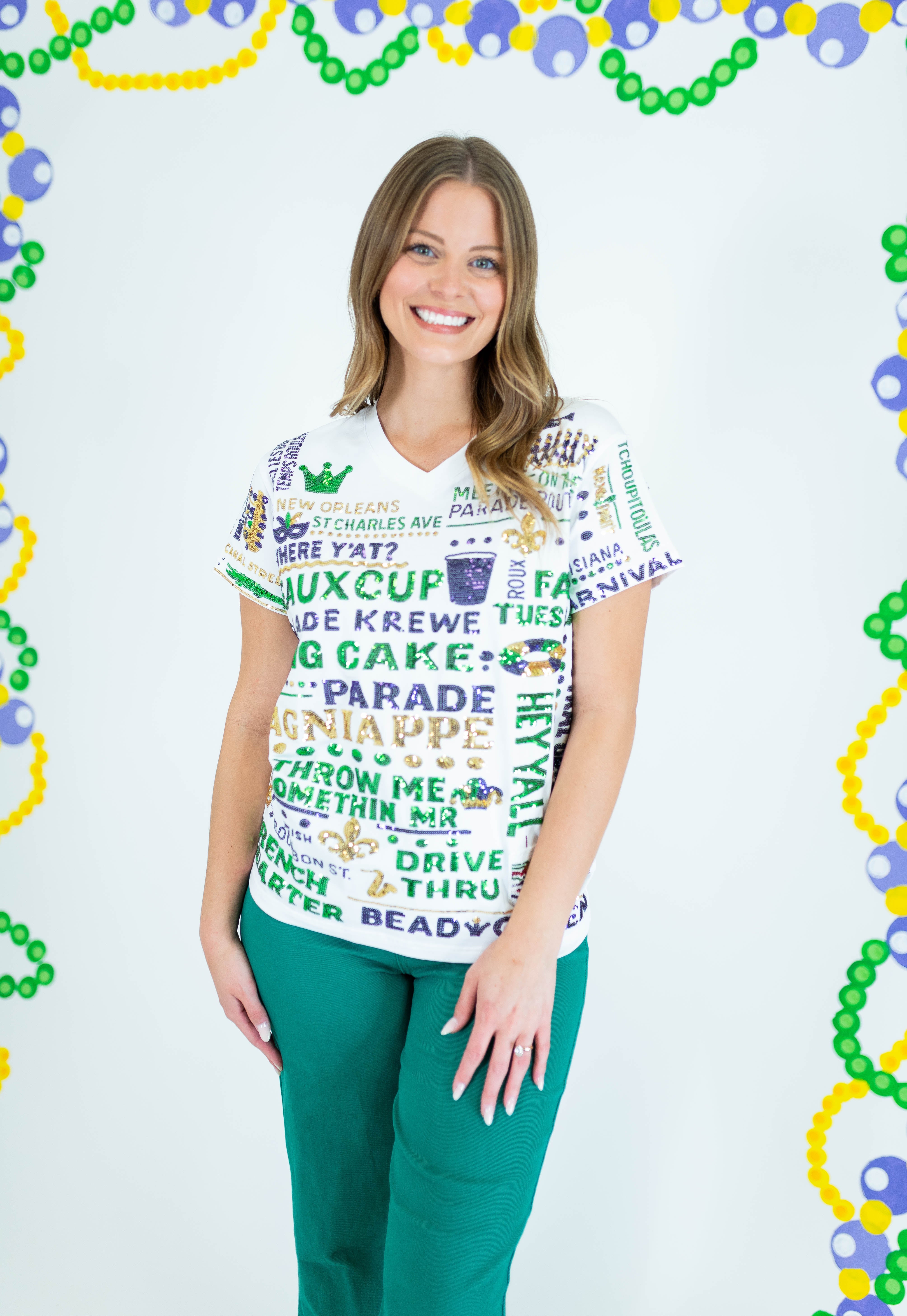 Celebrate the vibrant spirit of Mardi Gras with this eye-catching sequin tee that brings festive flair to your wardrobe. Featuring shimmering sequin detailing that catches the light with every move, this shirt transforms a classic silhouette into a statement piece perfect for parades, parties, and celebrations. The playful "Lagniappe" design—a nod to New Orleans tradition—adds authentic charm and conversation-starting style. Comfortable enough for all-day wear yet dazzling enough to turn heads, this tee lets you embrace the joy and energy of the season. Make every day feel like a celebration.