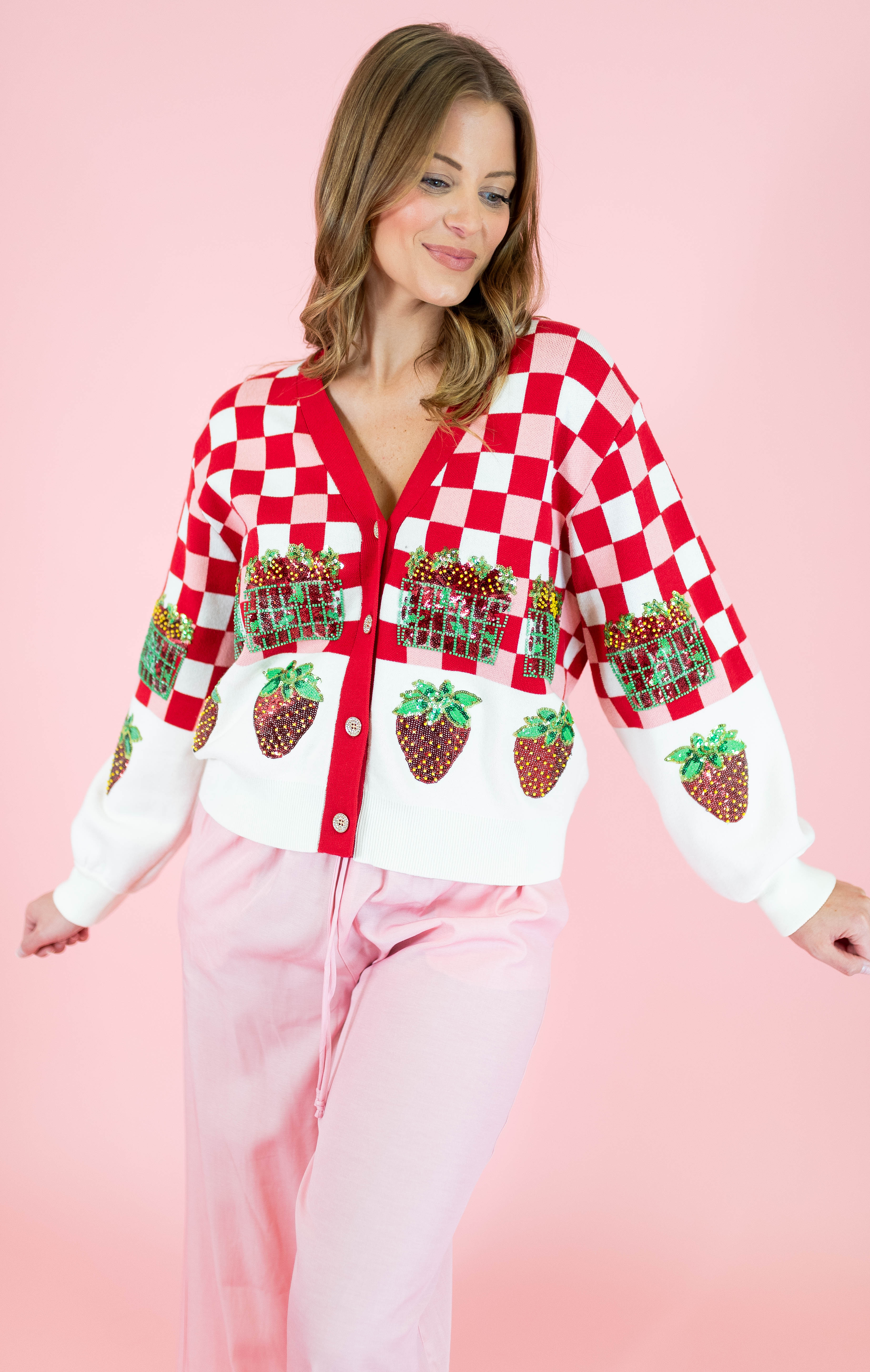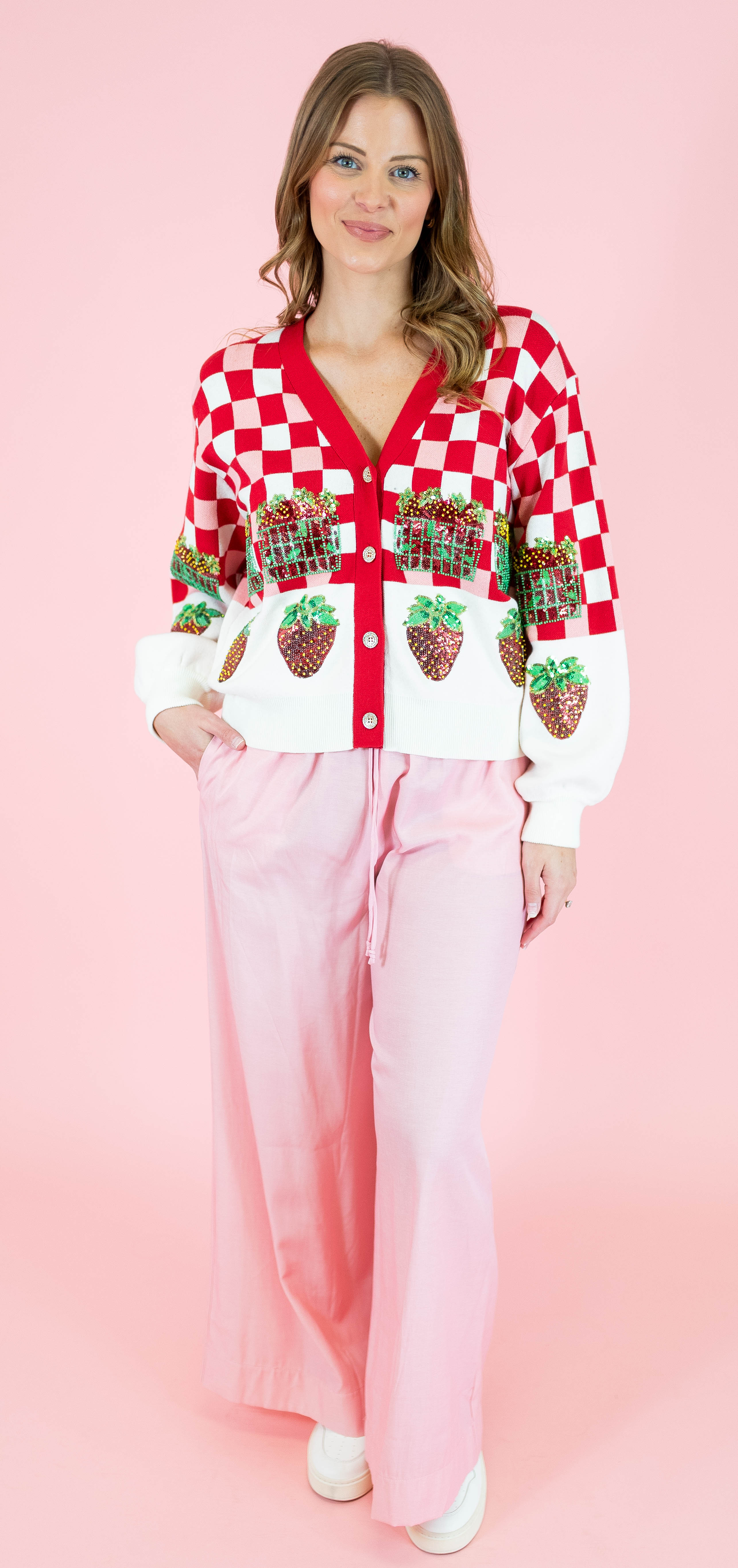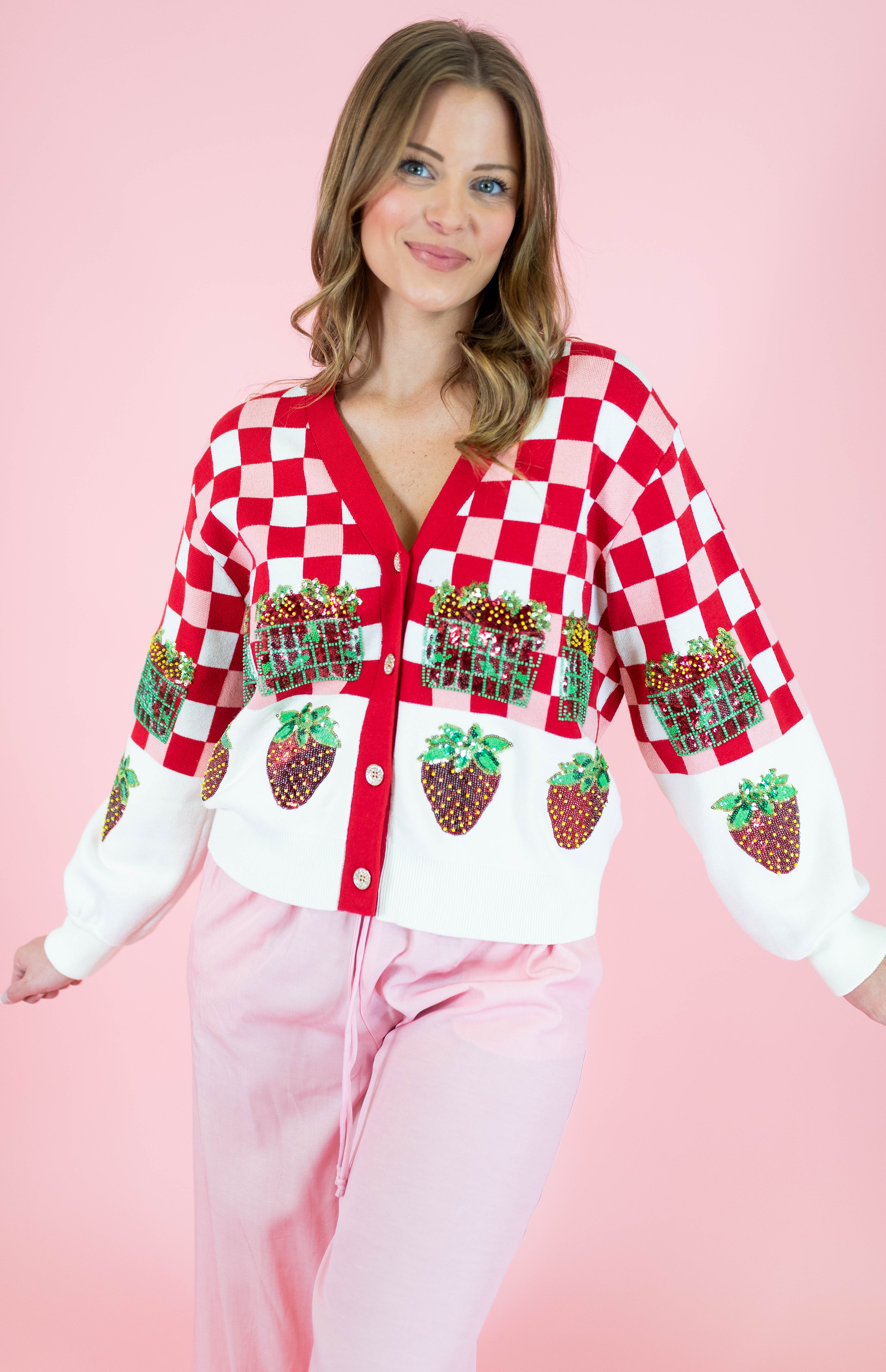 Embrace your sweetest style with this adorable Queen Of Sparkles cardigan featuring a charming red and white checkered pattern adorned with strawberry details. Perfect for strawberry season and spring adventures, this button-up layer brings whimsical fun to any outfit. The playful design captures that carefree festival spirit while the classic cardigan silhouette keeps it versatile for everyday wear. Whether you're heading to a farmers market or just spreading joy, this piece is your ticket to looking absolutely delightful.