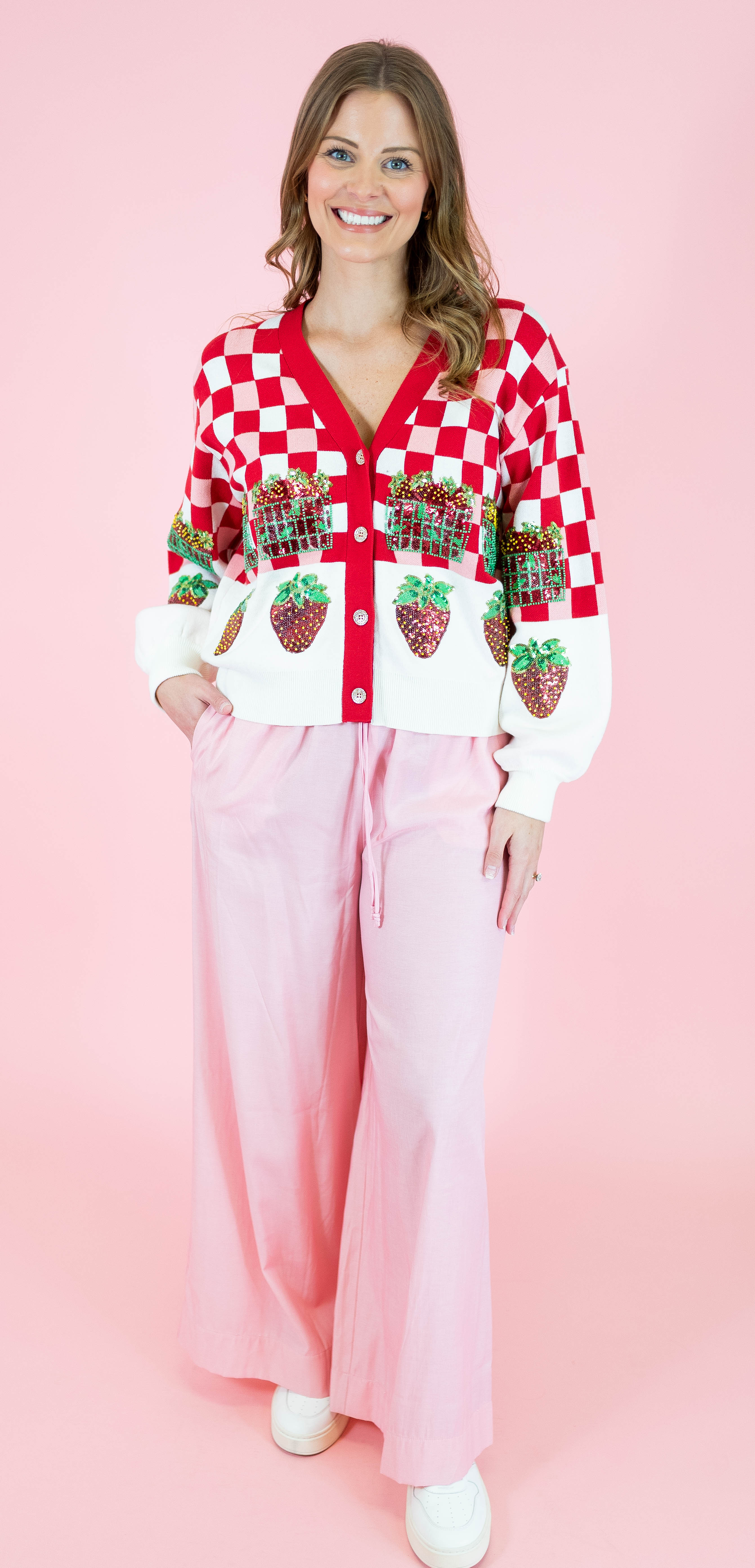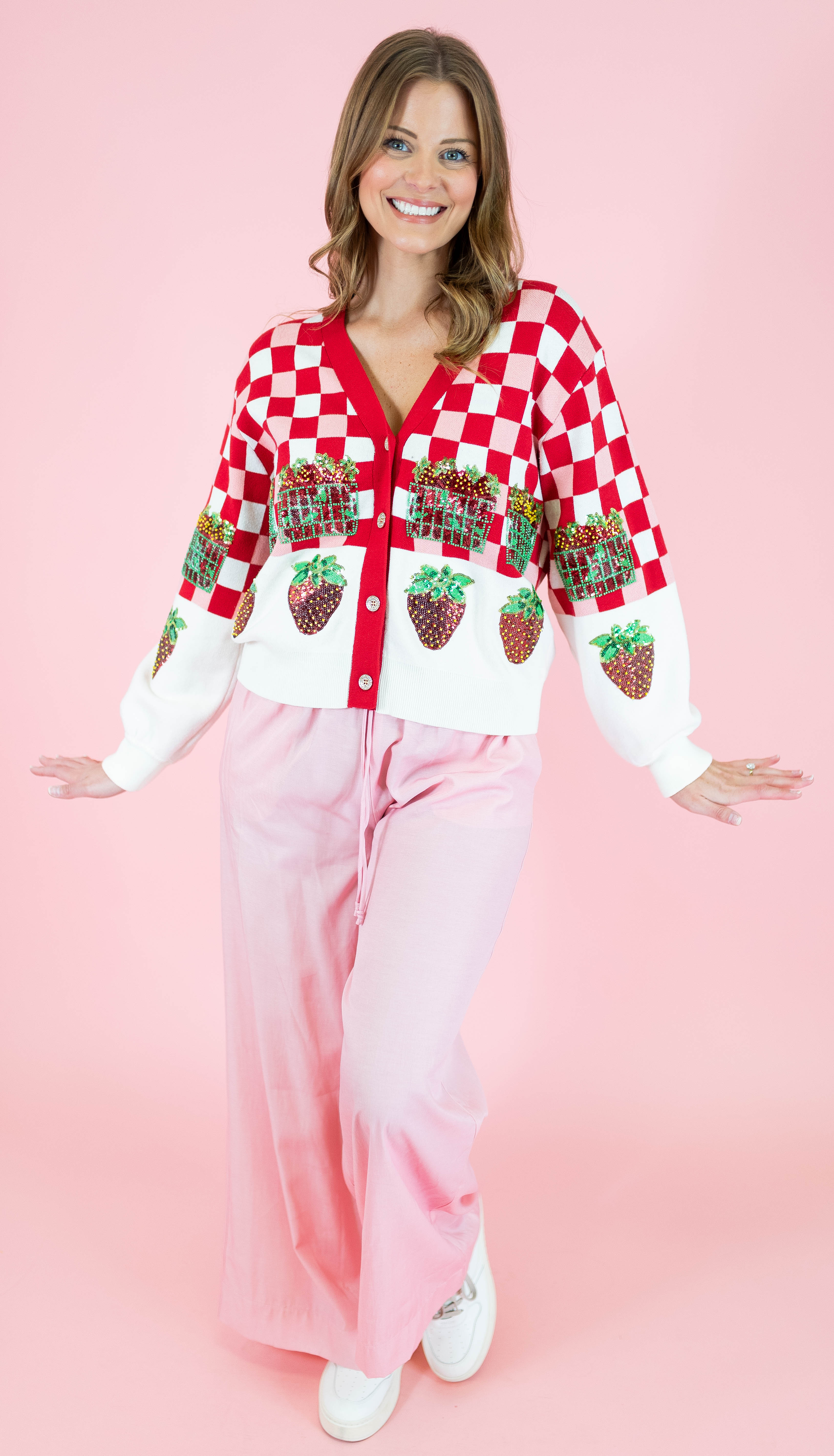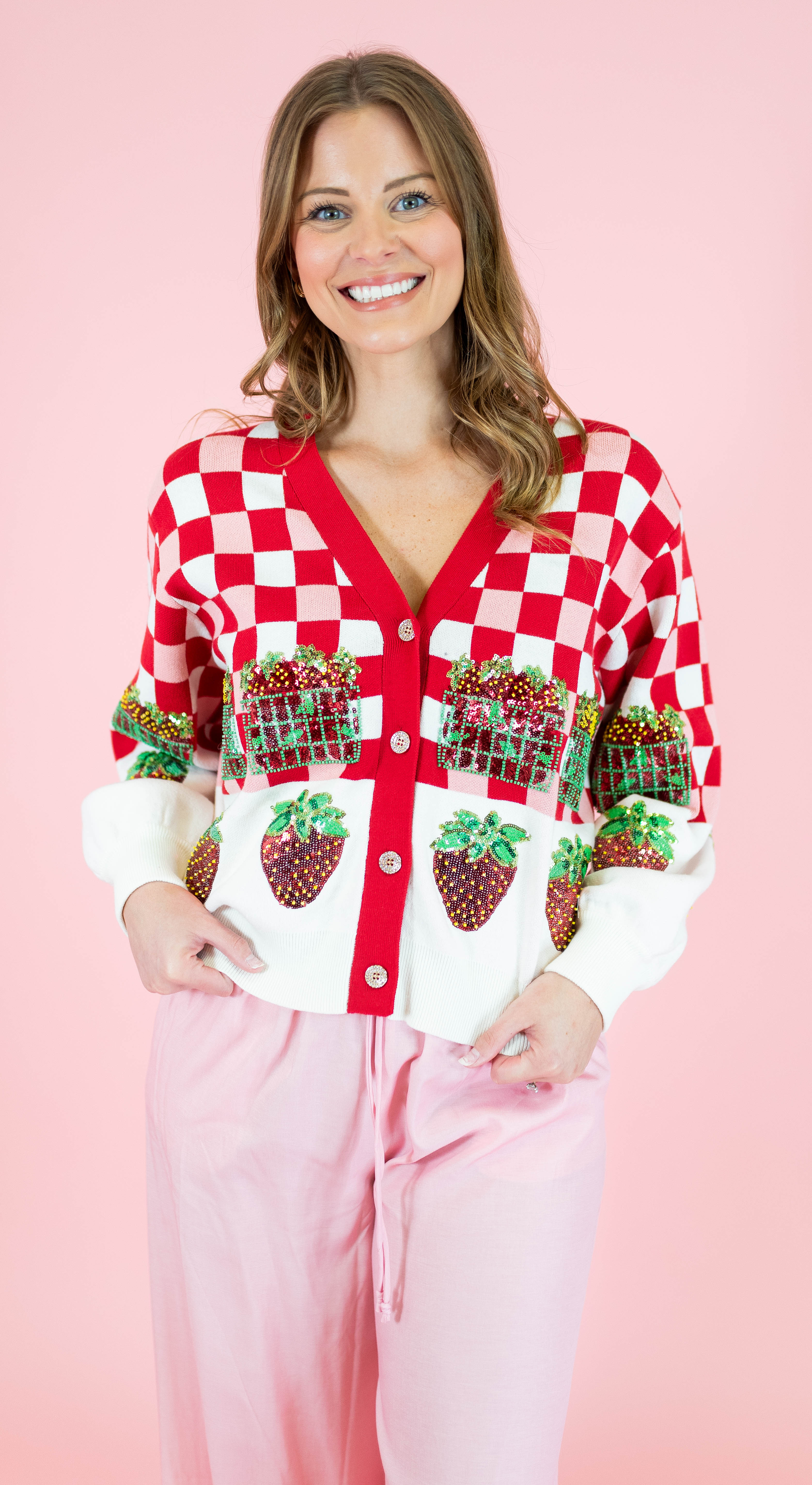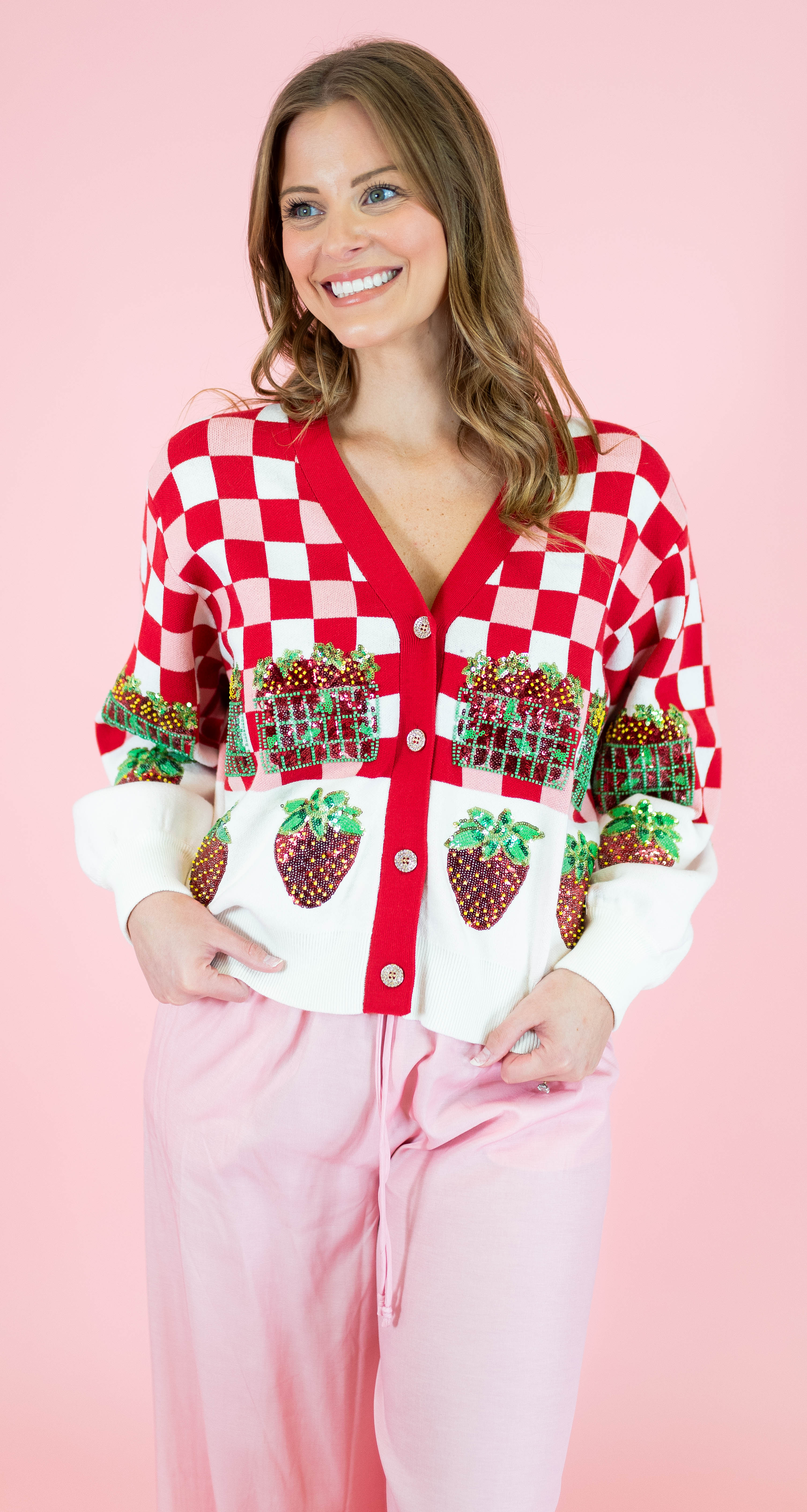 Embrace your sweetest style with this adorable Queen Of Sparkles cardigan featuring a charming red and white checkered pattern adorned with strawberry details. Perfect for strawberry season and spring adventures, this button-up layer brings whimsical fun to any outfit. The playful design captures that carefree festival spirit while the classic cardigan silhouette keeps it versatile for everyday wear. Whether you're heading to a farmers market or just spreading joy, this piece is your ticket to looking absolutely delightful.