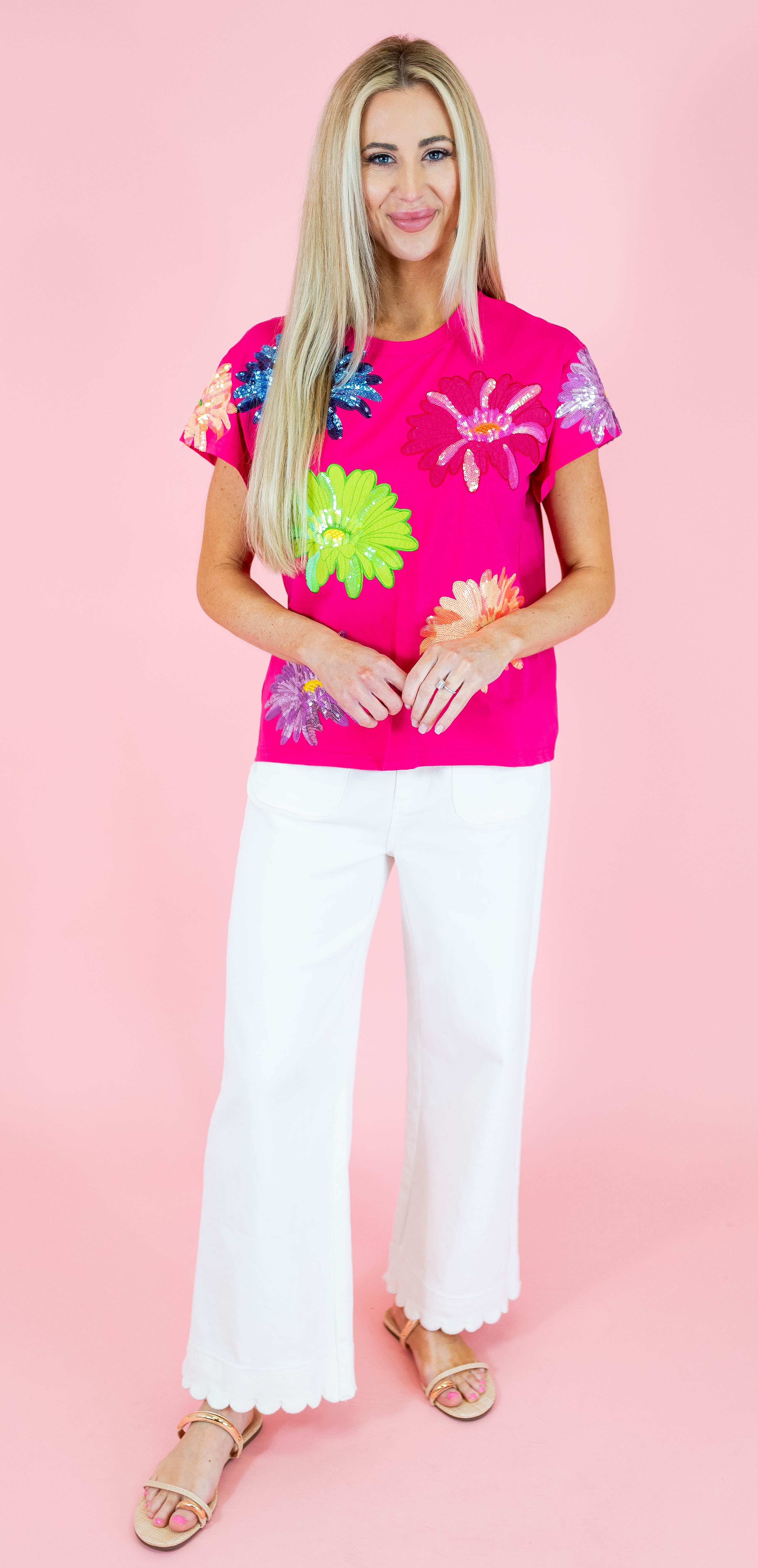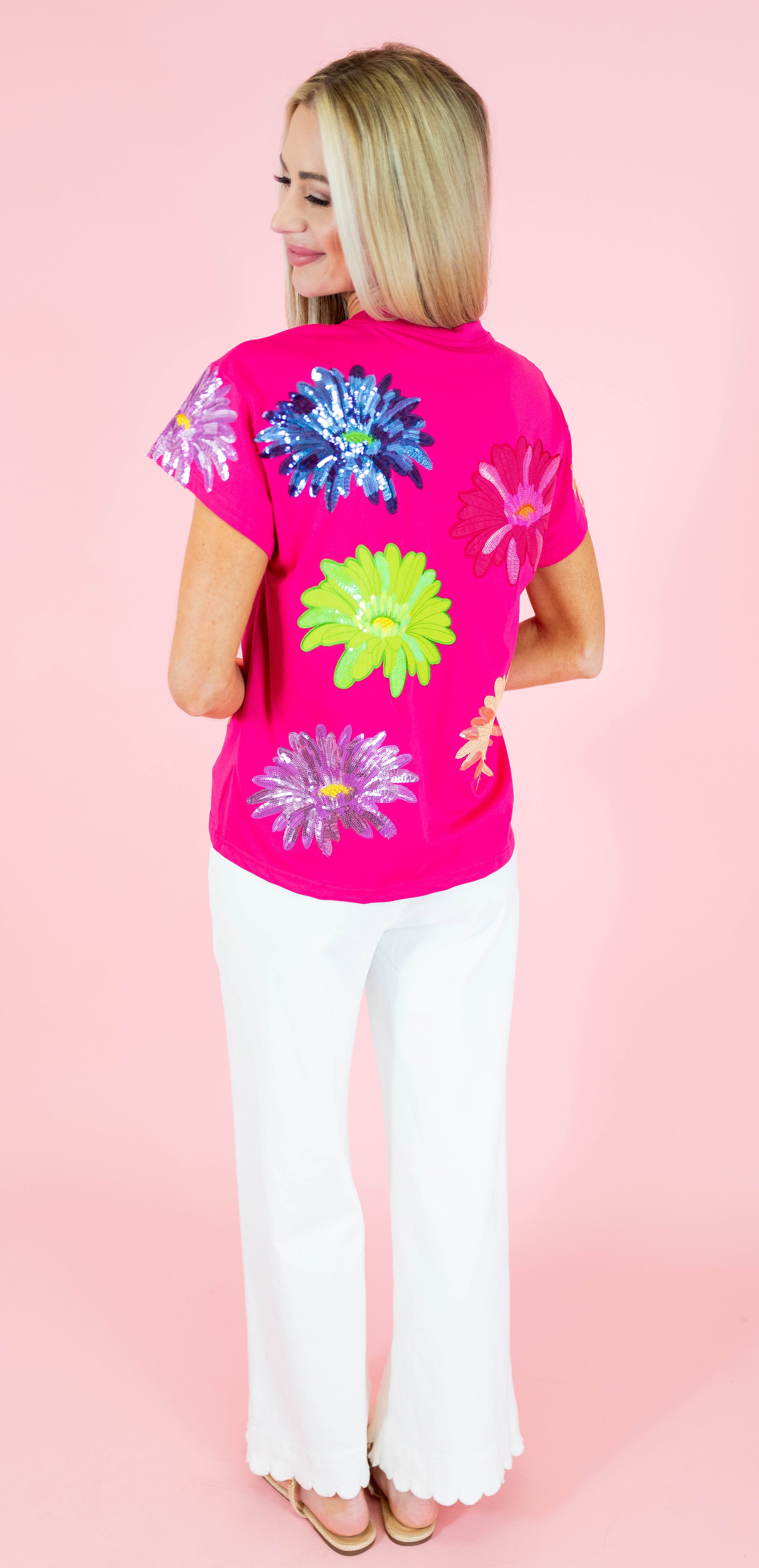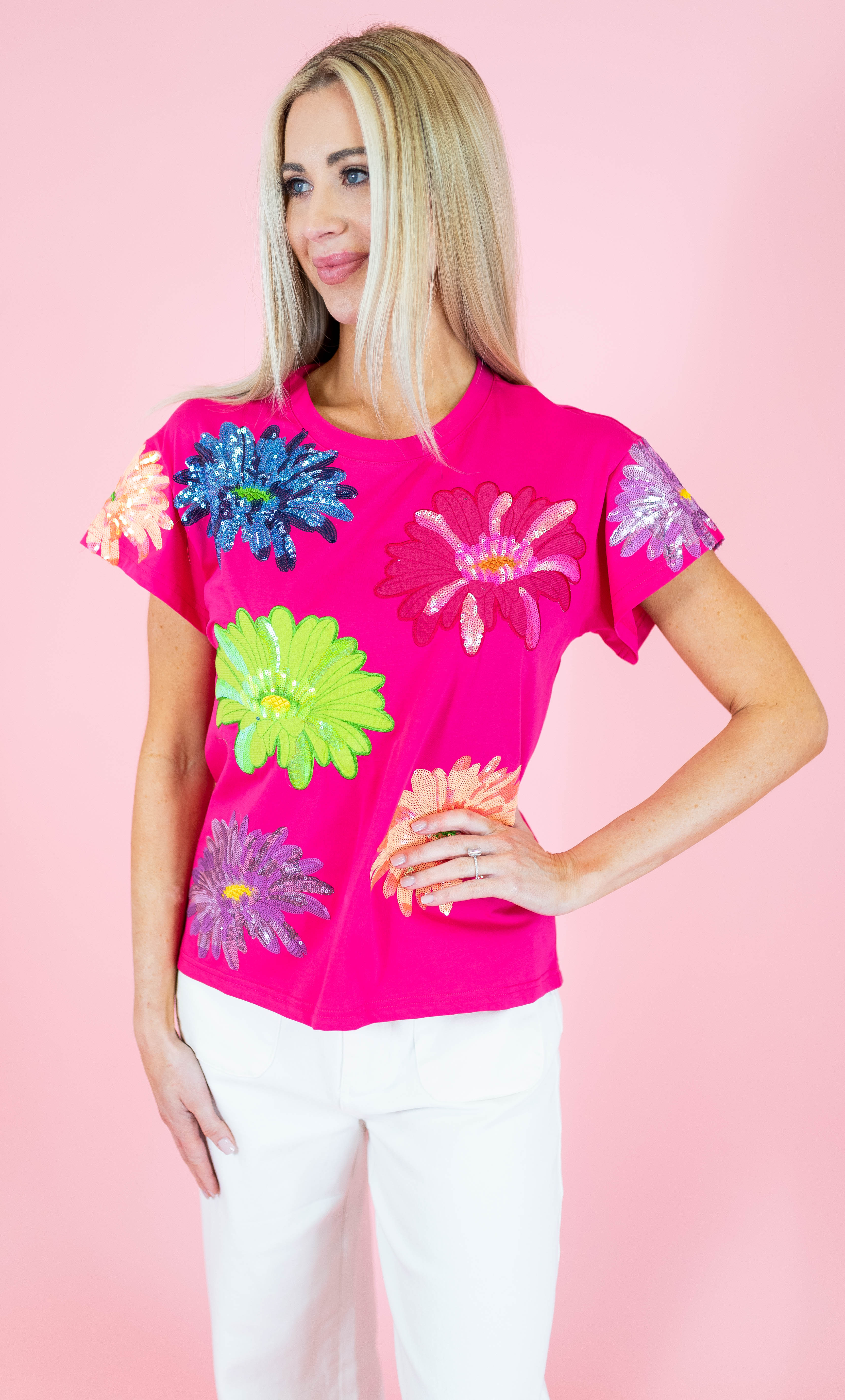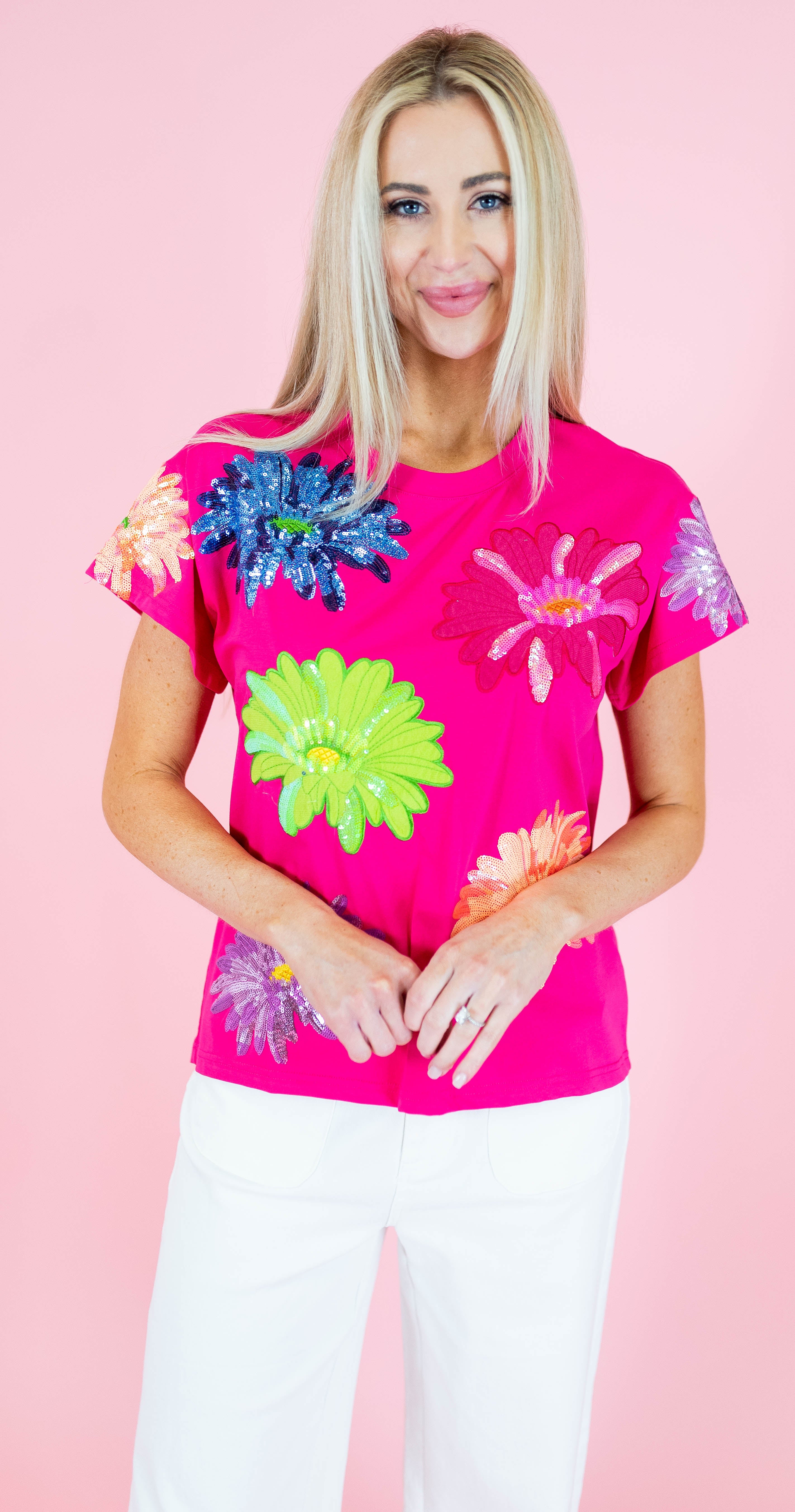 Queen Of Sparkles: Hot Pink Multi Flower Tee