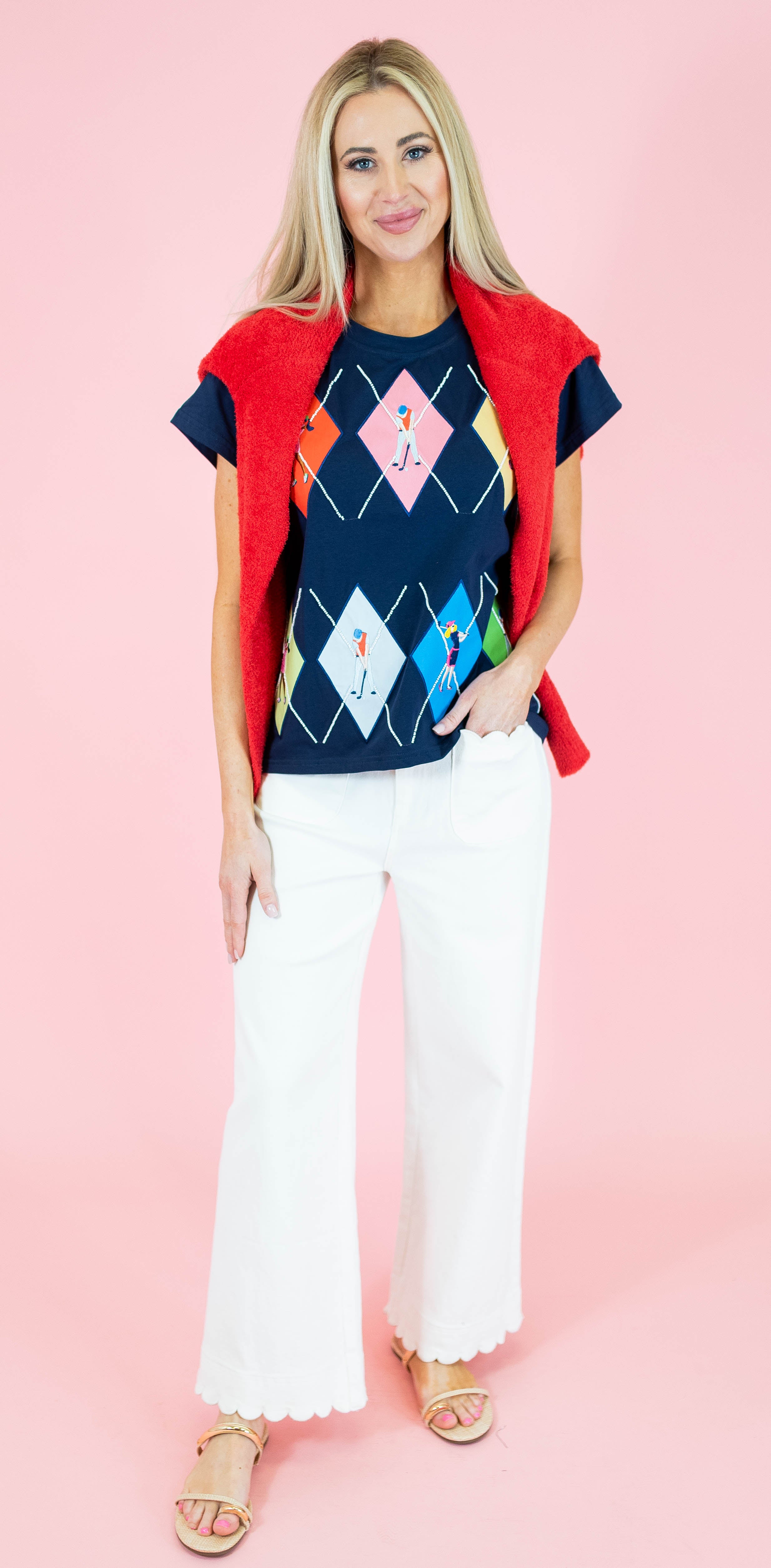 Tee off in style with this navy multi argyle golfer tee from Queen Of Sparkles! Featuring a classic argyle pattern in rich navy tones, this playful piece brings preppy charm to your golf game or casual wardrobe. The relaxed fit and quality construction make it perfect for the course or everyday wear. Whether you're a golf enthusiast or just love the timeless argyle aesthetic, this tee delivers personality with every wear. Sparkle-approved and ready to make you the star of the fairway!