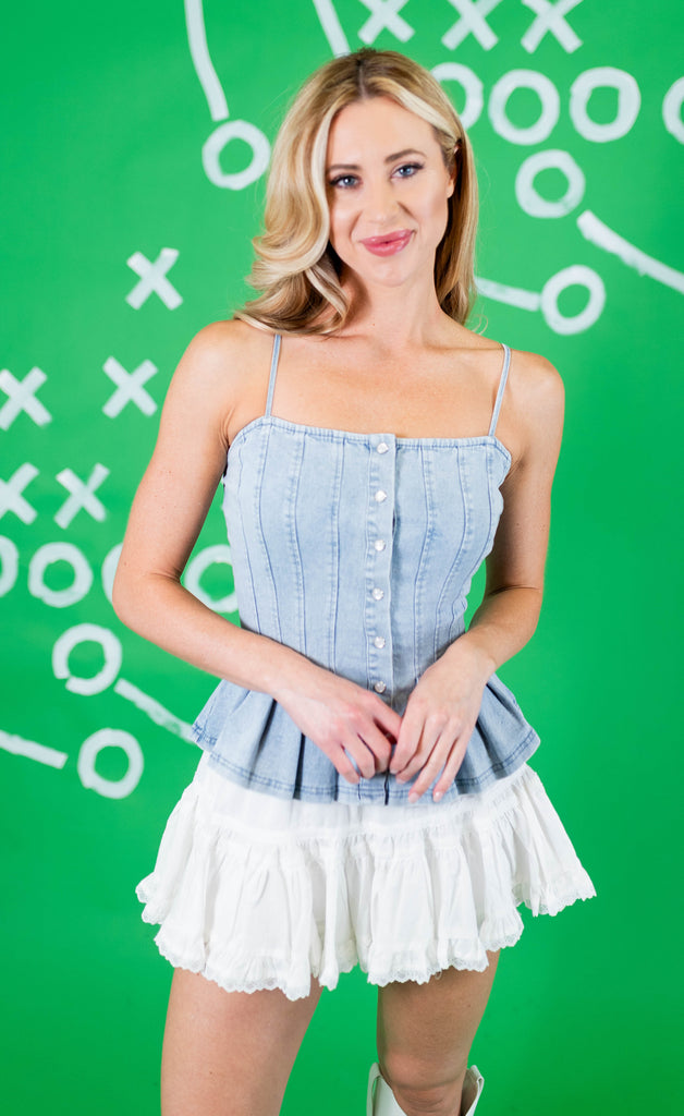 Crepe Wavy Cutout Mini Skirt with Shiny Silver Buttons - White