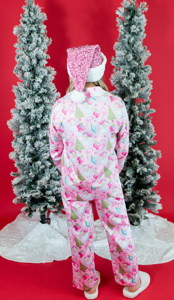 Wrap yourself in festive comfort with the Baby It's Cold Outside Silky Satin Pajama Set. This long-sleeve, candy pink ensemble features charming Christmas decorations that bring holiday cheer to your loungewear. Made from smooth satin, it offers a luxurious feel that’s gentle on the skin, perfect for cozy winter nights or holiday mornings. Elevate your seasonal relaxation with pajamas that blend style, softness, and festive spirit effortlessly.