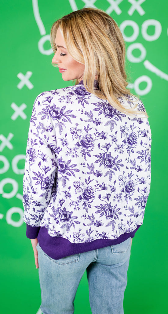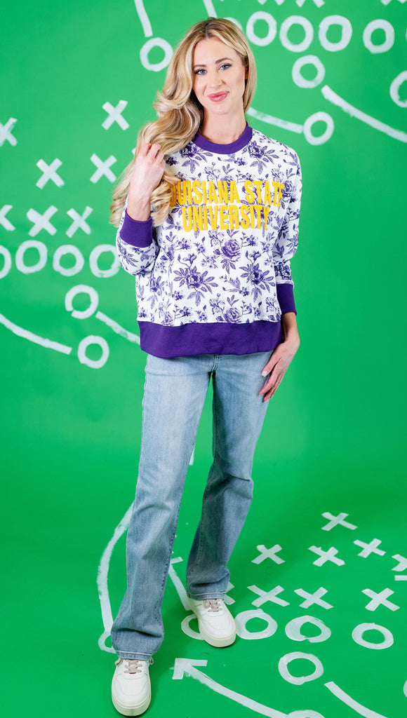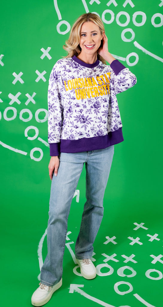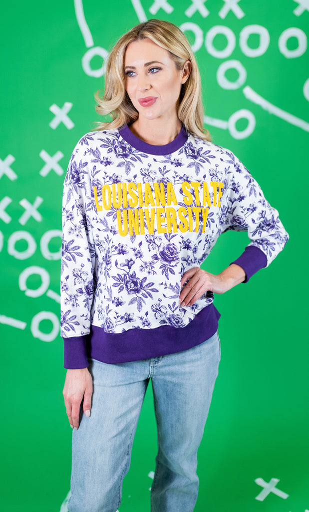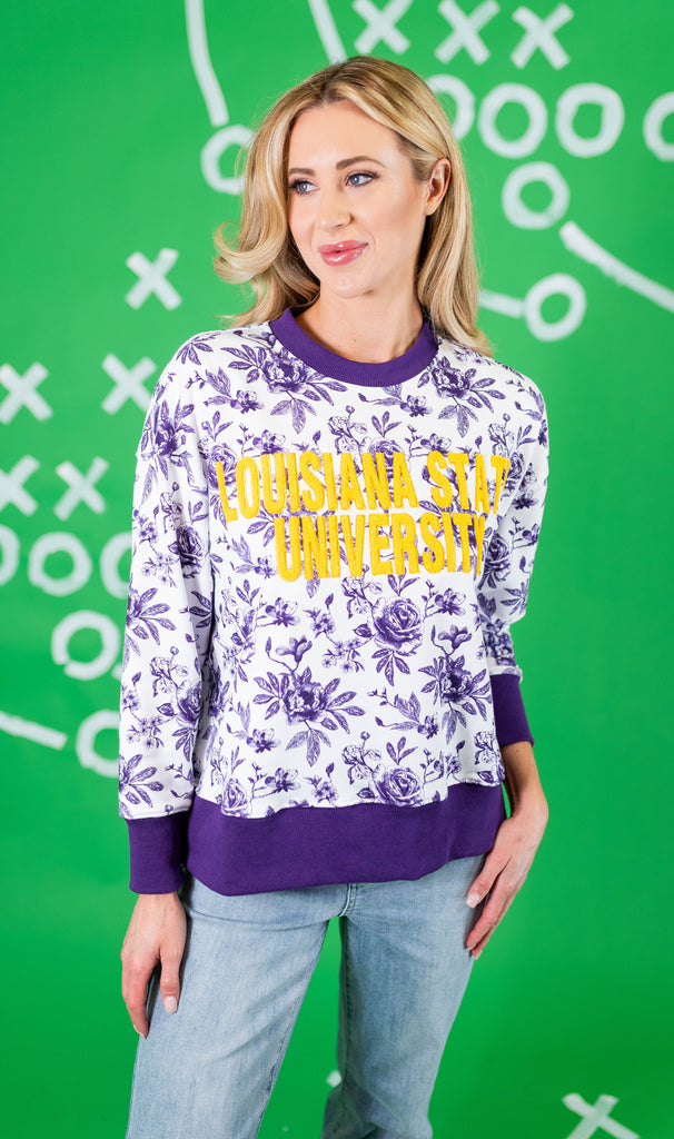 Elevate your game day look with this oversized cotton sweatshirt featuring feminine, floral toile motif in LSU team colors.