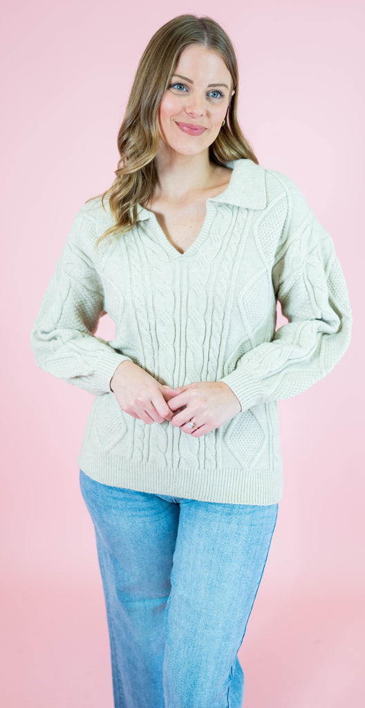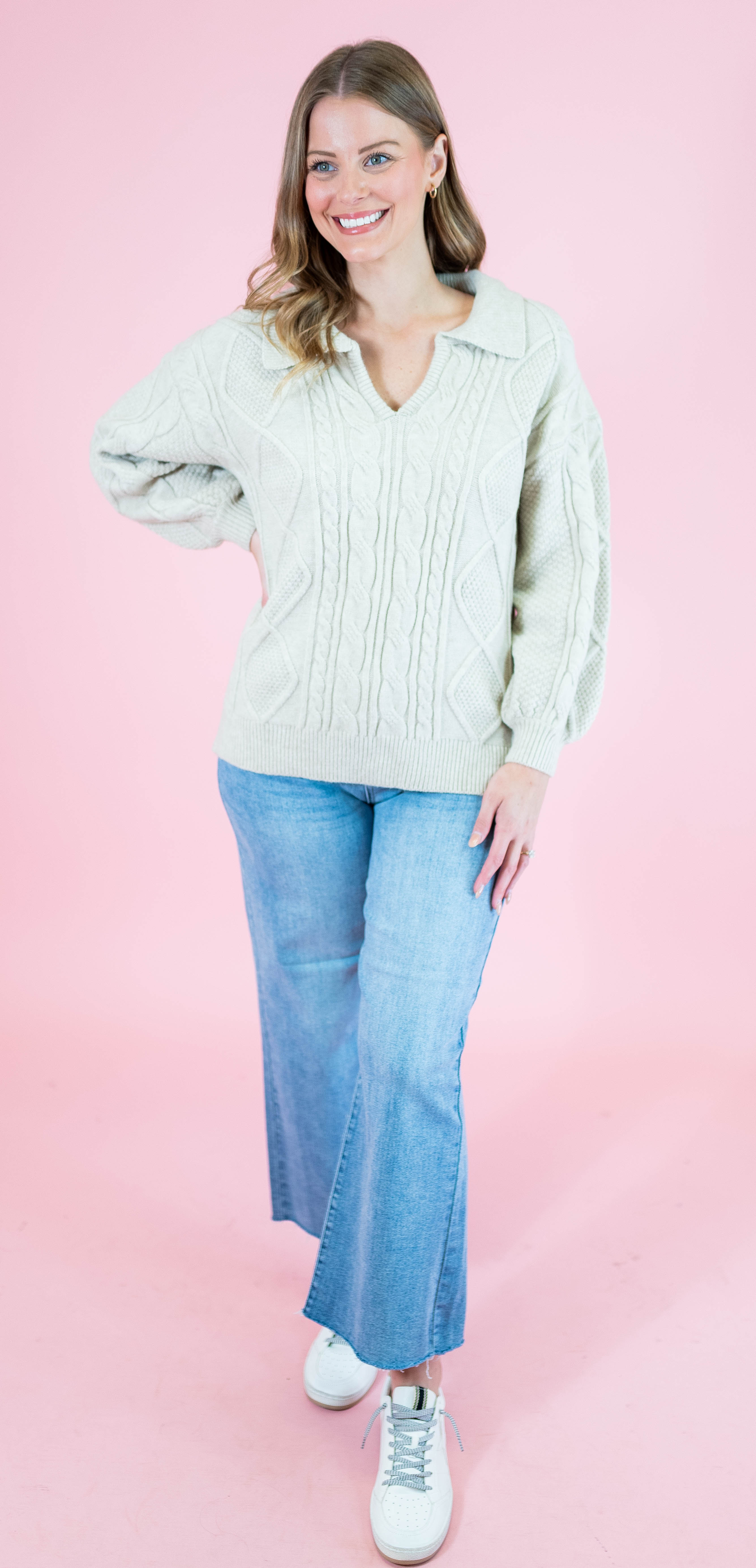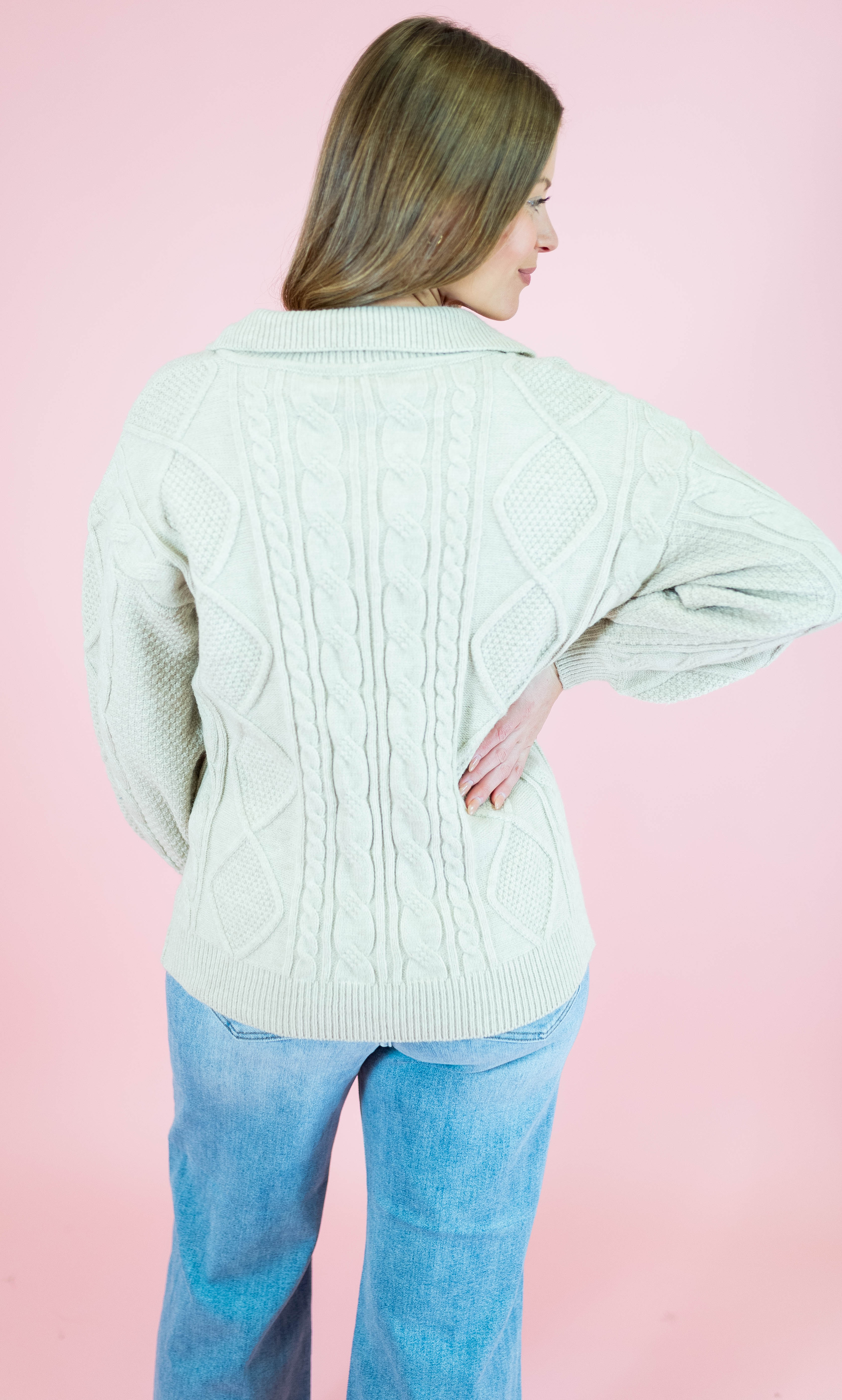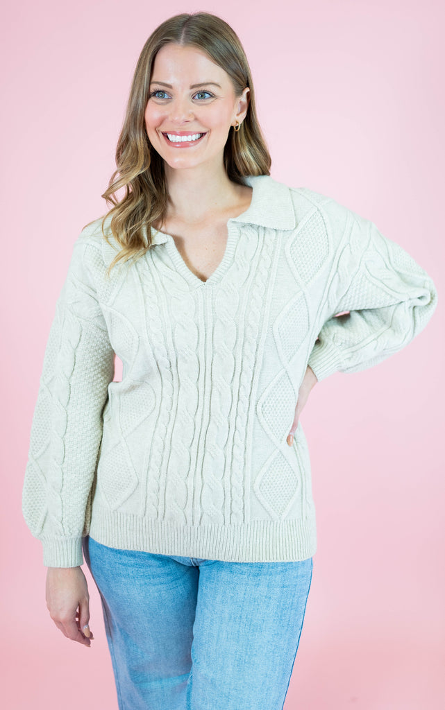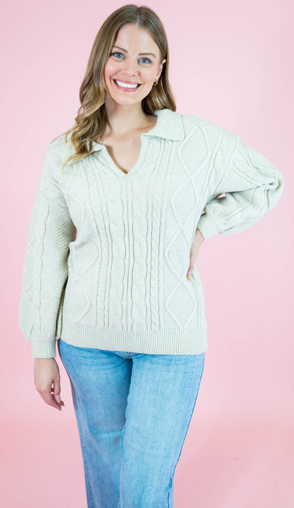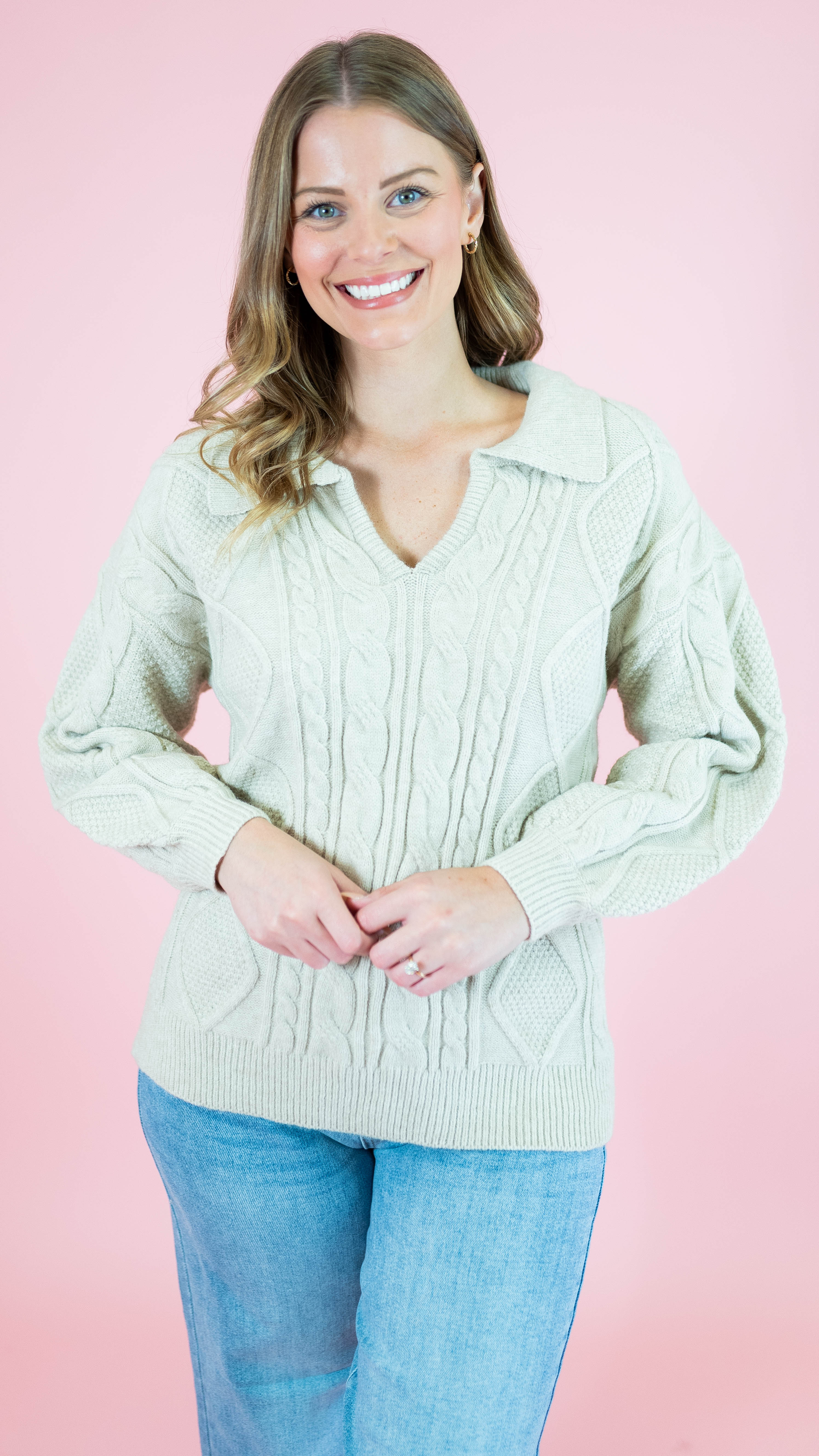 Long Sleeve Collar Cable Knit Sweater - LT Taupe