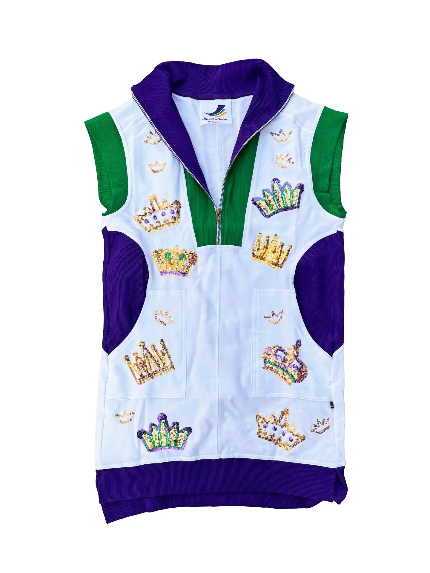Add a playful tennis-inspired touch to your Mardi Gras look with this colorblock half zip dress! Featuring an allover Mardi Gras design of assorted crowns, it's perfect for a fun and unique look on and off the court and route. Wear it on its own or layer it over leggings for a versatile outfit. Game, set, match!