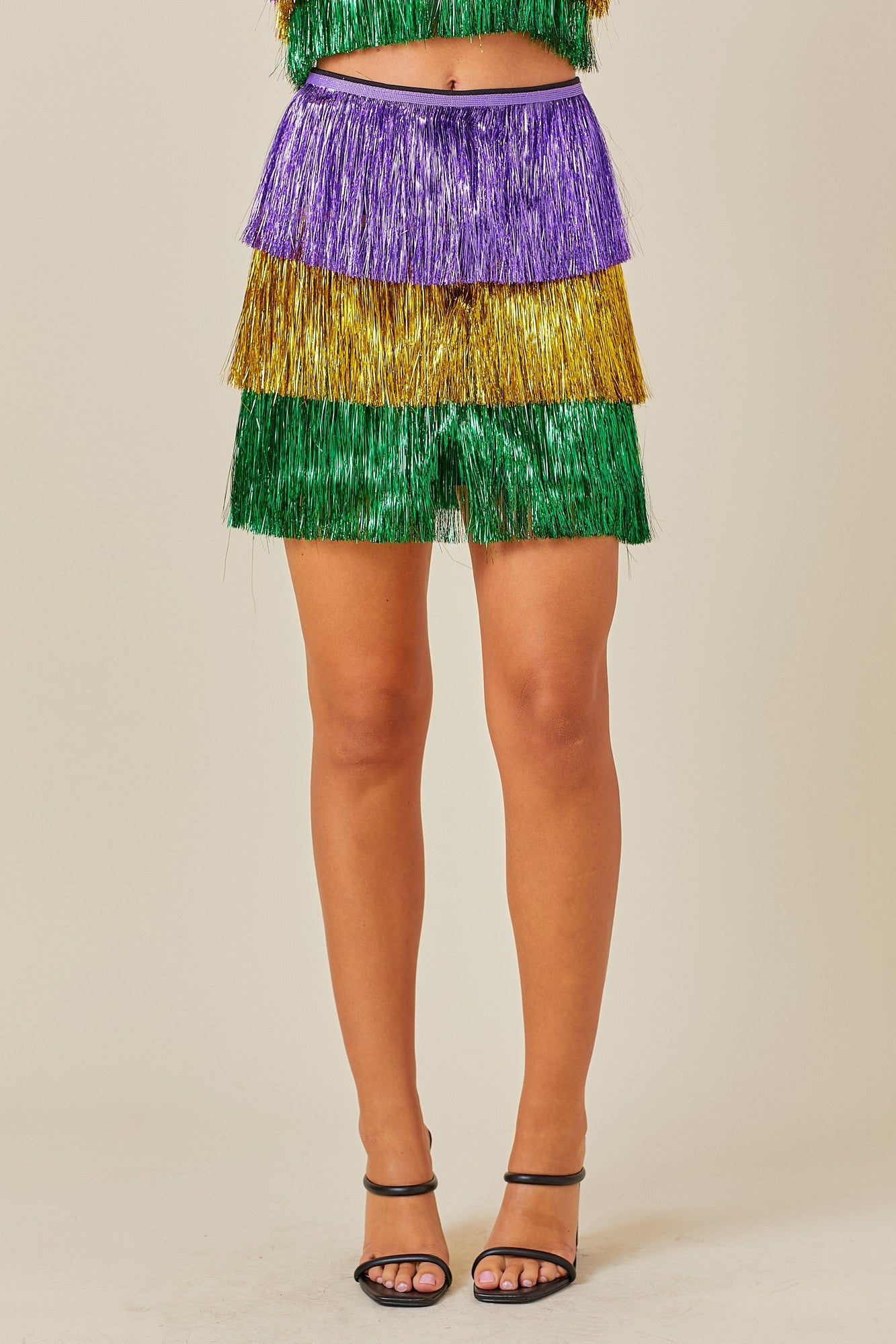 This Metallic Fringe Skirt - Mardi Gras is perfect for a night on the town. Cut from a lightweight fabric, this skirt features a stunning metallic fringe detail for added sparkle and movement. Complete the look with the matching top and make a statement.