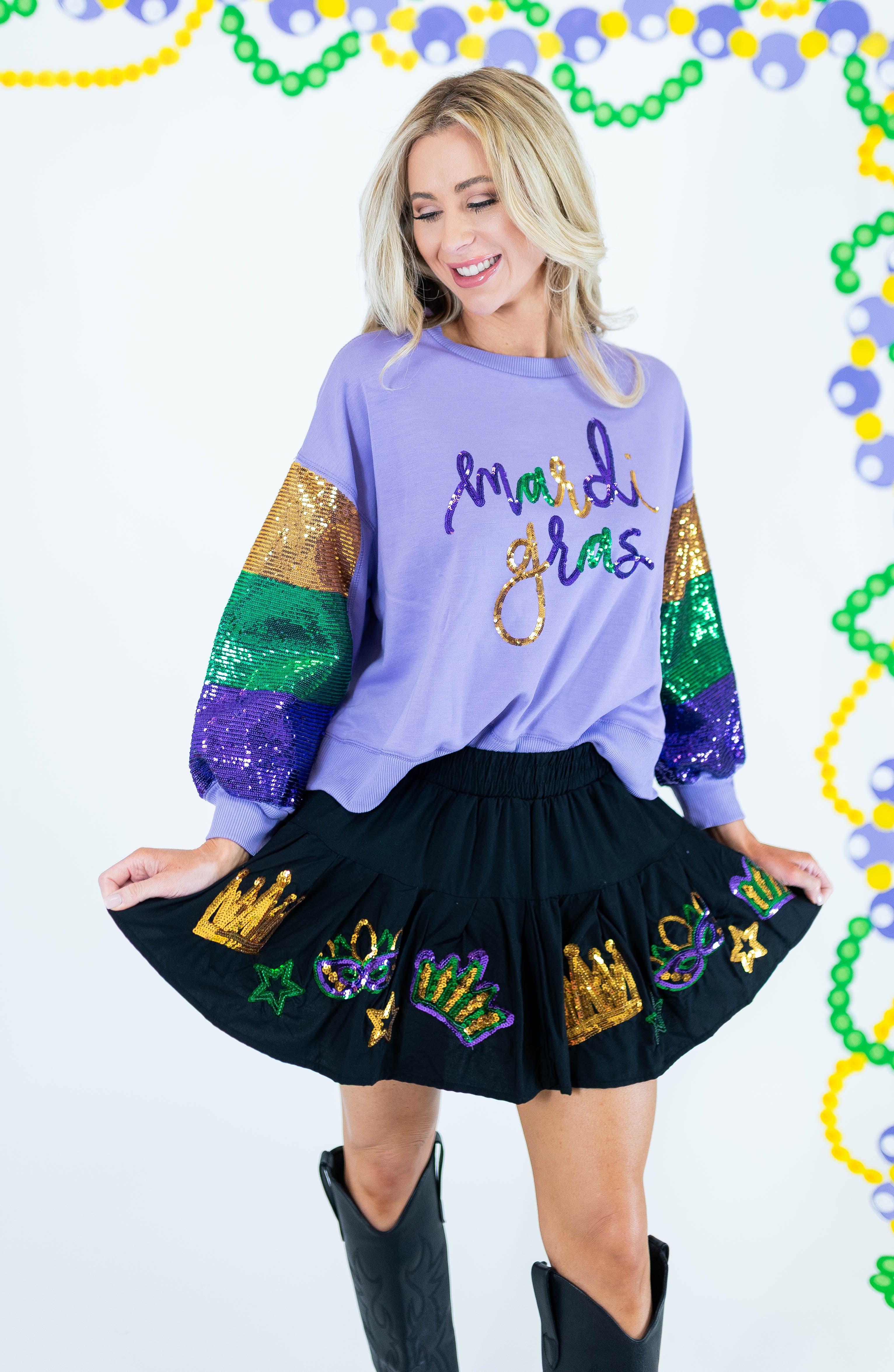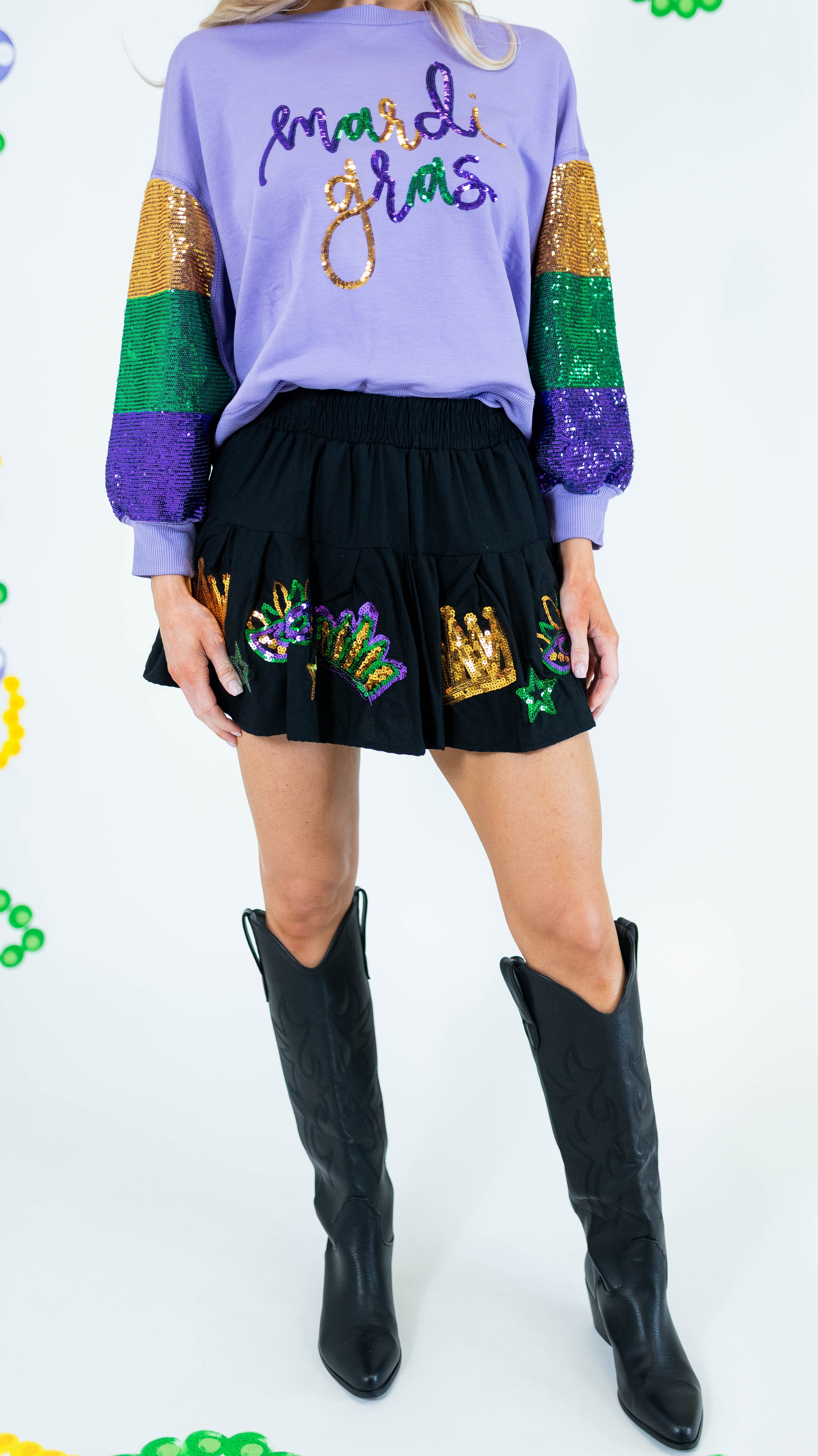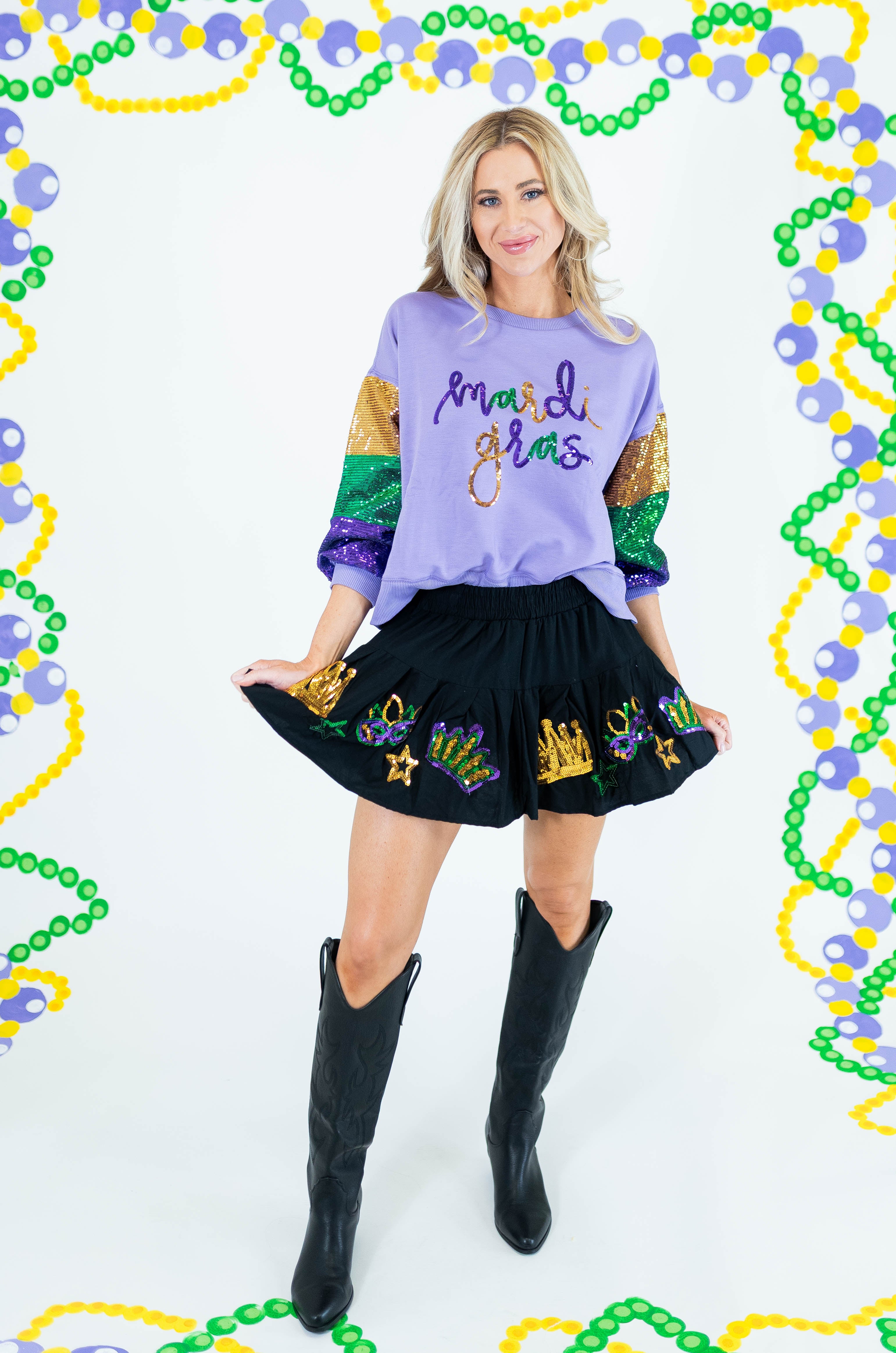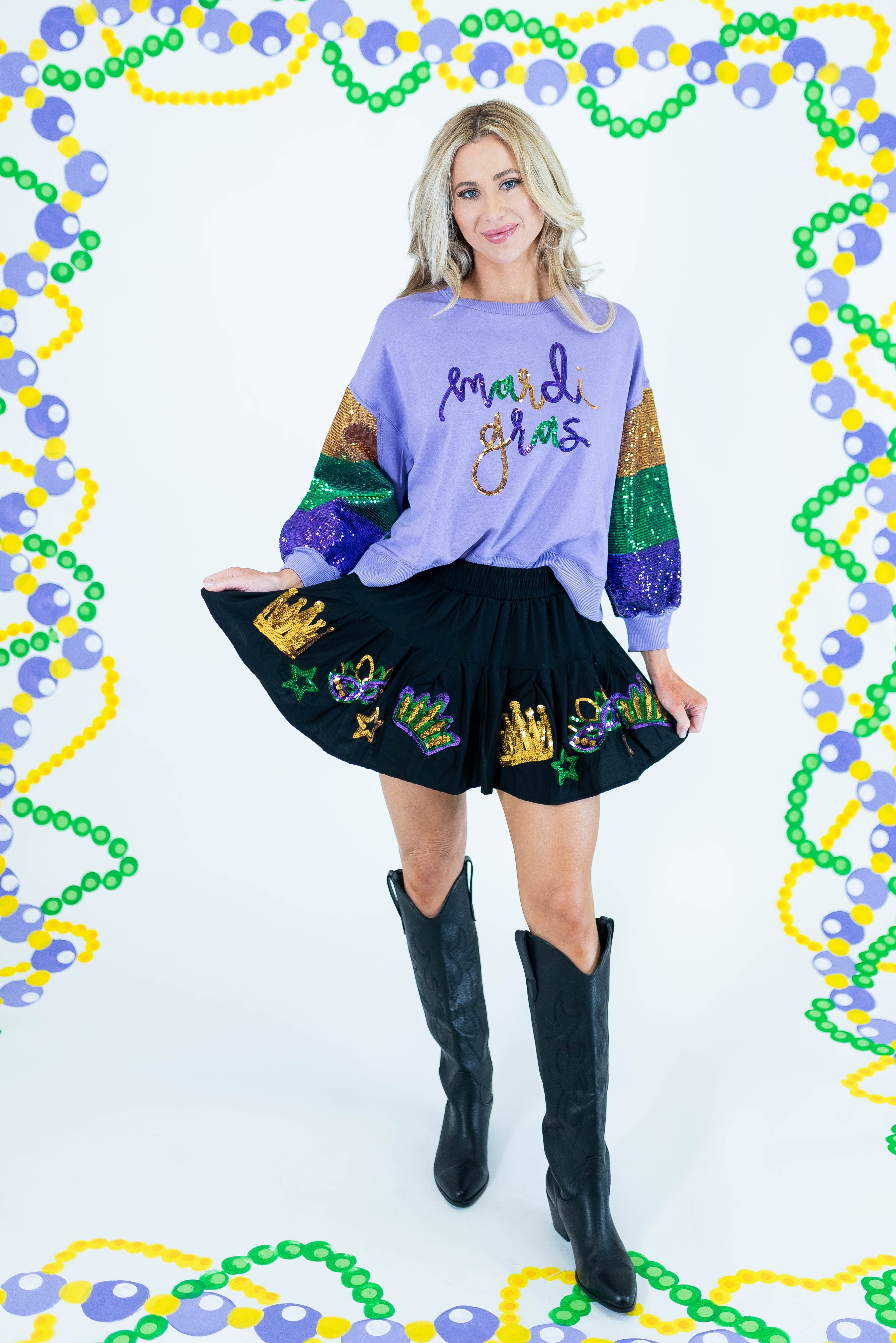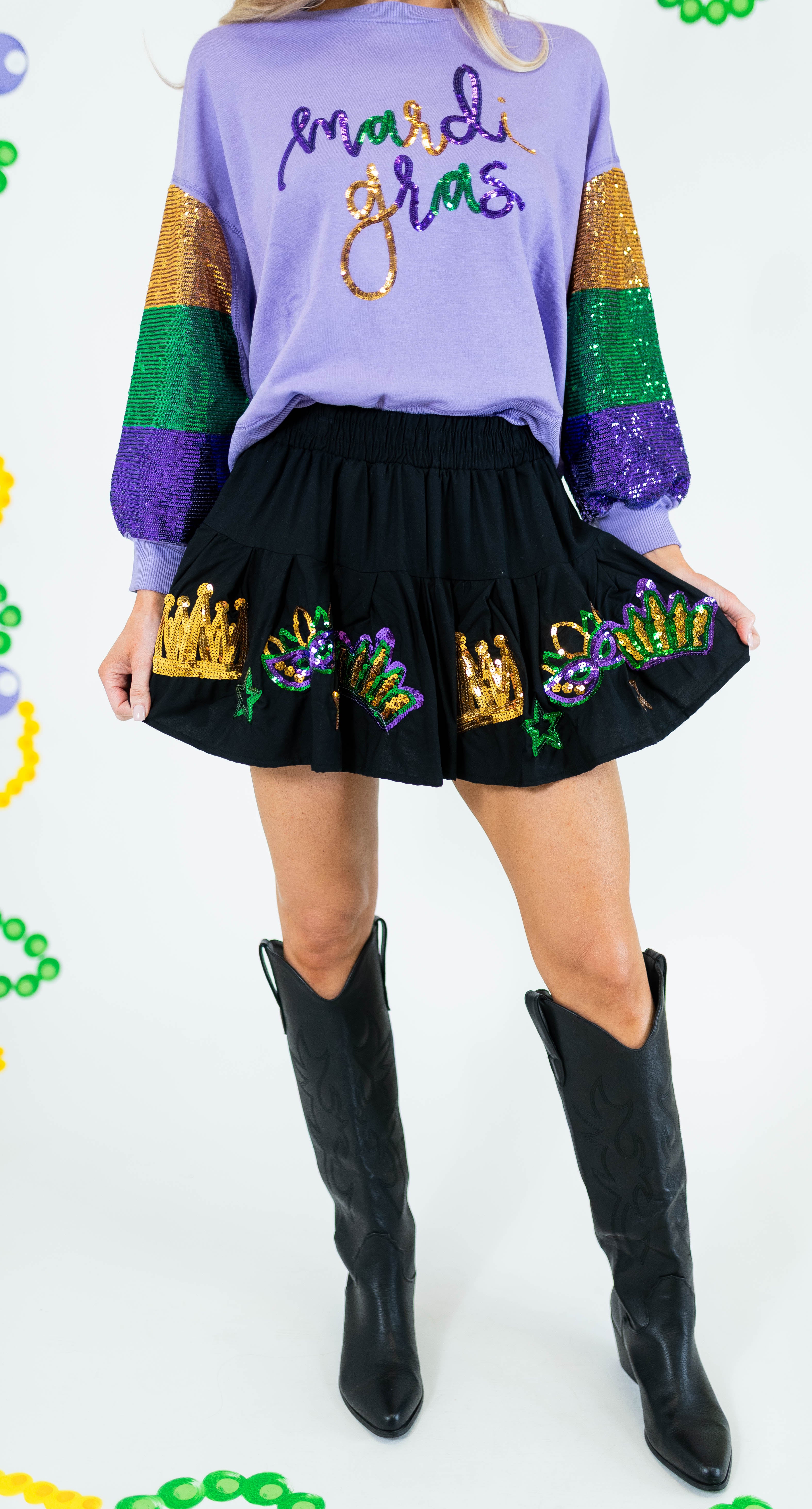 Get ready to take on the day in style with our Pleated Crown and Mask Skort in Black! This playful skort features a pleated design with shorts underneath for comfort, side pockets for convenience, and a sequin applique crown and masks on the bottom tier for a touch of whimsy. Perfect for any occasion, this skort is sure to make a statement!