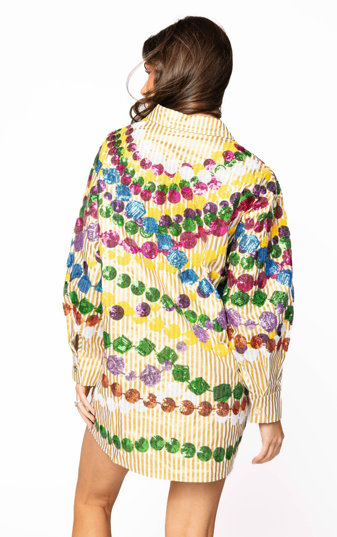 Elevate your Mardi Gras celebration with this stunning Queen Of Sparkles gold stripe mega bead button-up dress. Dazzling beadwork catches the light with every move, while the classic button-up silhouette offers timeless elegance and easy styling. The bold gold stripes add dimension and sophistication to this show-stopping piece. Perfect for parades, parties, or any festive occasion where you want to turn heads and embrace the spirit of the season. Make a statement in a dress designed for those who refuse to blend in.