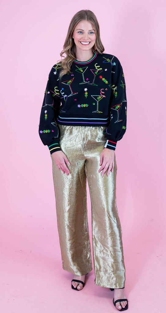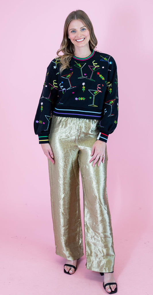 Ring in the new year with unmatched glamour in this Queen Of Sparkles Multi Rainbow Martini Sweatshirt. Featuring a striking black base adorned with vibrant rainbow martini graphics, this piece effortlessly blends playful sophistication with festive flair. Perfect for celebrating in style, whether you're hosting a party or making a statement at midnight. The eye-catching design captures the spirit of celebration while the cozy sweatshirt construction keeps you comfortable all night long. Make this your go-to choice for holiday gatherings and New Year's Eve moments that demand a touch of sparkle and personality.
