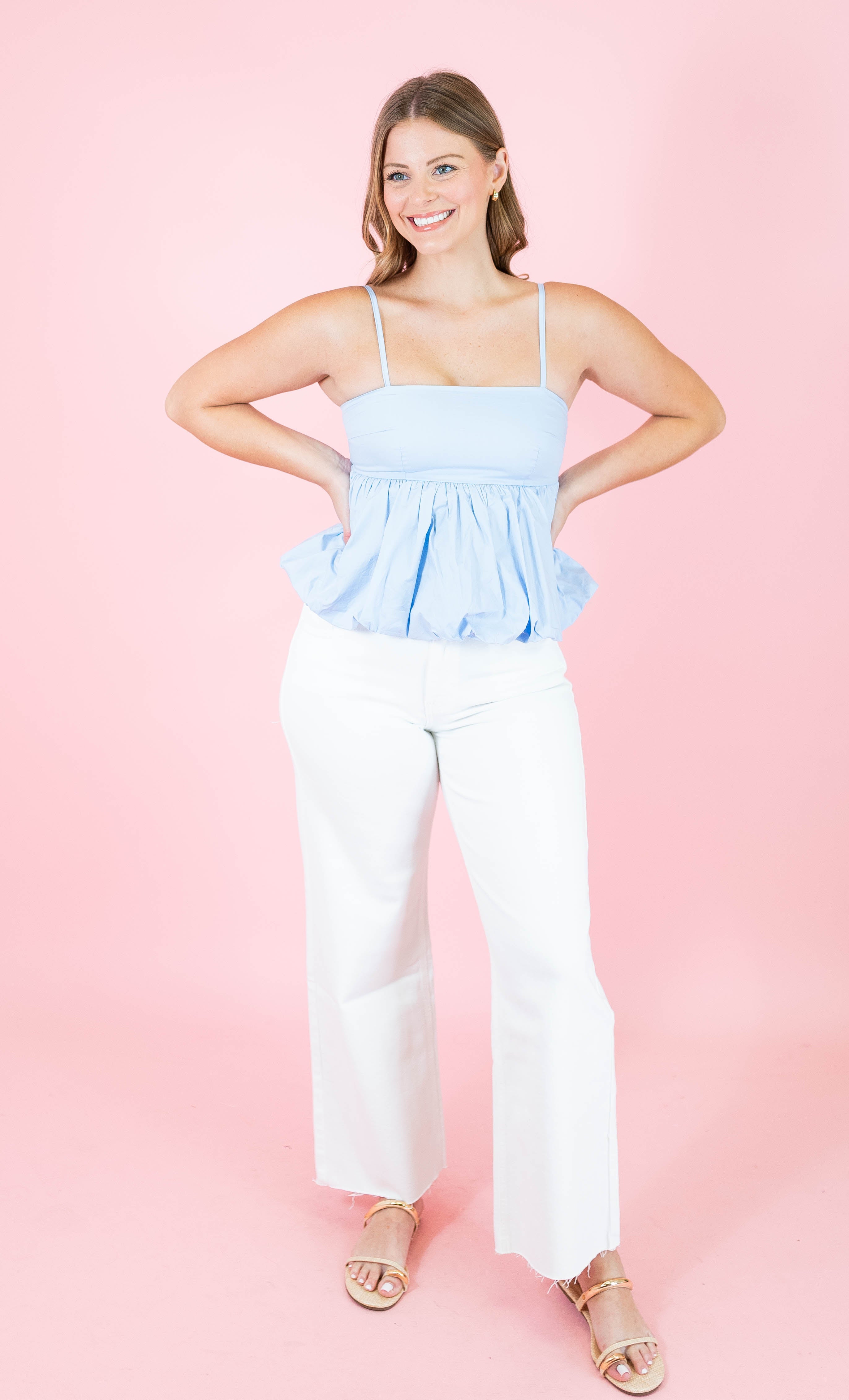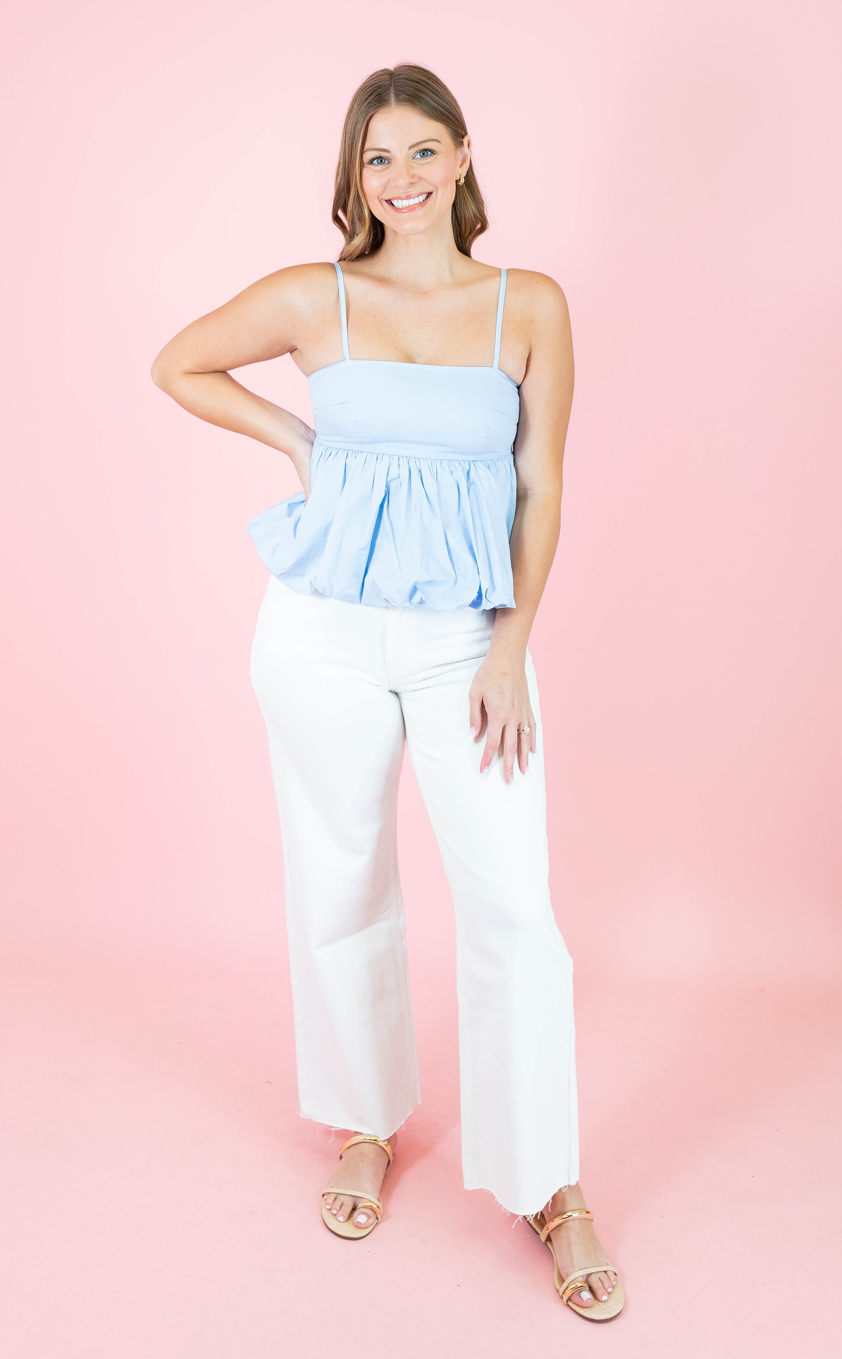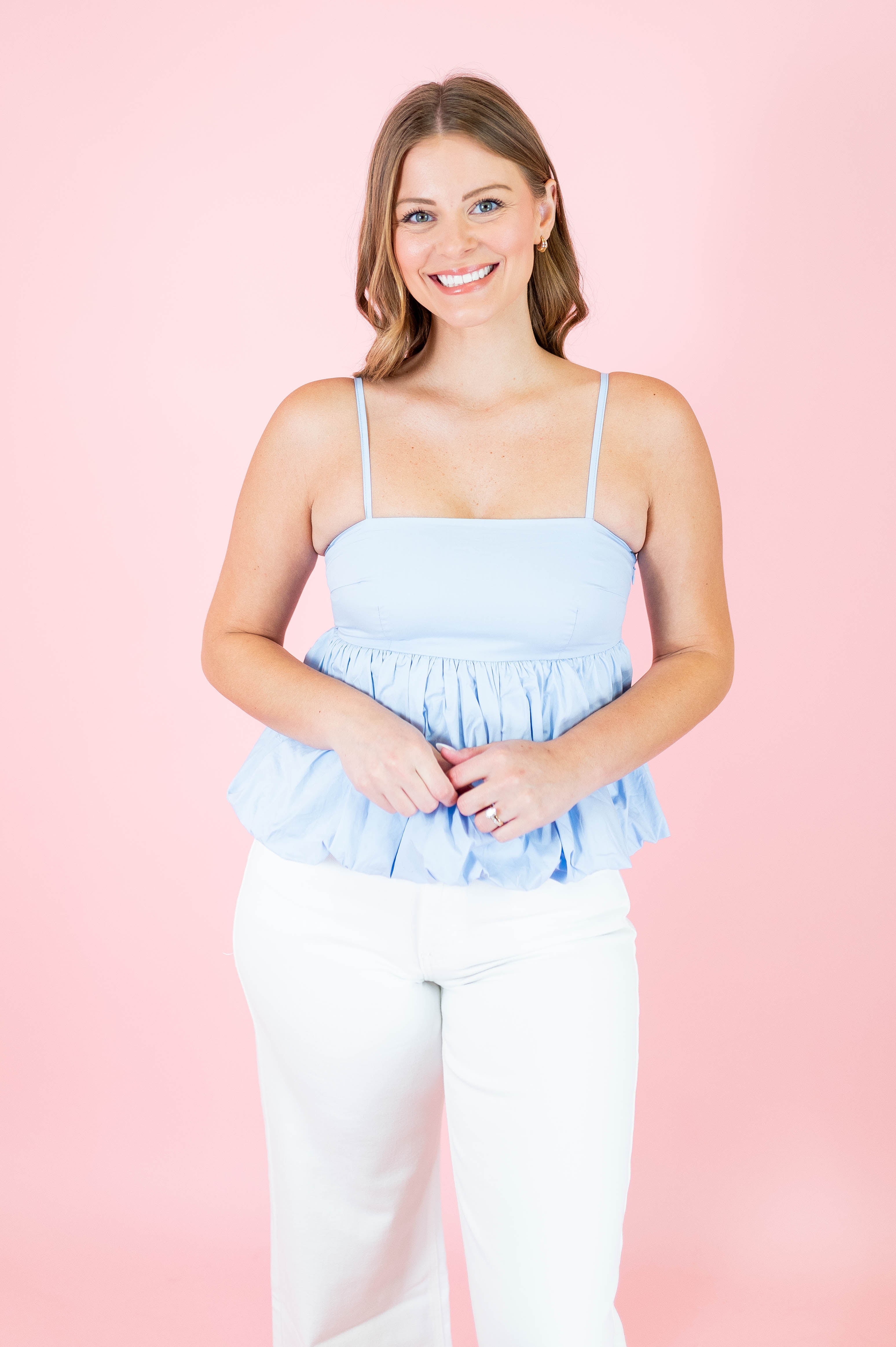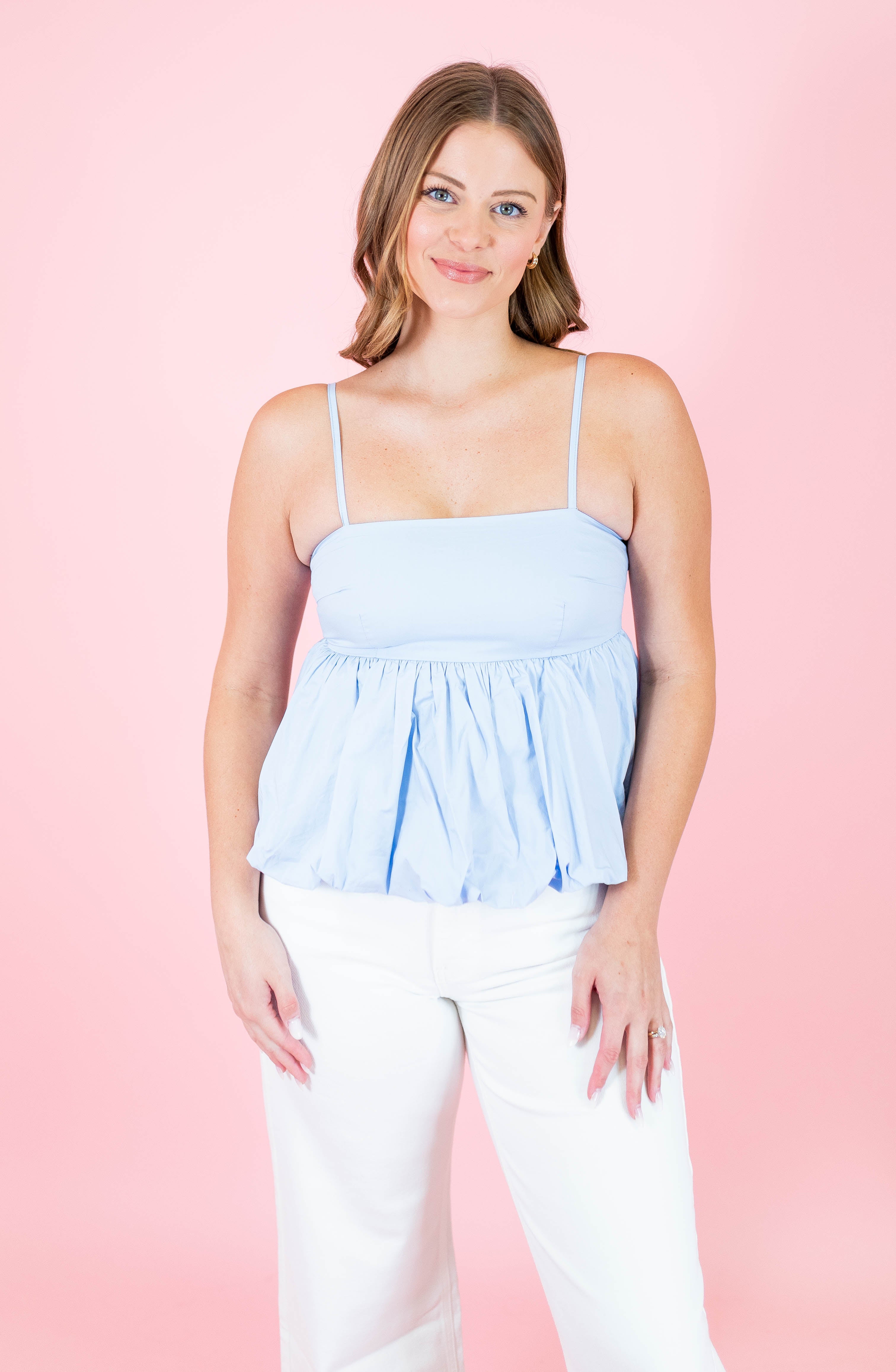 Effortless elegance meets playful style with this sleeveless empire waist balloon top. Featuring adjustable spaghetti straps and a flattering square neckline, it's designed for comfort and movement. The bubble hem adds a charming touch, while the convenient side zipper makes dressing easy. Crafted from 100% cotton and fully lined for a non-sheer finish, this versatile piece transitions seamlessly from day to night. Available in soft pink and light blue.