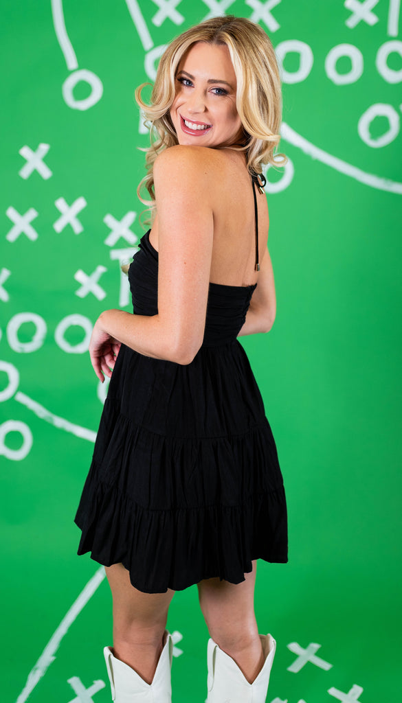 Bright, fresh, and full of charm, The Black Twist Halter Dress is the perfect pick for sunny days and spirited game days. Featuring a versatile tie halter neck that can be worn regular or crisscrossed, this mini dress offers multiple styling options. The ruched top adds a flattering touch, while the tiered, flowy fit keeps it comfortable and effortlessly chic. Pair it with sneakers or sandals for a breezy game day look that stands out in the crowd.