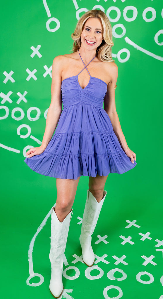 Bright, fresh, and full of charm, The Misty Purple Twist Halter Dress is the perfect pick for sunny days and spirited game days. Featuring a versatile tie halter neck that can be worn regular or crisscrossed, this mini dress offers multiple styling options. The ruched top adds a flattering touch, while the tiered, flowy fit keeps it comfortable and effortlessly chic. Pair it with sneakers or sandals for a breezy game day look that stands out in the crowd.
