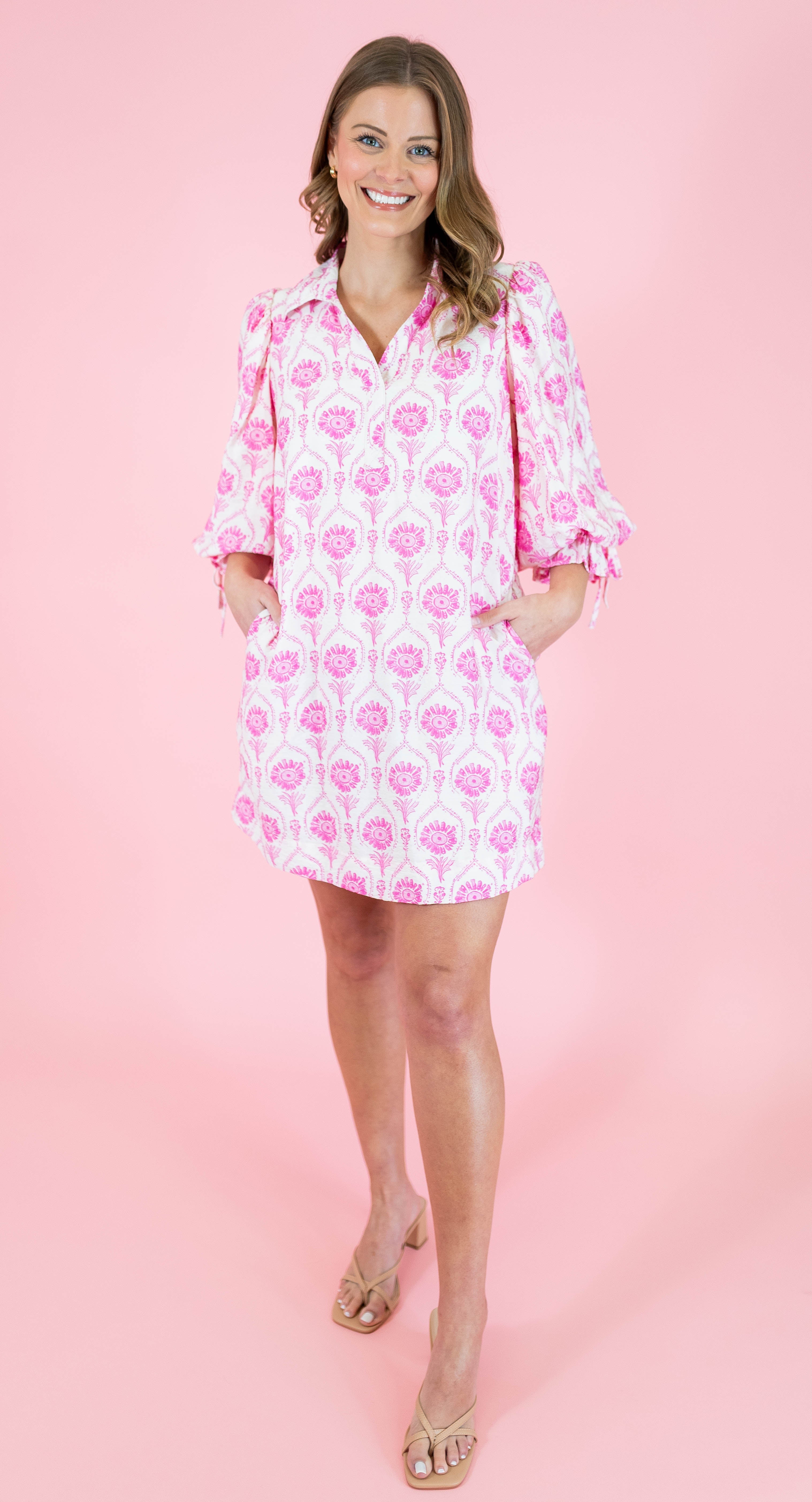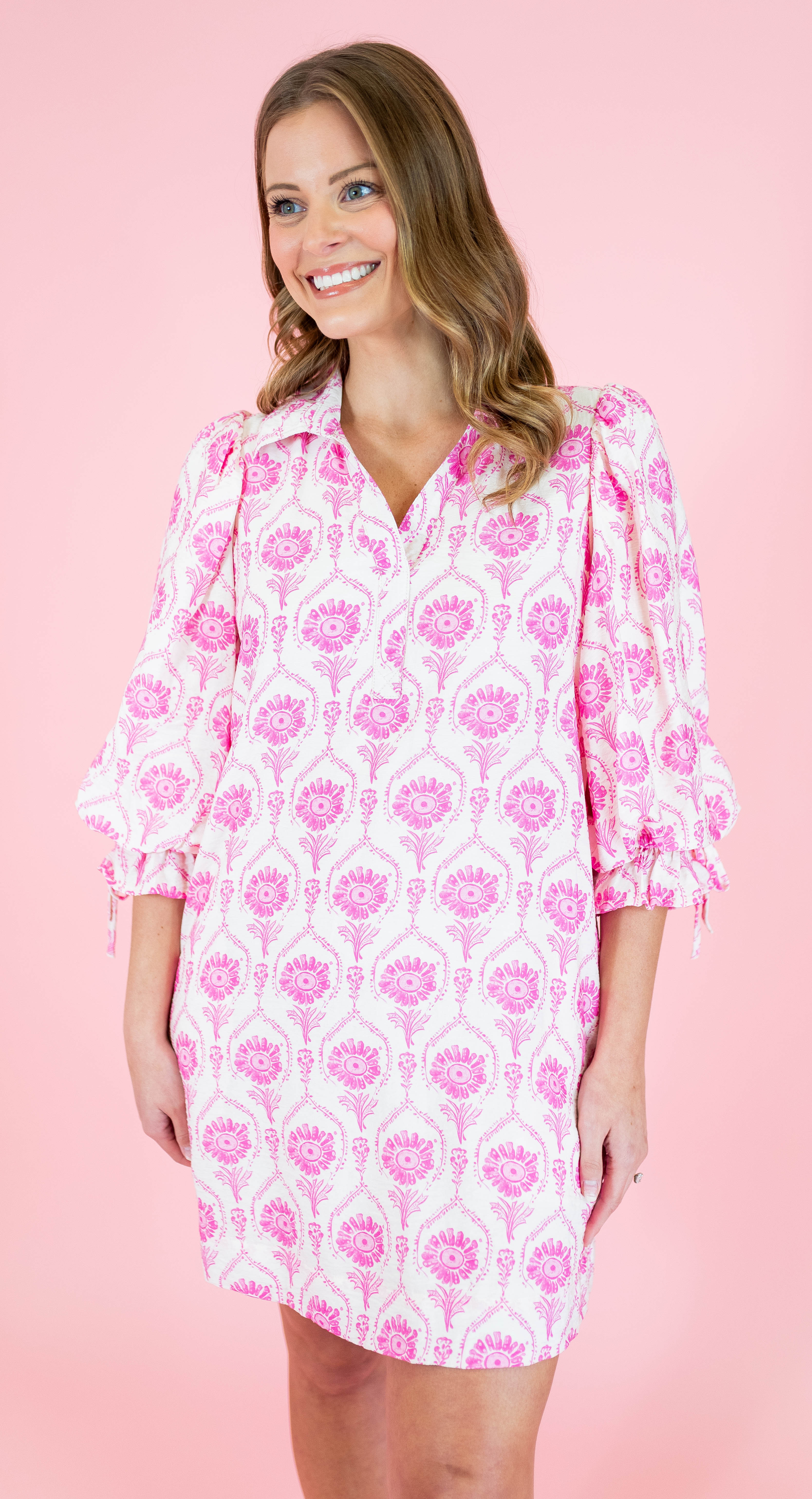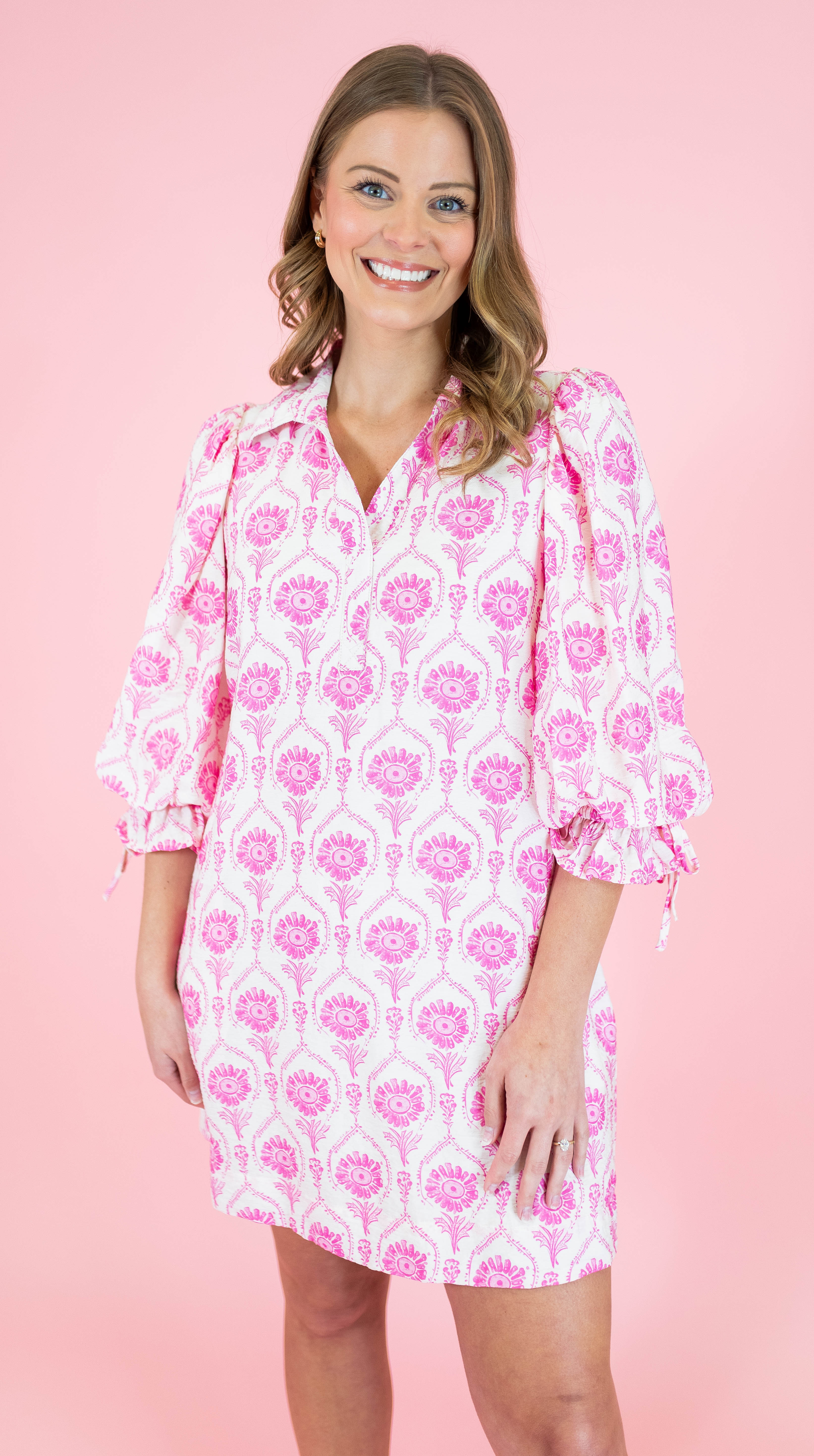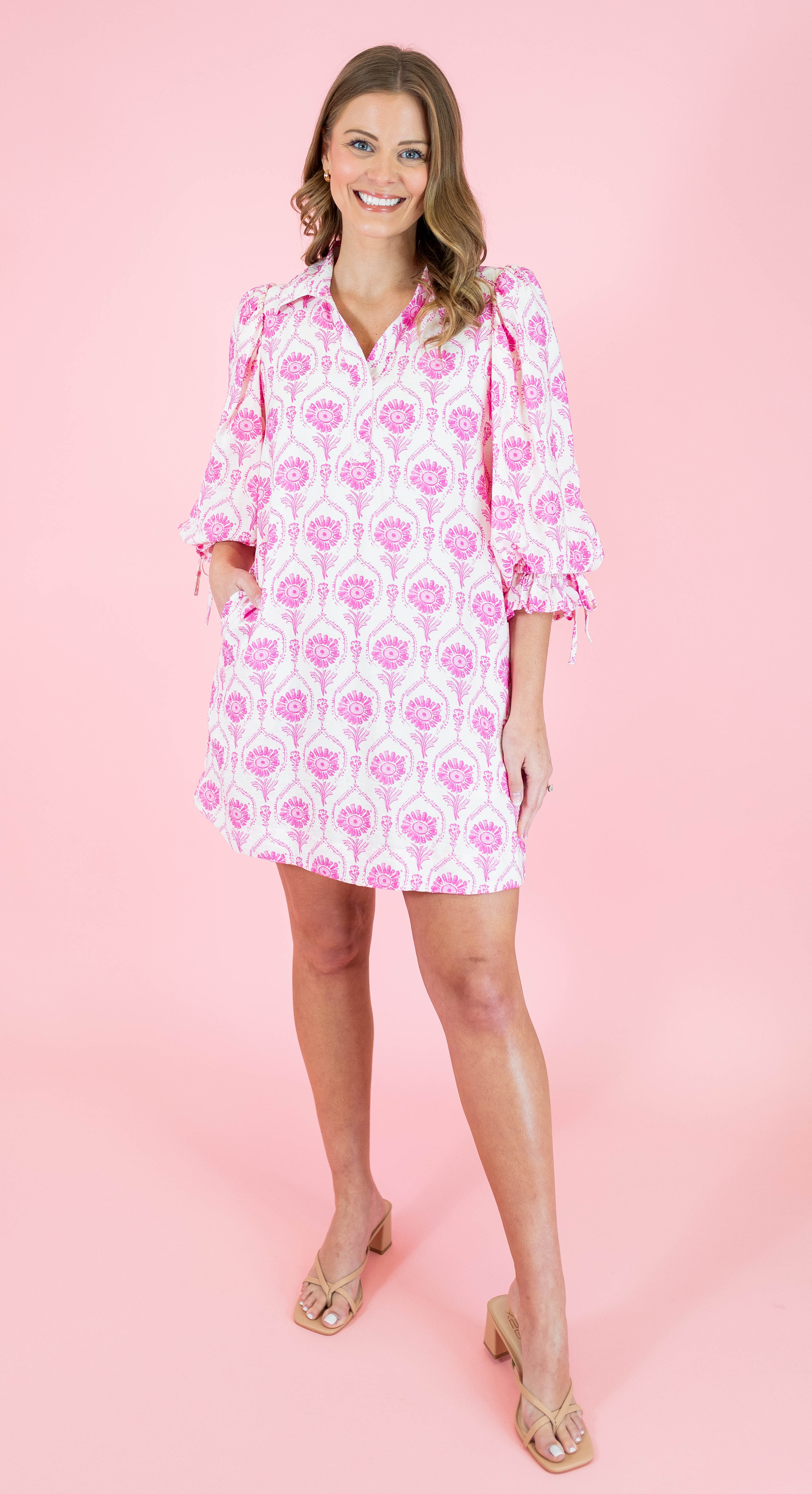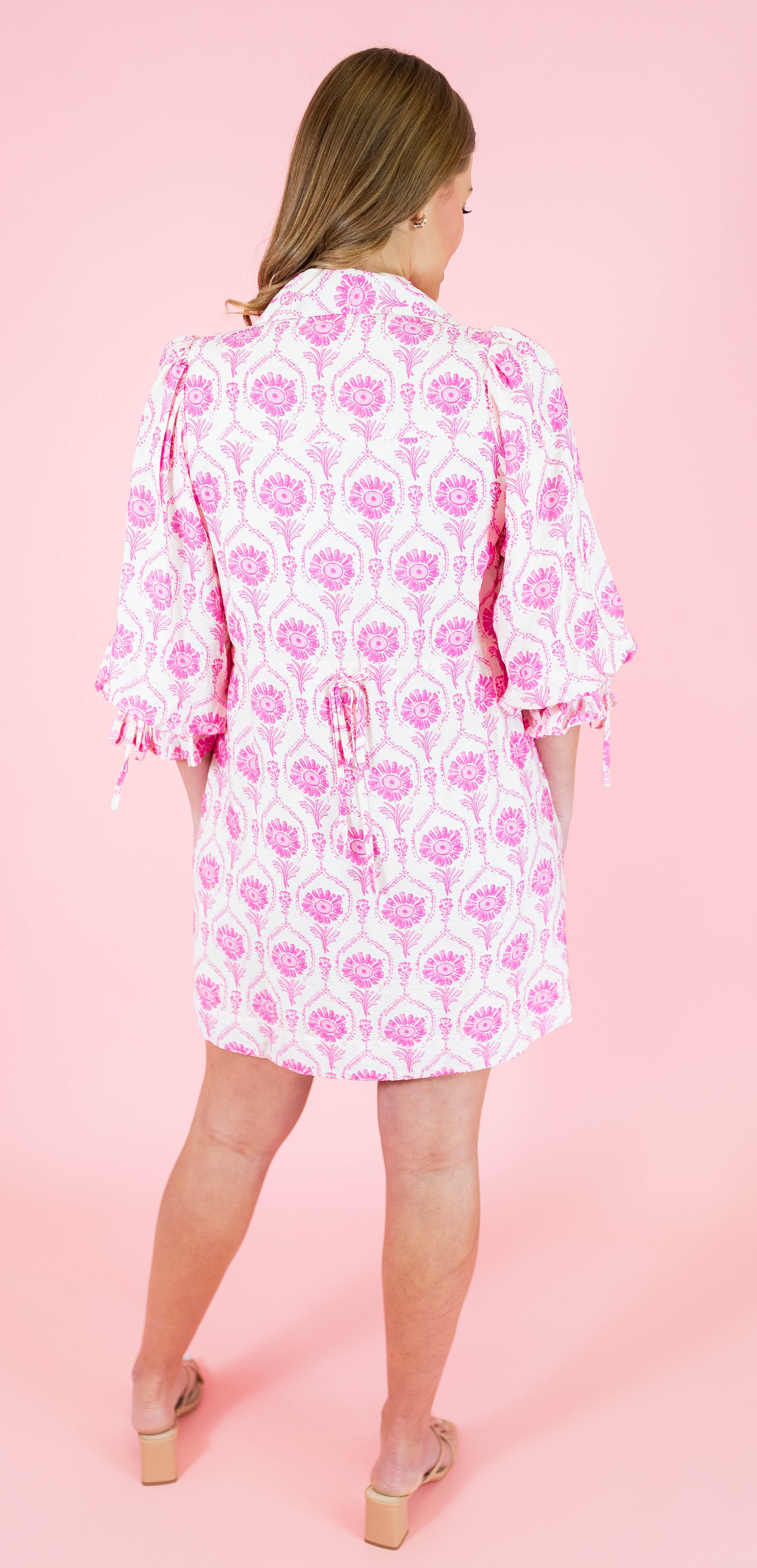 Embrace effortless elegance with The Pink Paradise Dress, a charming floral mini featuring a flattering V-neck collar and three-quarter sleeves. The drawstring back waist adds a playful touch, allowing you to customize the fit for a personalized silhouette. Perfect for casual outings, garden parties, or any occasion calling for romantic, feminine style. This versatile piece transitions seamlessly from day to night.