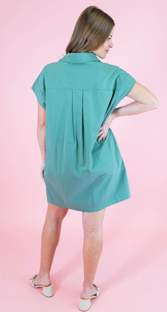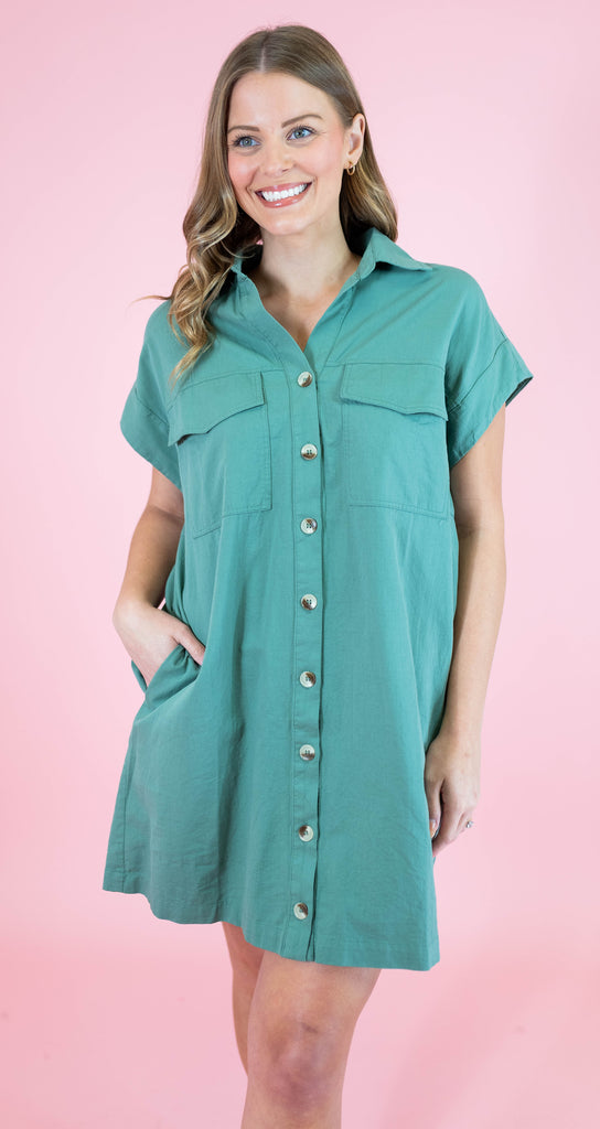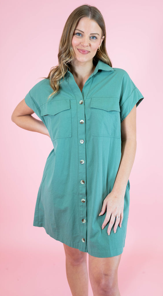 Effortless style meets everyday comfort in this versatile utility dress. Crafted from soft, breathable cotton, it features a classic button-down front, crisp collar, and practical bust and side pockets—perfect for hands-free convenience. The relaxed fit and short sleeves make it ideal for layering through seasons, while the dusty green hue complements any wardrobe. Whether you're running errands or transitioning from day to night, this airy mini dress delivers casual sophistication without compromise.