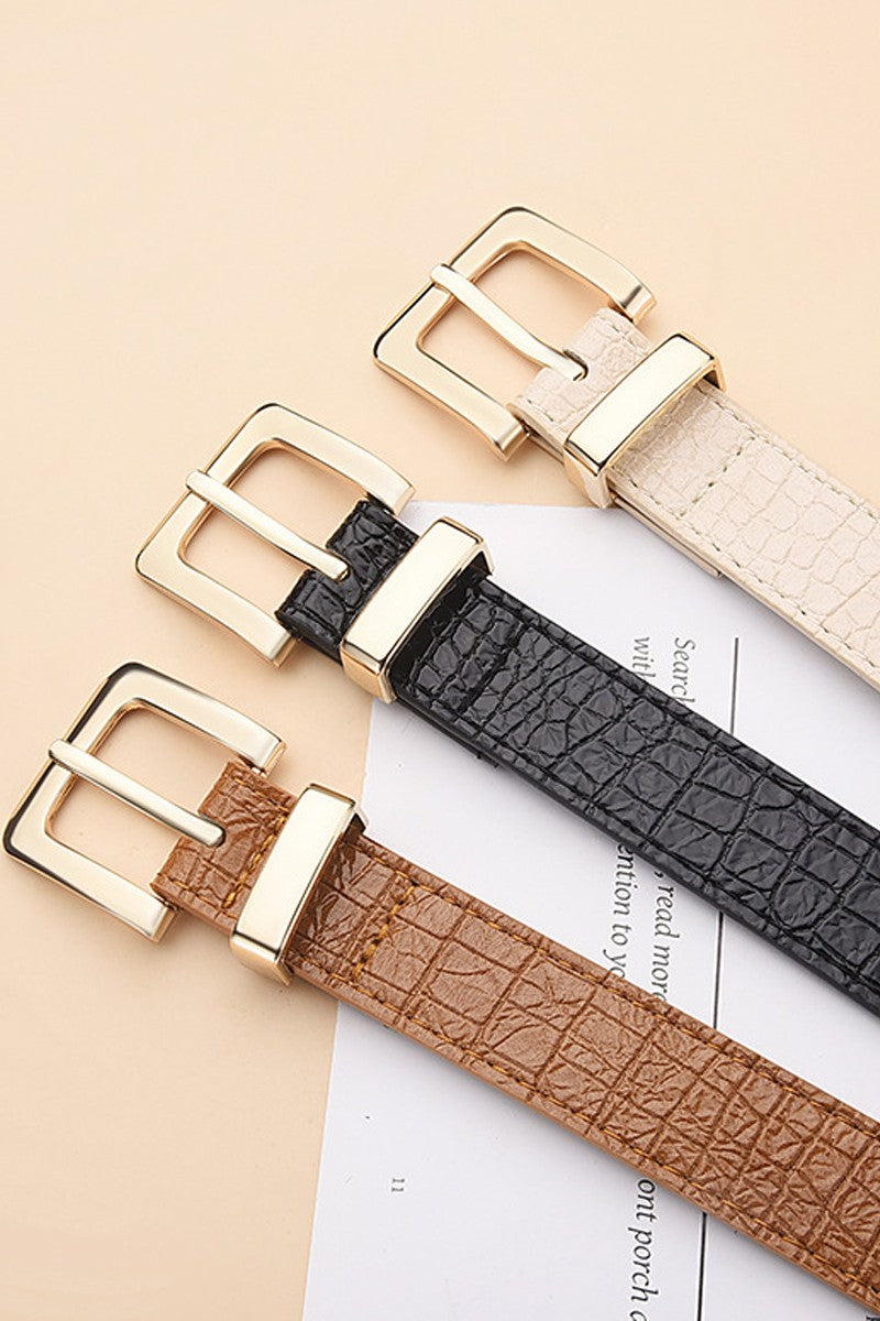 Elevate your everyday look with this statement-making fashion belt featuring a bold crocodile pattern print. Available in versatile black, warm camel, and luxe gold, it pairs effortlessly with dresses, jeans, or tailored pieces. The squared belt buckle adds a modern edge and keeps everything secure in style. Whether you're dressing up for an event or adding polish to casual wear, this belt is the perfect finishing touch that works as hard as you do.