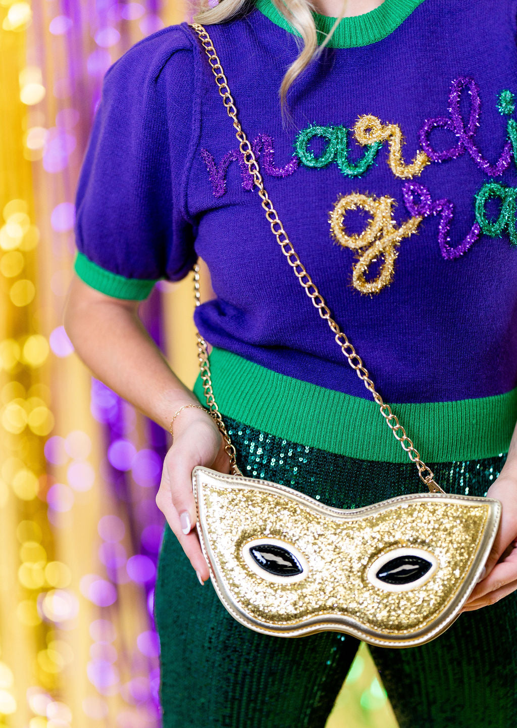 How cute is this Mardi Gras Mask Crossbody? Perfect for all of your Mardi Gras balls, parades and parties. This can fit a large iPhone, small wallet, lipstick and face glitter:)