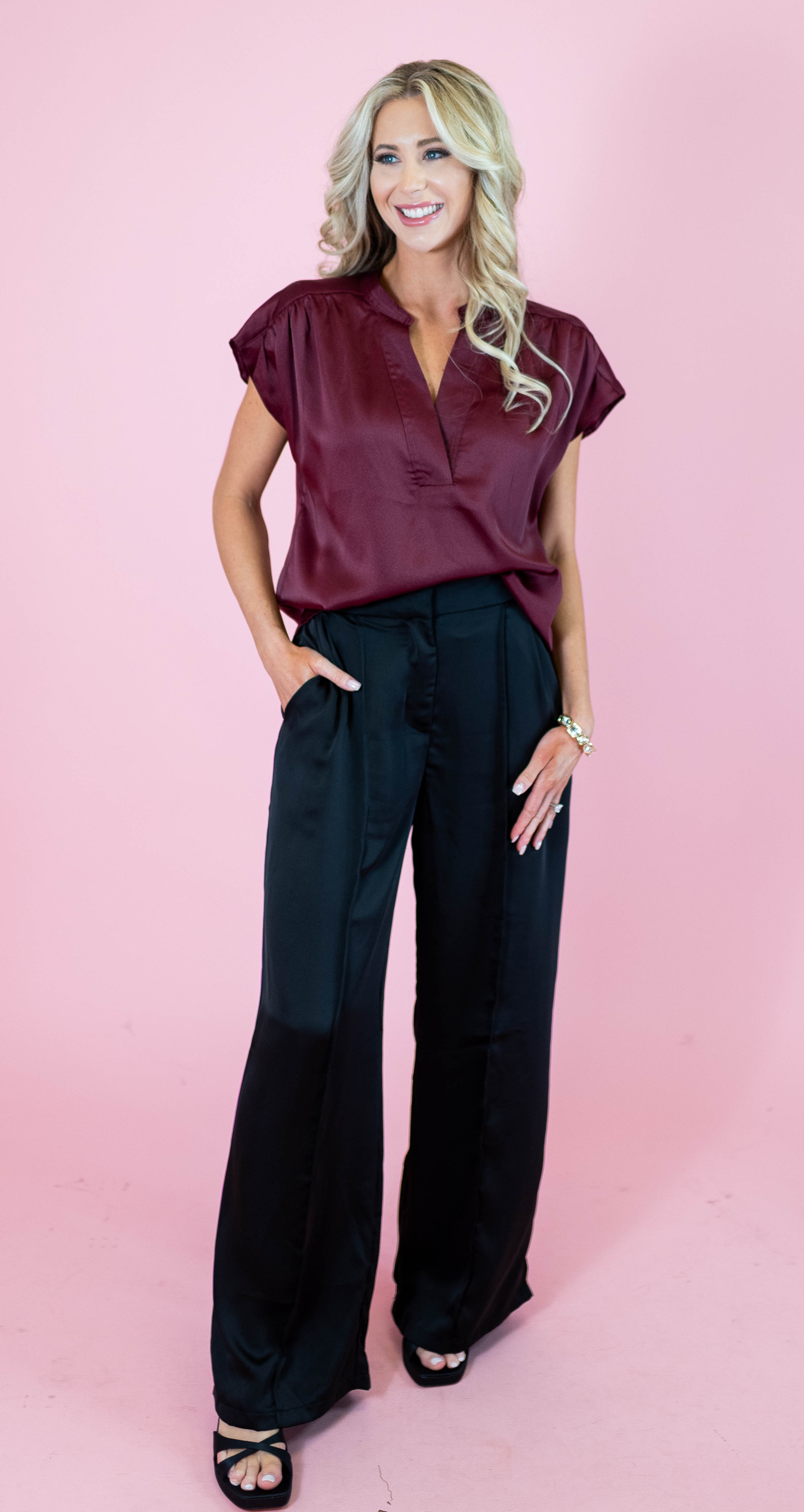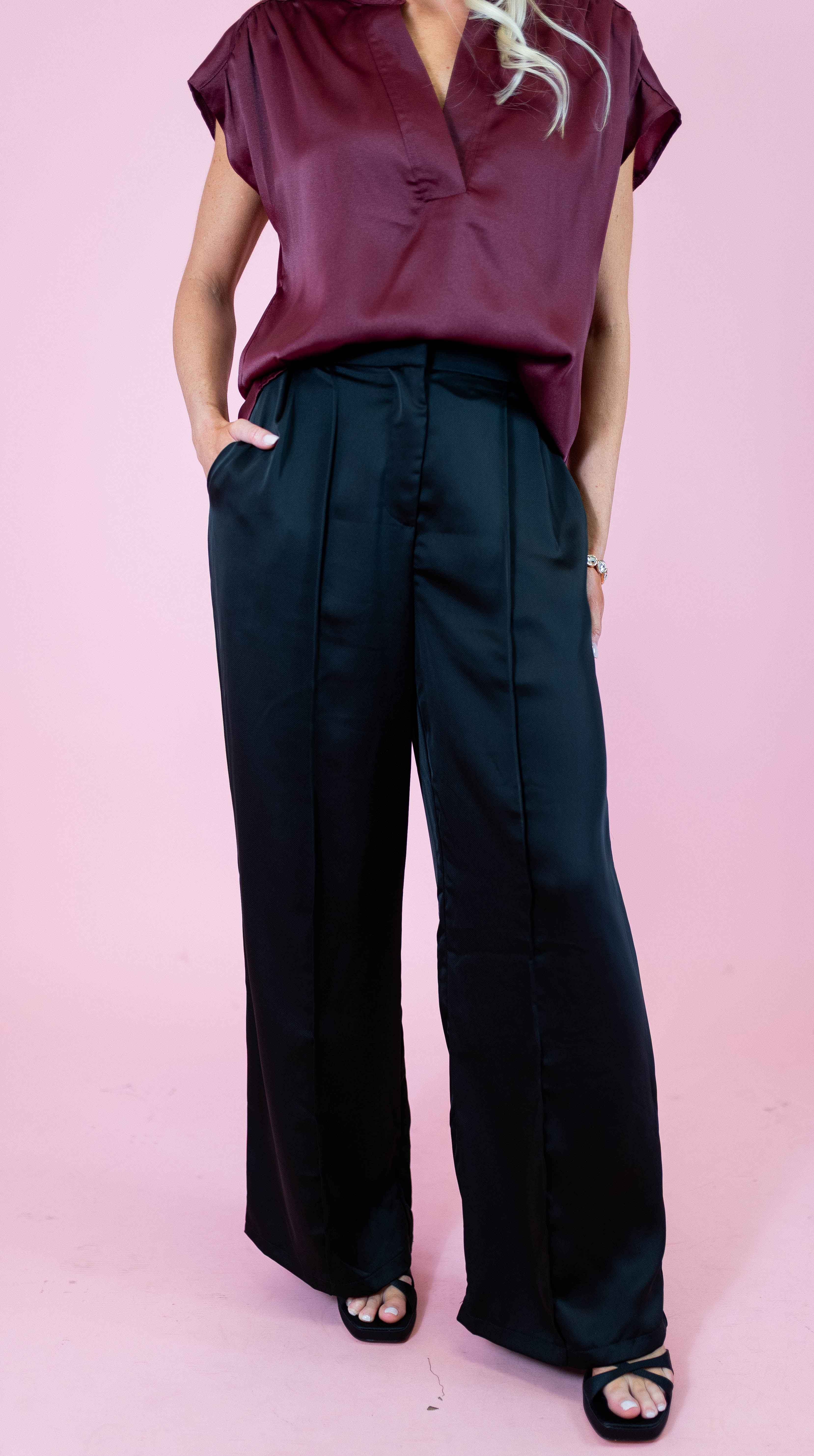 Elevate your style with these High Rise Satin Pleated Pants in classic black. Crafted from smooth satin, they offer a sophisticated sheen that’s perfect for dressy occasions. The high-rise design flatters your waist, while the expertly pleated front adds elegant detail and a tailored silhouette. Versatile and chic, these pants effortlessly blend comfort with luxe style, making them a must-have for your refined wardrobe.