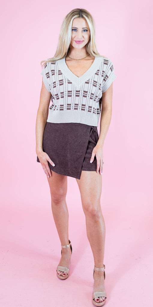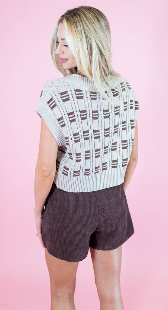 Elevate your layering game with this striking patterned motif V-neck cropped knit vest. The warm oatmeal and cocoa colorway creates a sophisticated, versatile piece that pairs effortlessly with jeans or skorts. The cropped silhouette flatters your frame while the textured knit adds visual interest and dimension. Perfect for transitional seasons or year-round styling, this vest brings an instant polish to casual and dressed-up looks alike. A wardrobe essential that works as hard as you do.