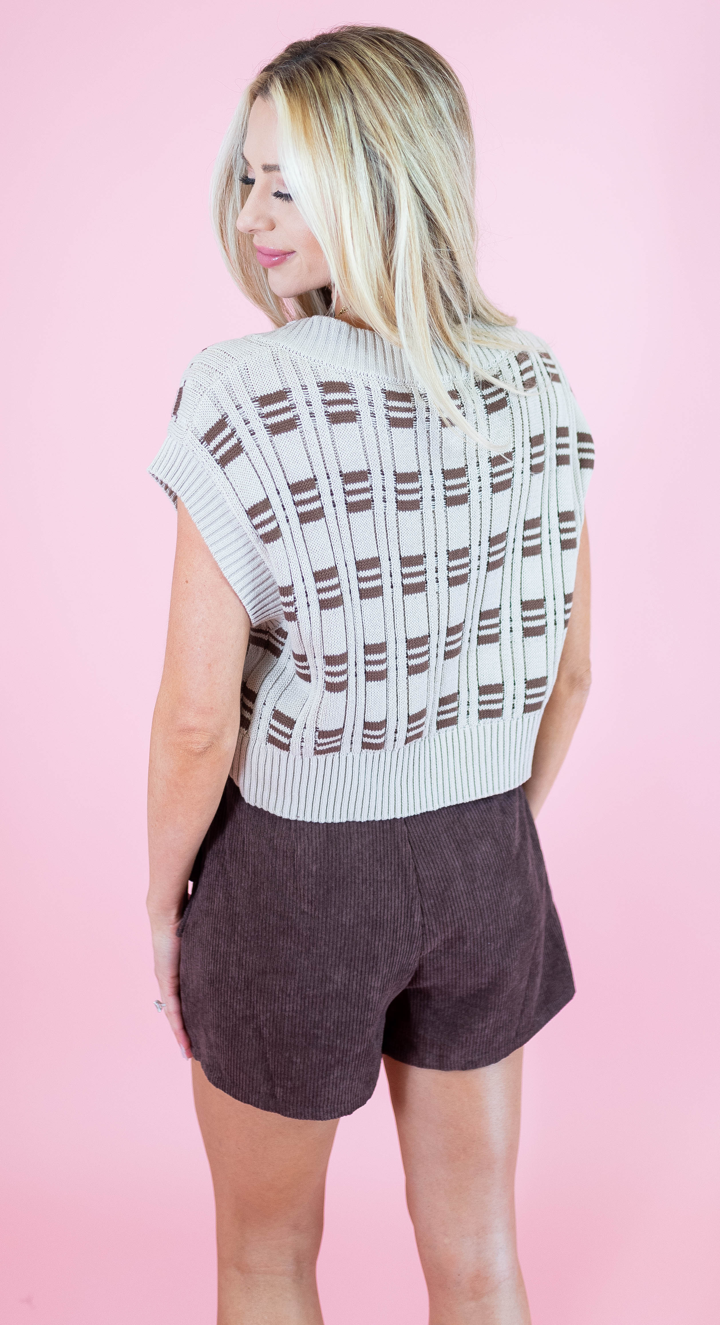 Patterned Motif V-Neck Cropped Knit Vest - Oatmeal/Cocoa