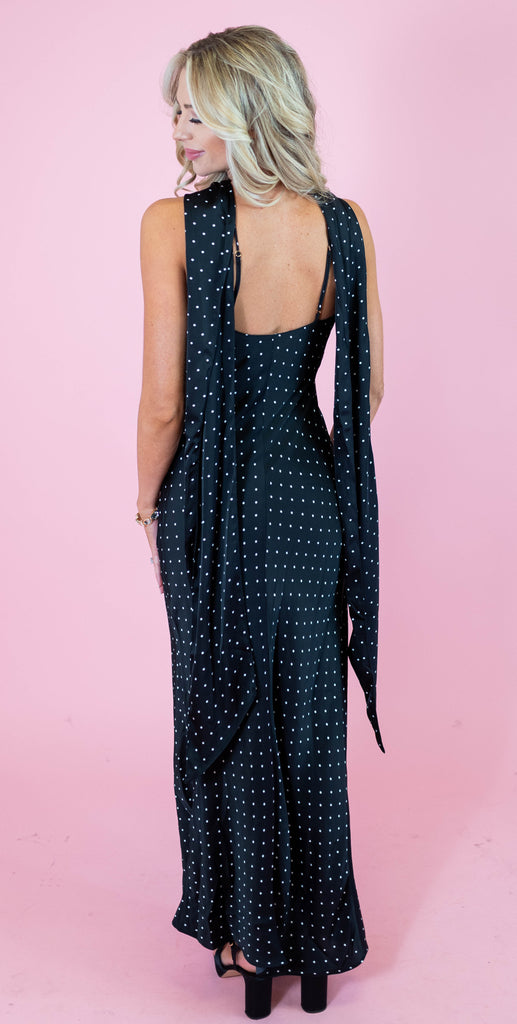 Romance meets modern elegance in this striking halter gown. Crafted in a sleek black satin with delicate ivory polka dots, it flatters with its body-skimming silhouette and eye-catching criss-cross neckline.